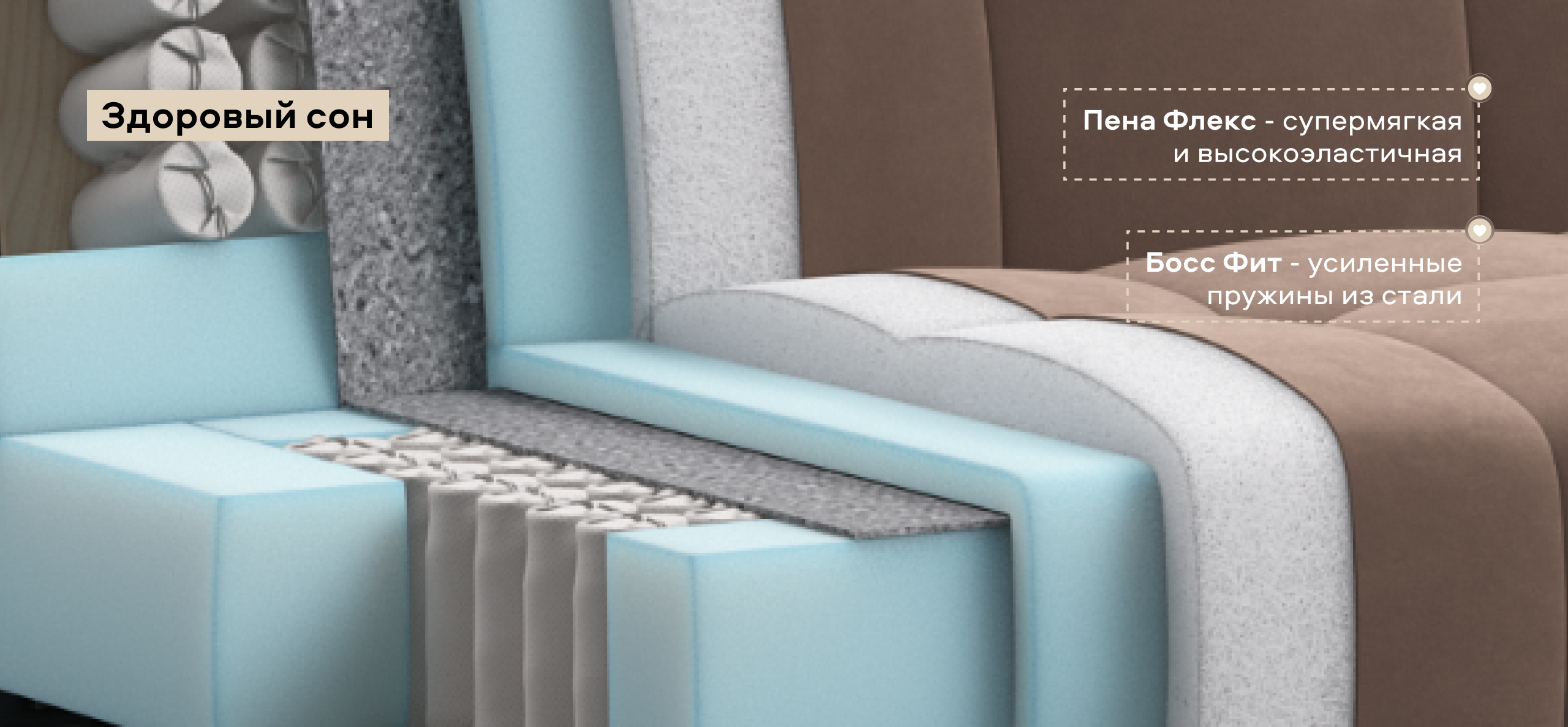 Инновационный анатомический матрас в диване, высотой 15 см., выполнен из полноценного независимого пружинного блока Босс Фит и высокоэластичной пены Флекс – гарантия здорового сна, как на кровати!