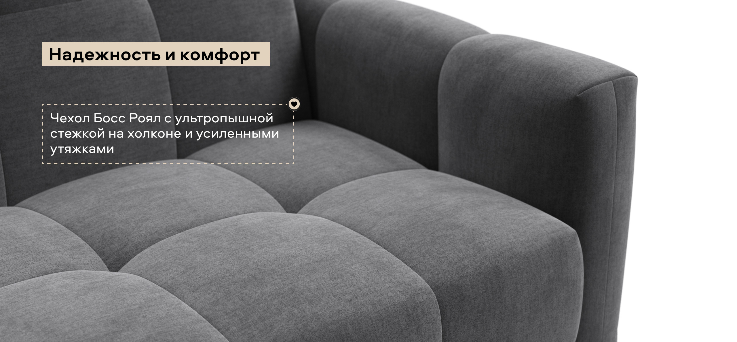 Чехол Босс Роял с ультропышной стежкой на холконе и усиленными утяжками делает диван пышным и воздушным, а усиленные утяжки надежно фиксируют чехол и защищают его от растяжения.