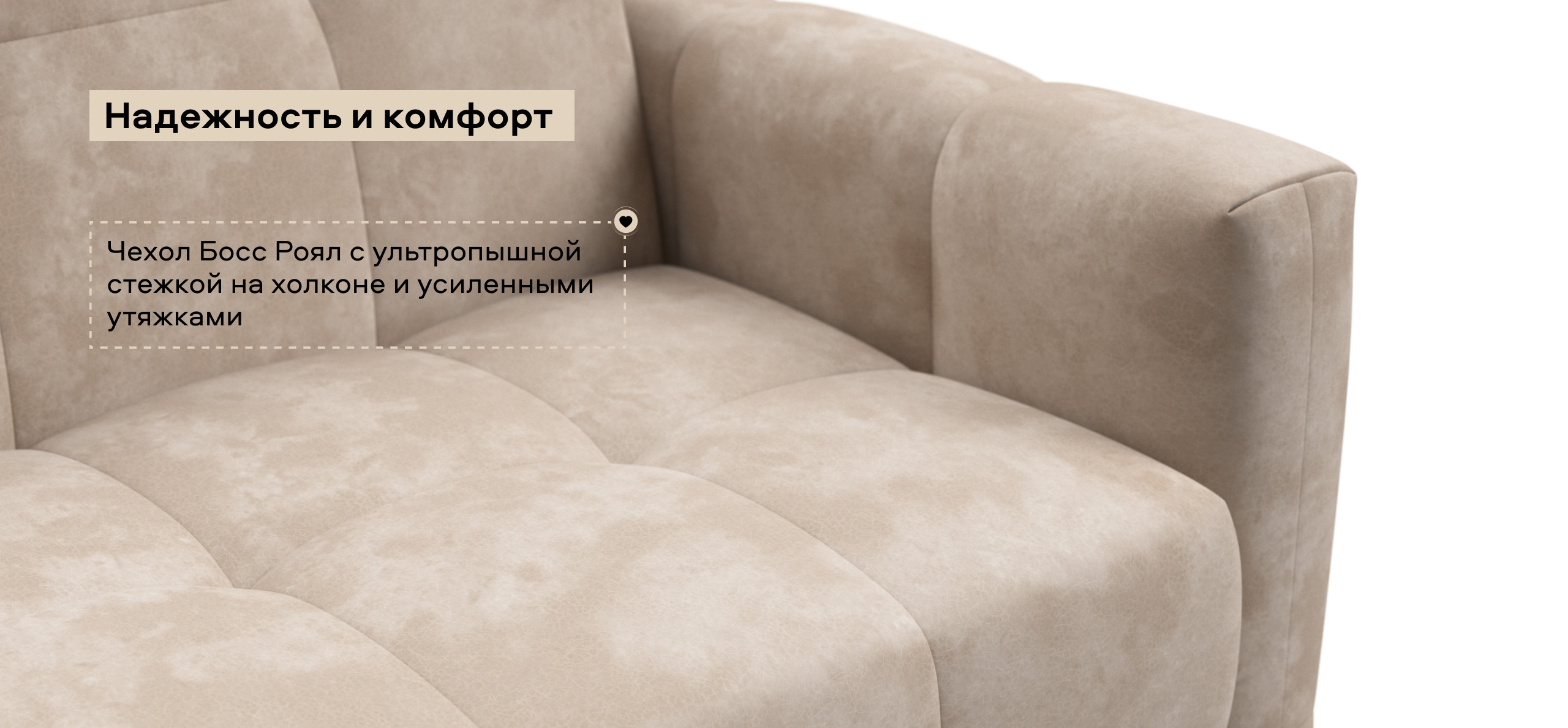 Чехол Босс Роял с ультропышной стежкой на холконе и усиленными утяжками делает диван пышным и воздушным, а усиленные утяжки надежно фиксируют чехол и защищают его от растяжения.