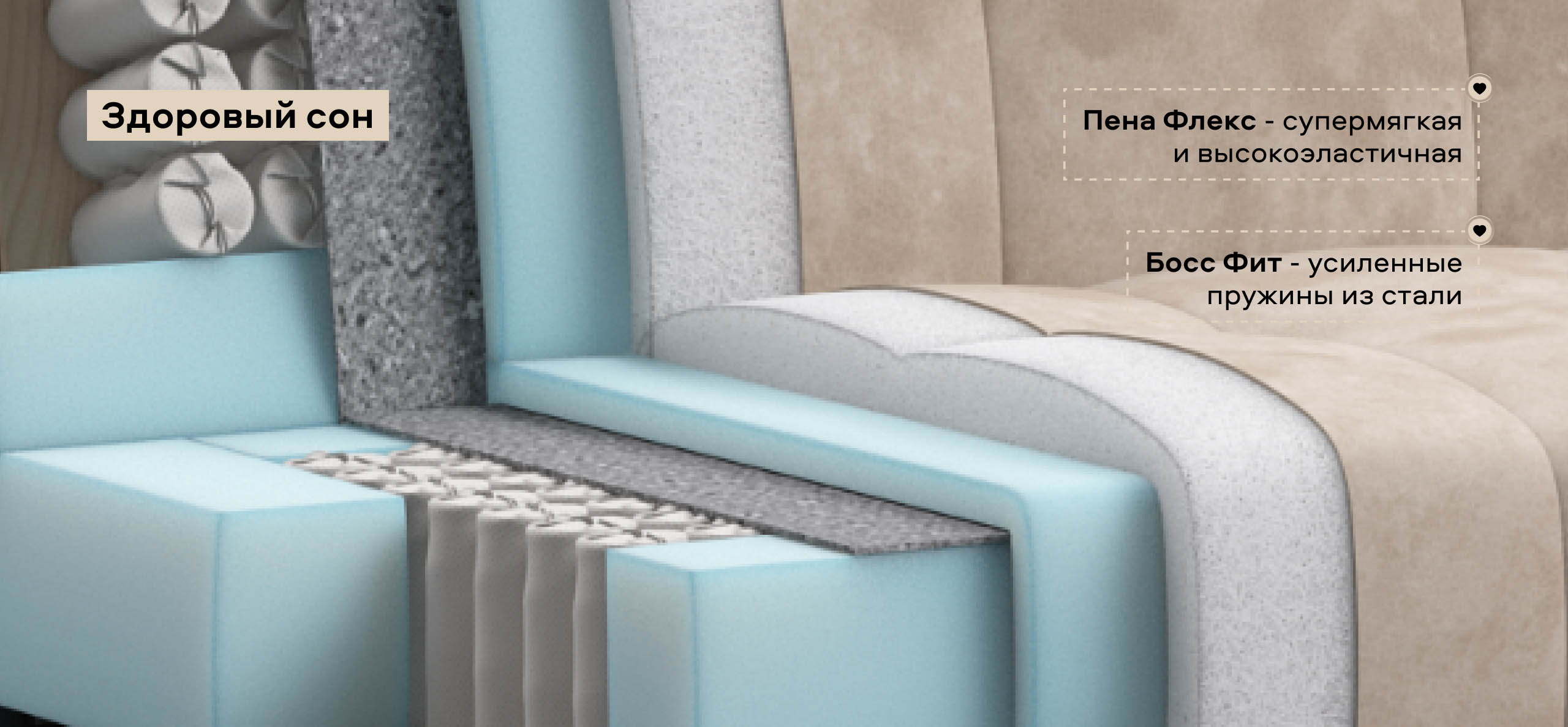 Инновационный анатомический матрас в диване, высотой 15 см., выполнен из полноценного независимого пружинного блока Босс Фит и высокоэластичной пены Флекс – гарантия здорового сна, как на кровати!