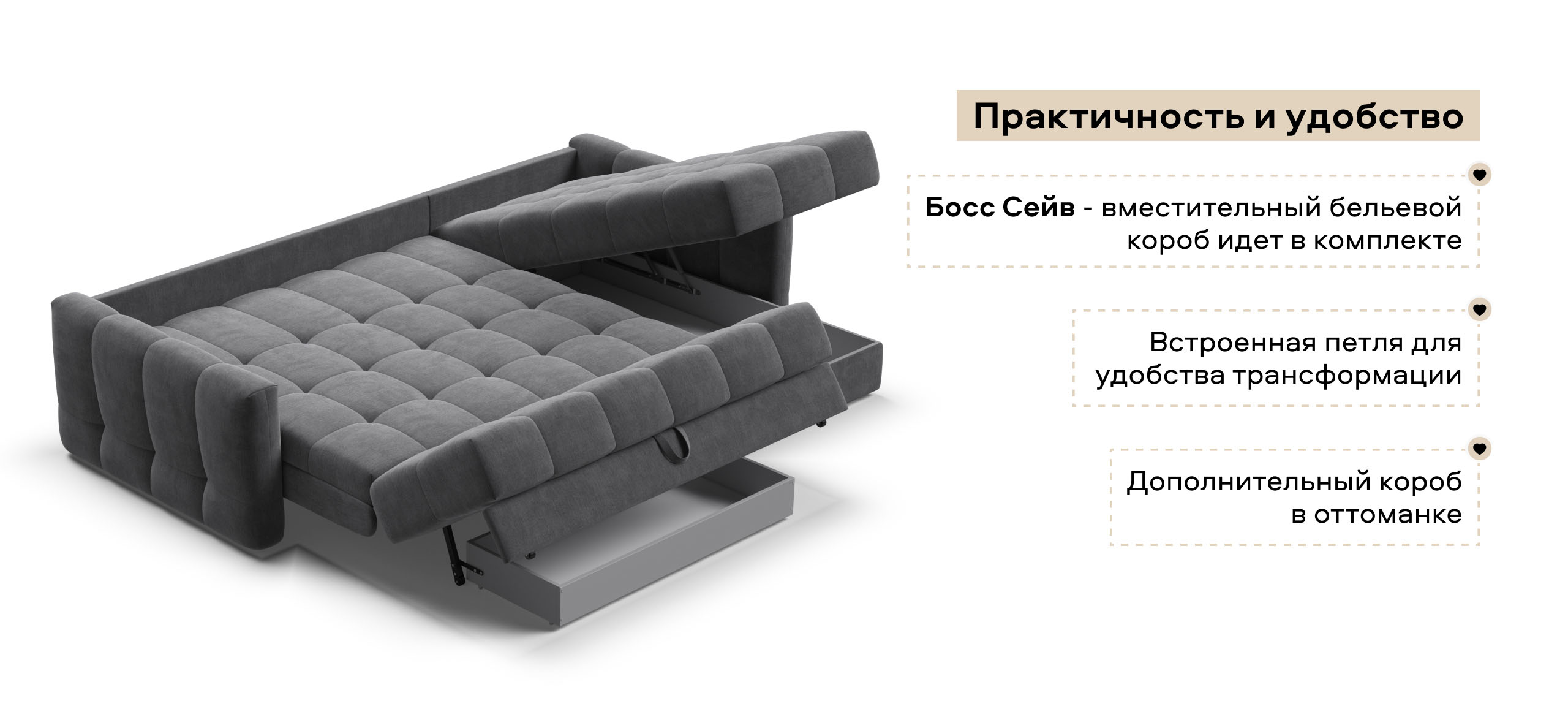 В комплекте с диваном идет бельевой короб Босс Сейв и не нужно за него доплачивать, а также дополнительный короб в оттоманке!