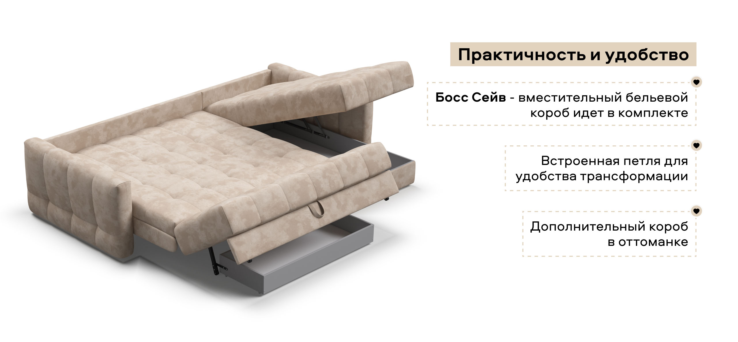 В комплекте с диваном идет бельевой короб Босс Сейв и не нужно за него доплачивать, а также дополнительный короб в оттоманке!