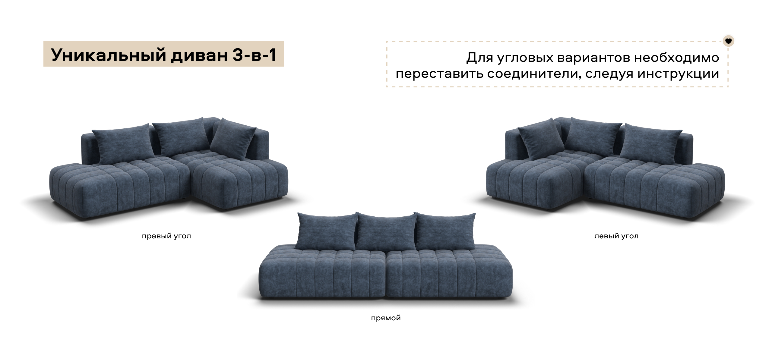 Универсальный дизайн 3-в-1 позволяет быстро менять его форму — левый угол, правый угол и прямой — всё для Вашего комфорта.