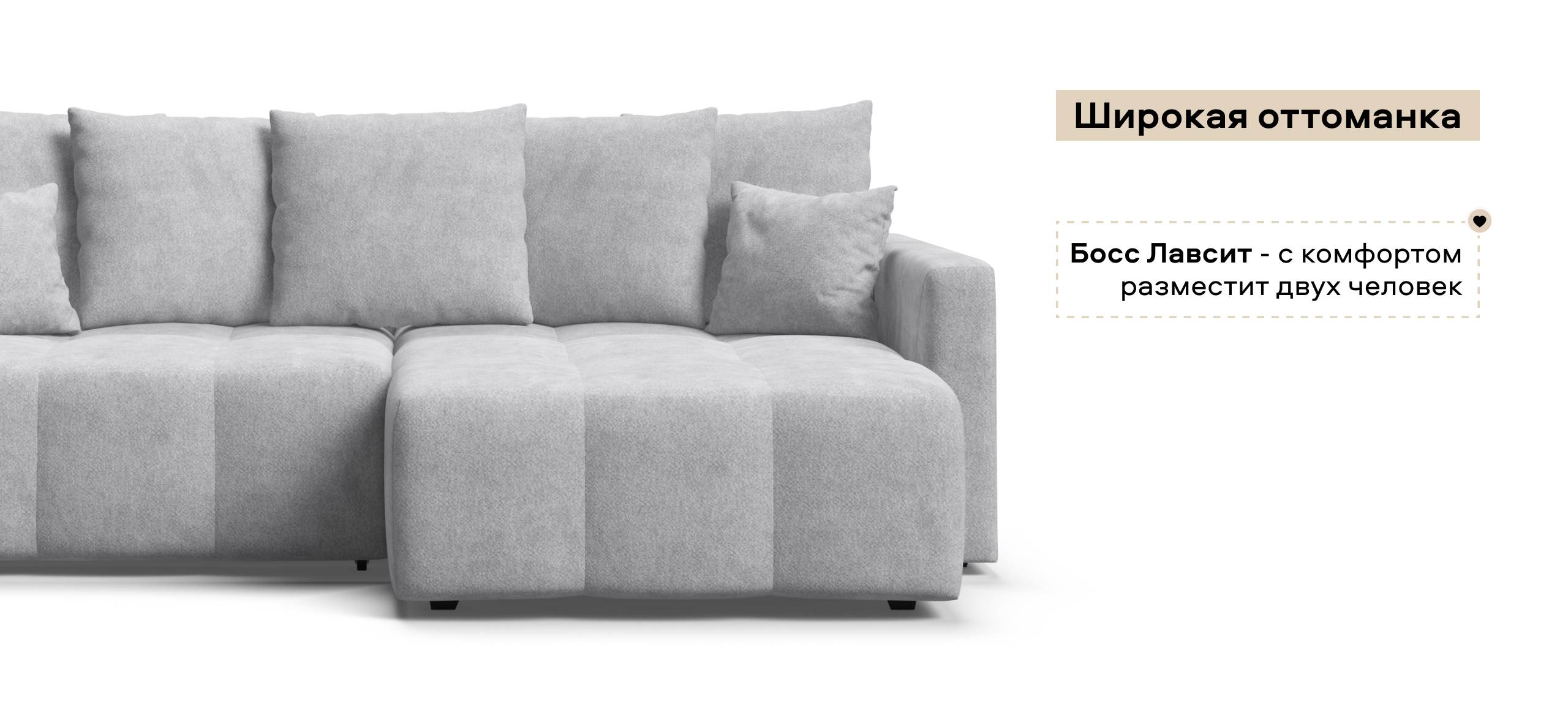 Широкая оттоманка Босс Лавсит - с комфортом разместит двух человек. Независимый пружинный блок в основании и  механизм еврокнижка превращают диван в комфортное спальное место с анатомическим эффектом.