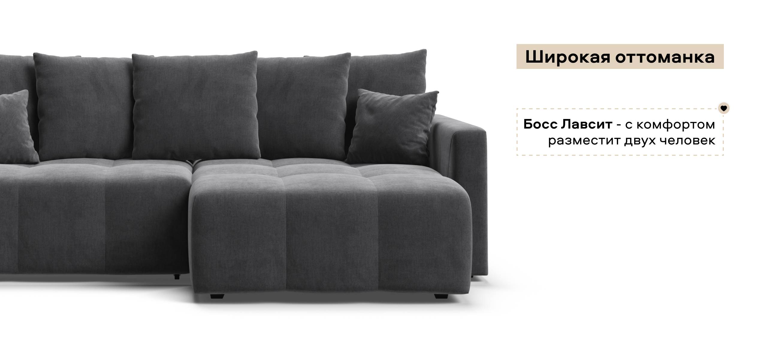 Широкая оттоманка Босс Лавсит - с комфортом разместит двух человек. Независимый пружинный блок в основании и механизм еврокнижка превращают диван в комфортное спальное место с анатомическим эффектом.