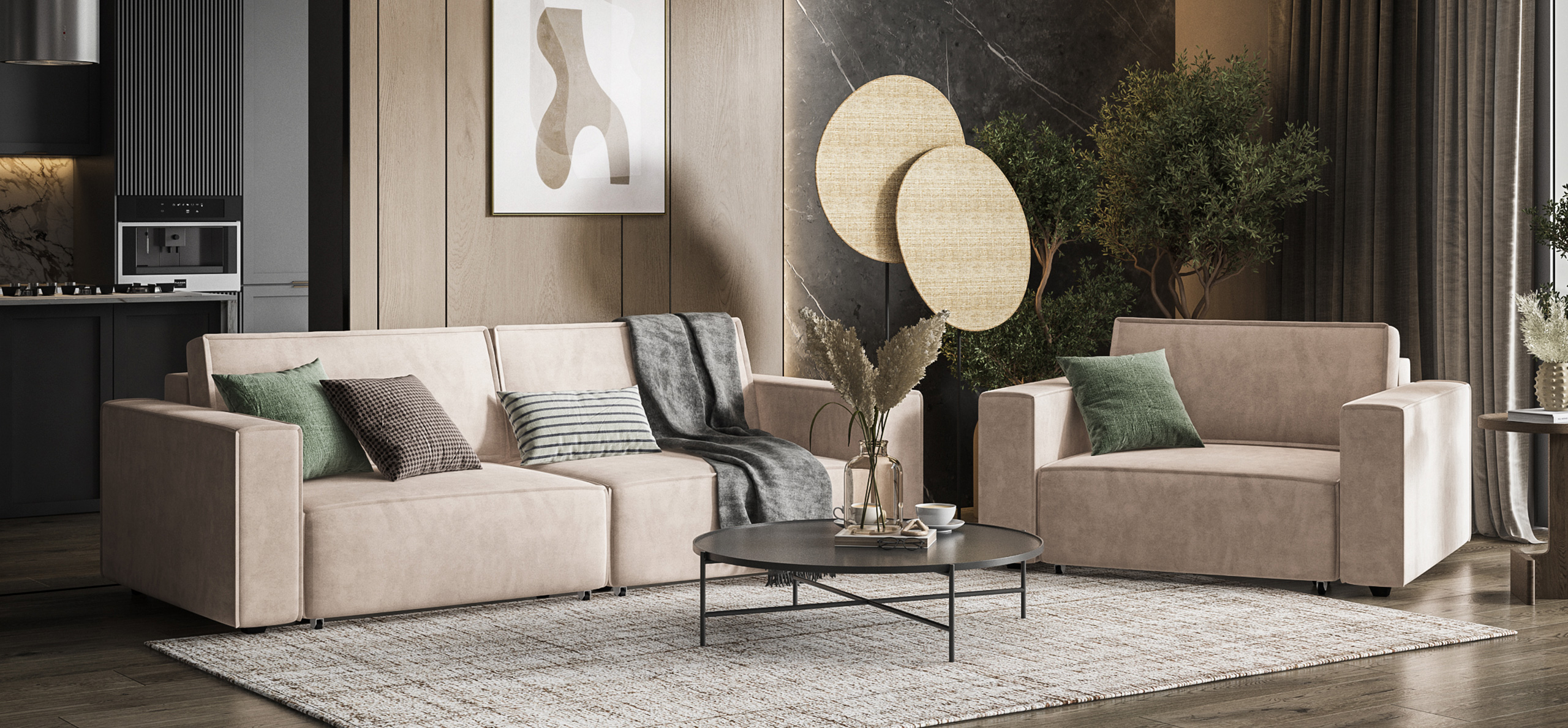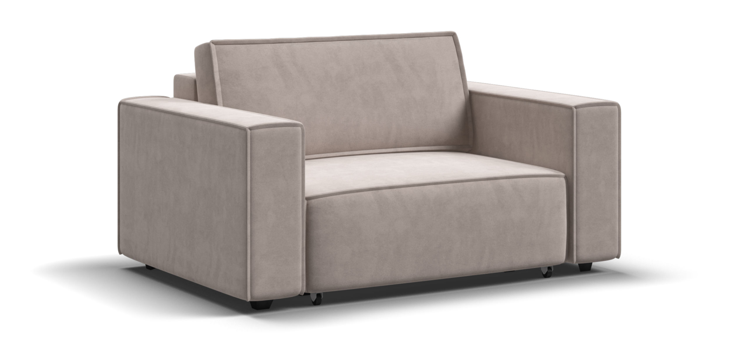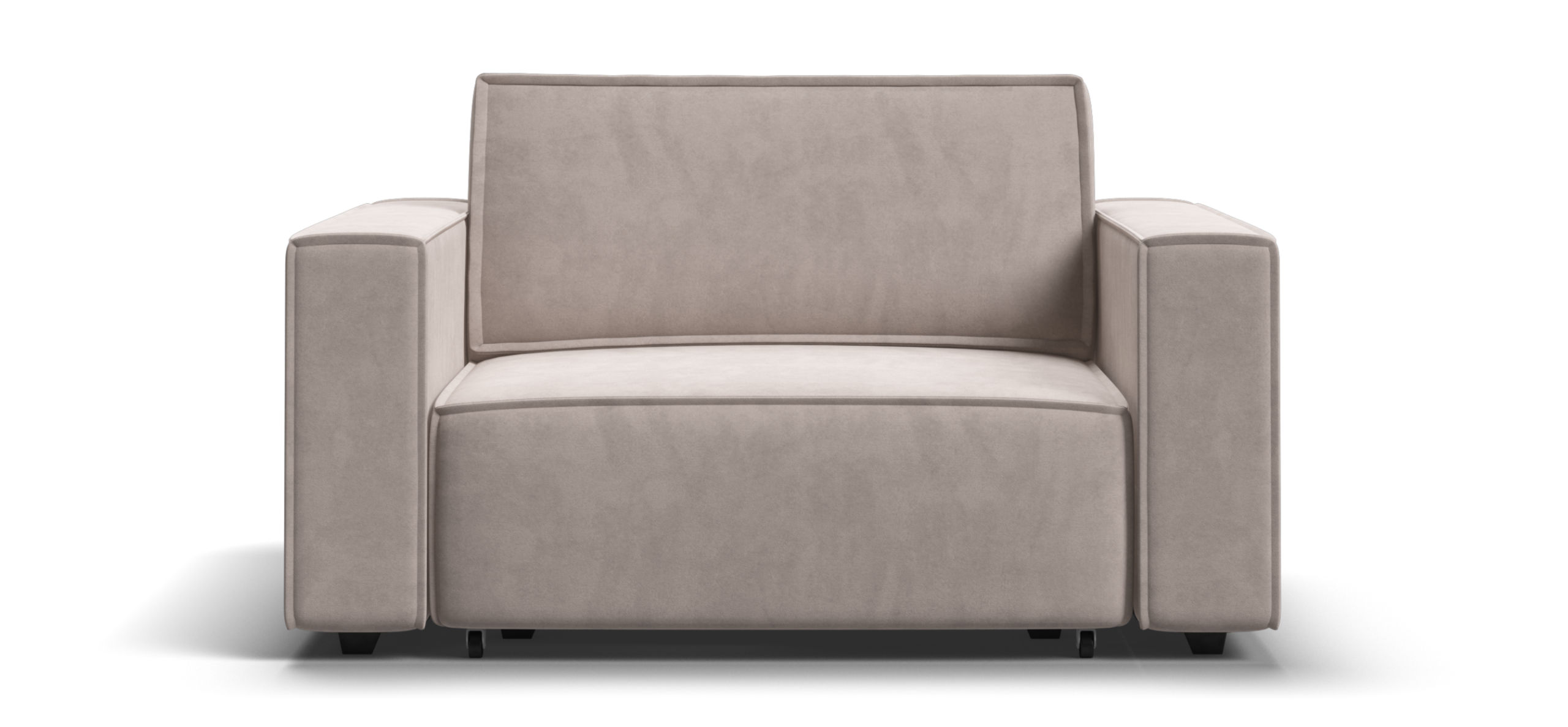Широкие прямоугольные подлокотники, строгая симметрия и минималистичная отделка идеально дополнит современный интерьер Вашей гостиной.