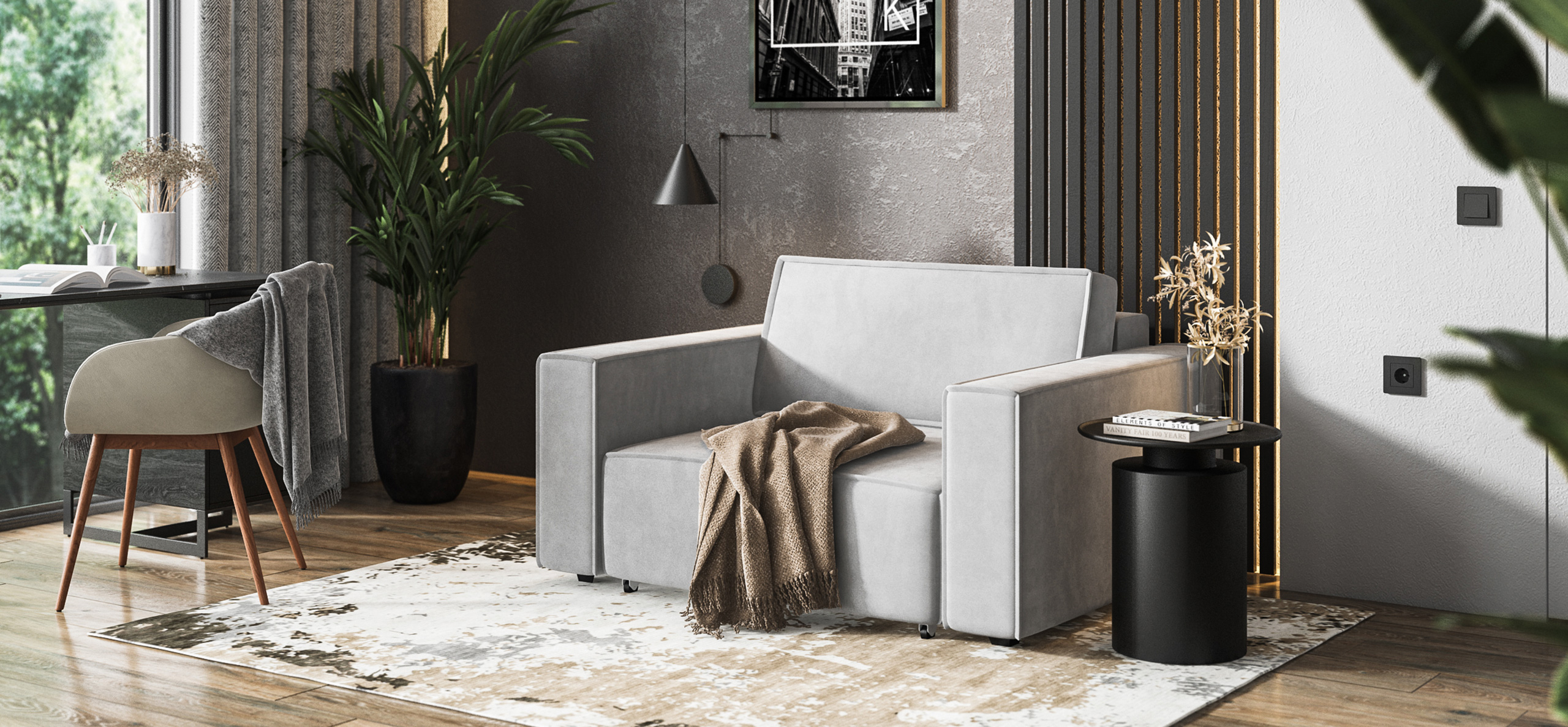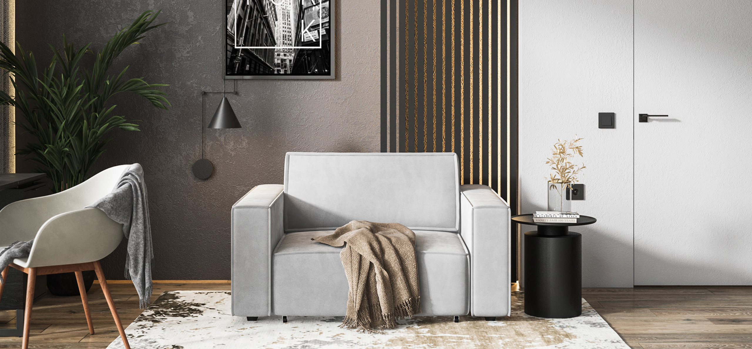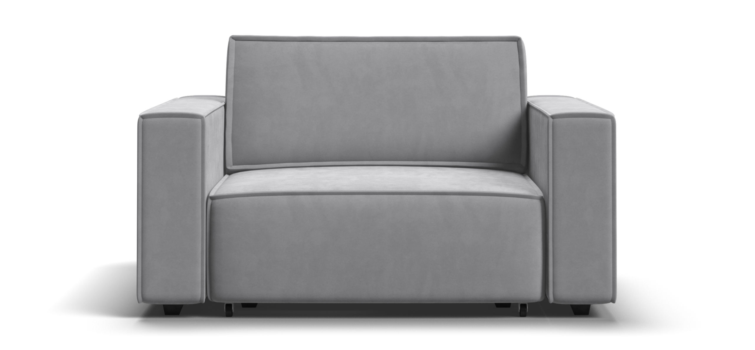 Широкие прямоугольные подлокотники, строгая симметрия и минималистичная отделка идеально дополнит современный интерьер Вашей гостиной.