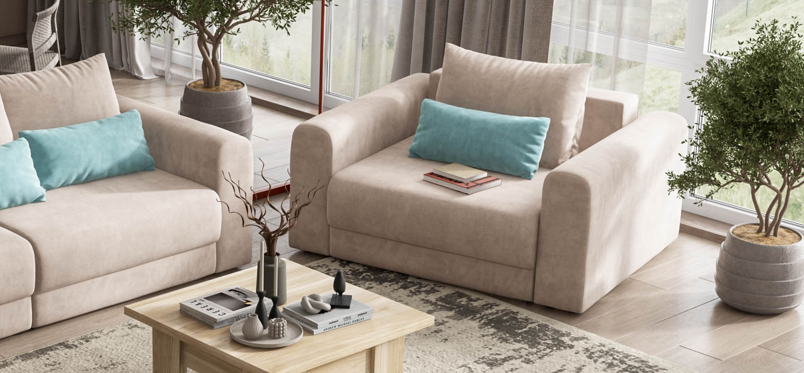Широкие скругленные подлокотники, плавные линии и приспинные подушки разного размера - стильный комфорт в каждой детали.