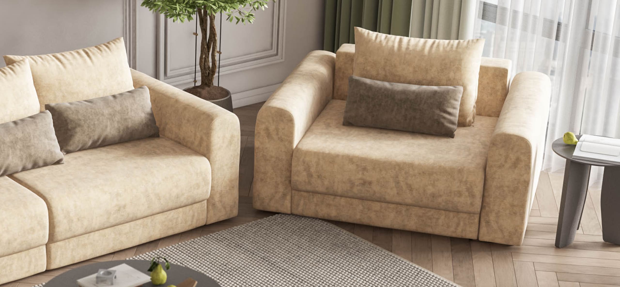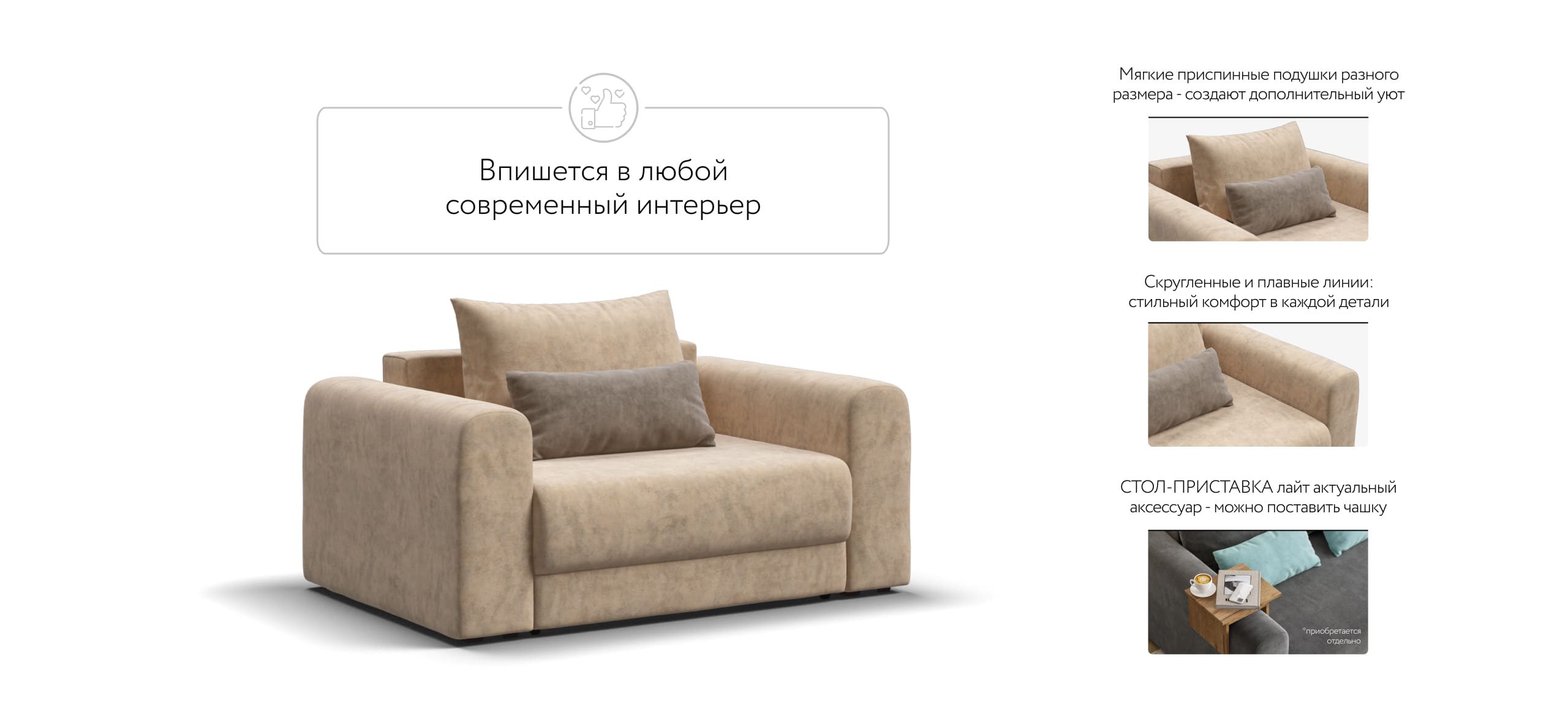 Широкие скругленные подлокотники, плавные линии и приспинные подушки разного размера - стильный комфорт в каждой детали.