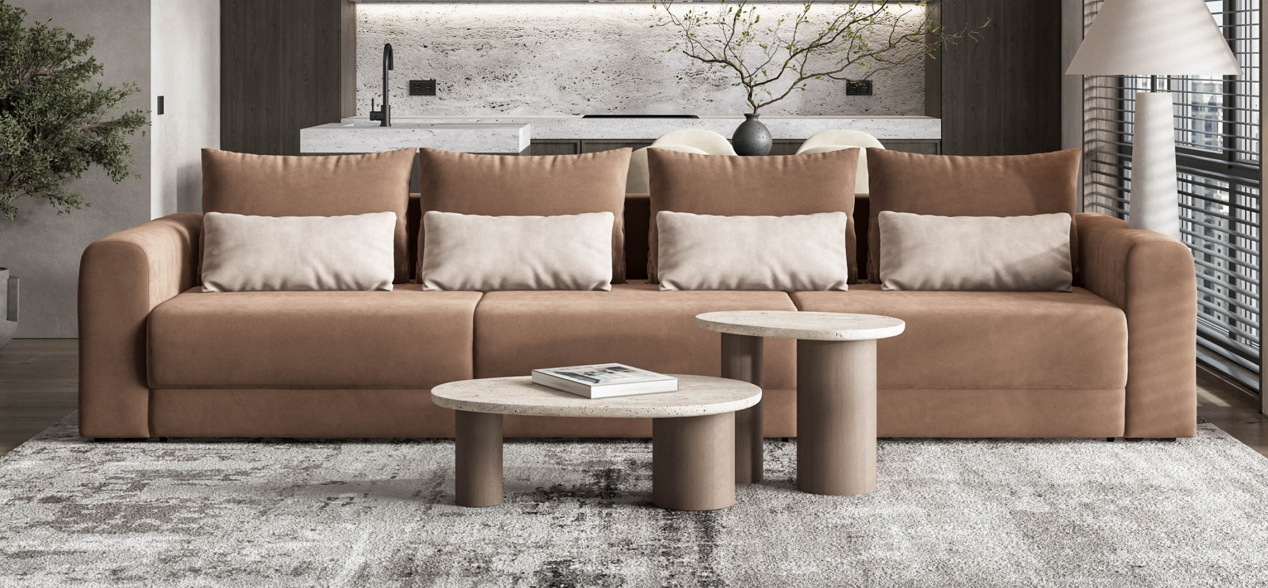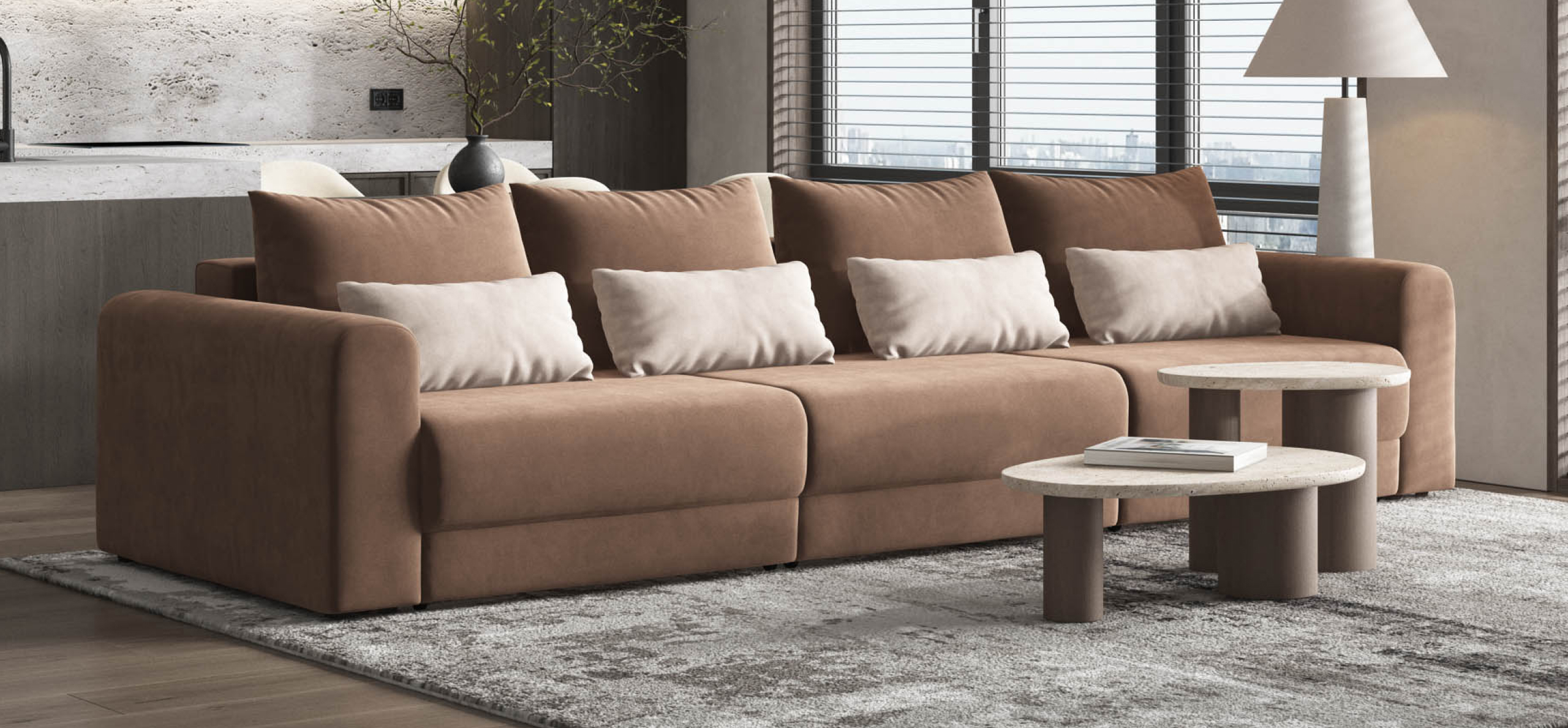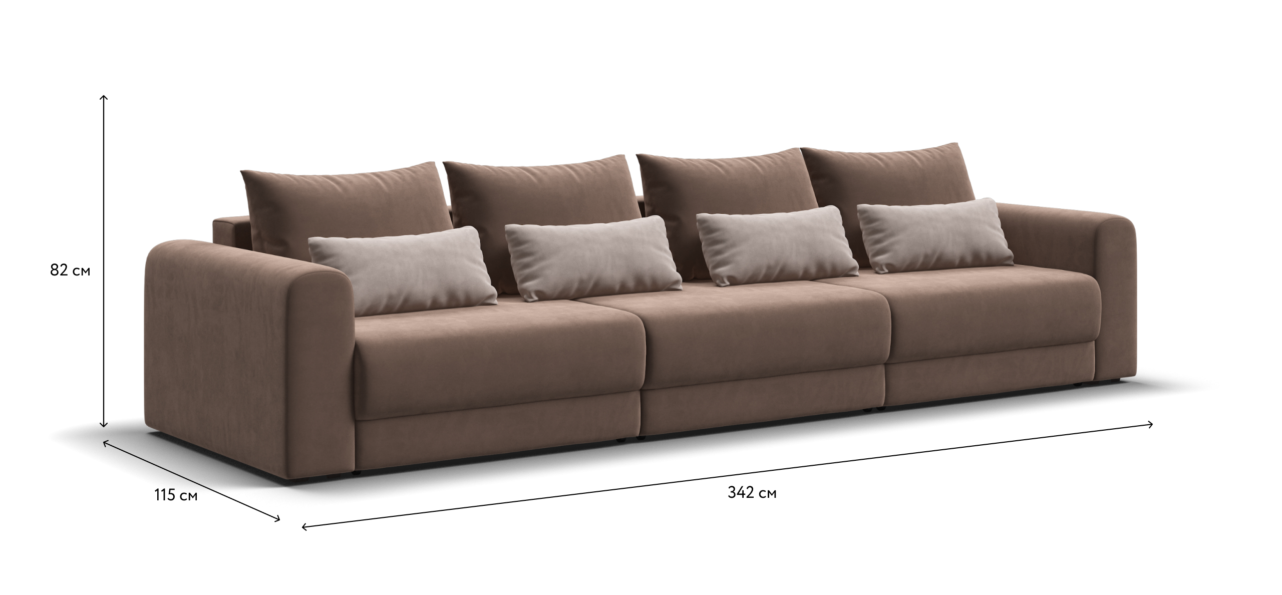 Широкие скругленные подлокотники, плавные линии и приспинные подушки разного размера - стильный комфорт в каждой детали.