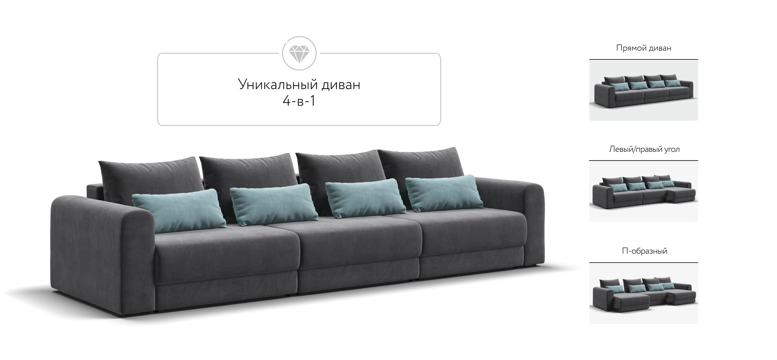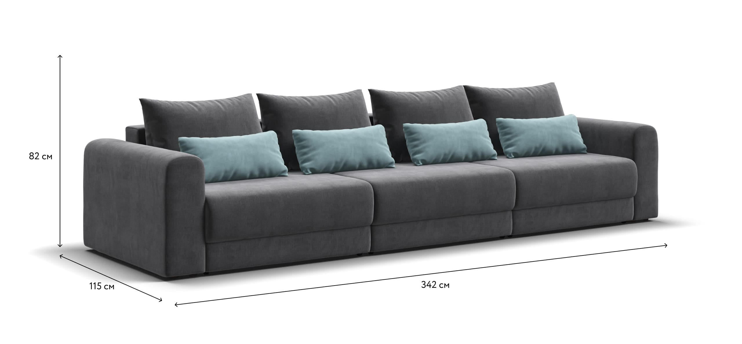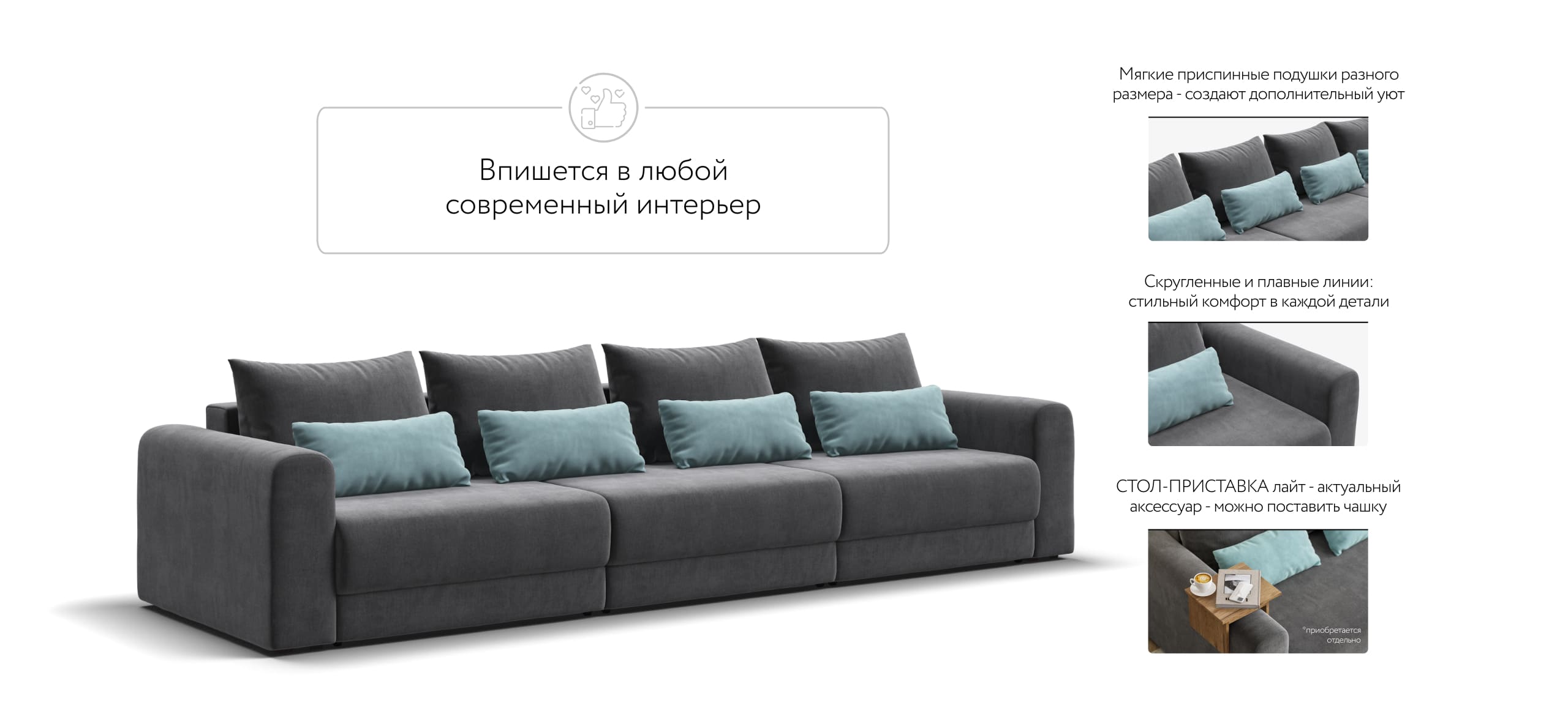 Широкие скругленные подлокотники, плавные линии и приспинные подушки разного размера - стильный комфорт в каждой детали.