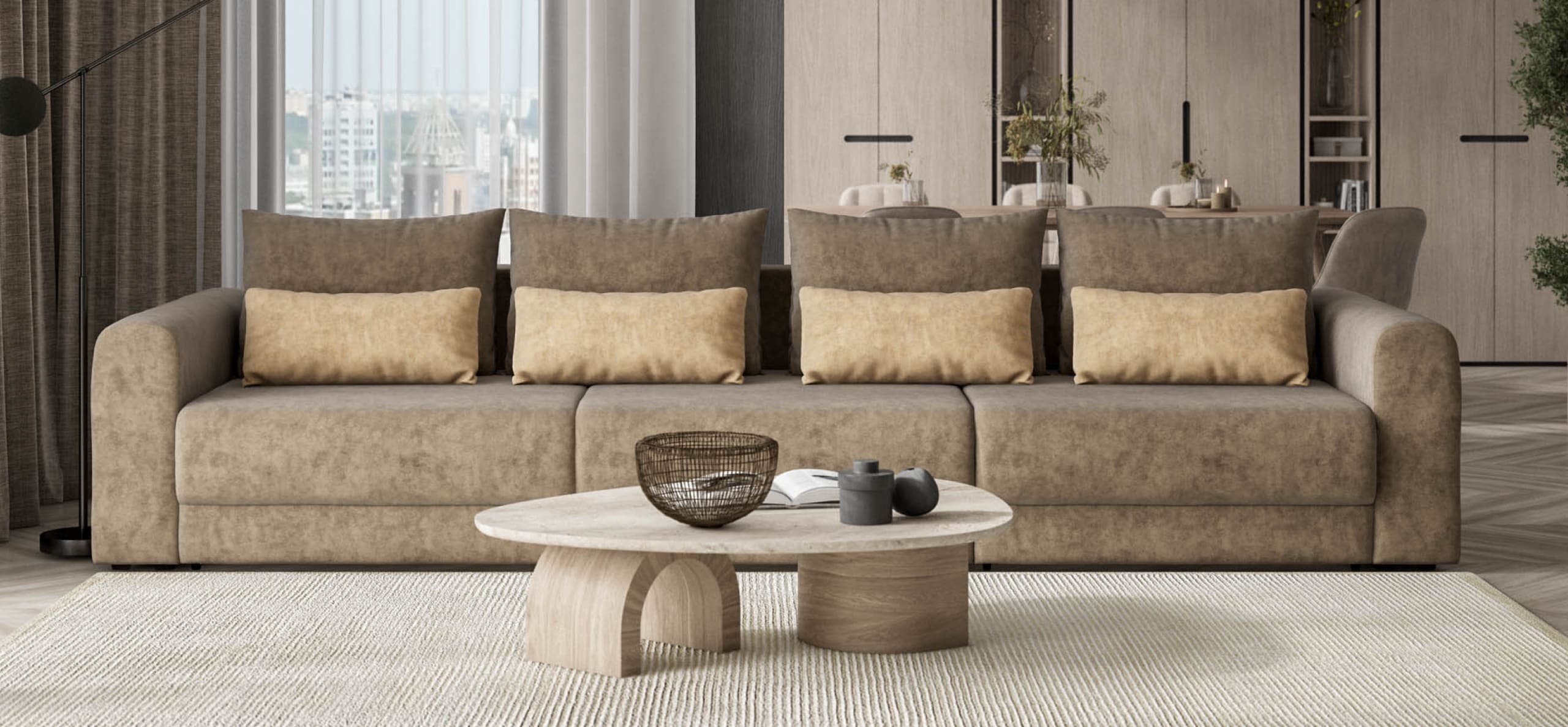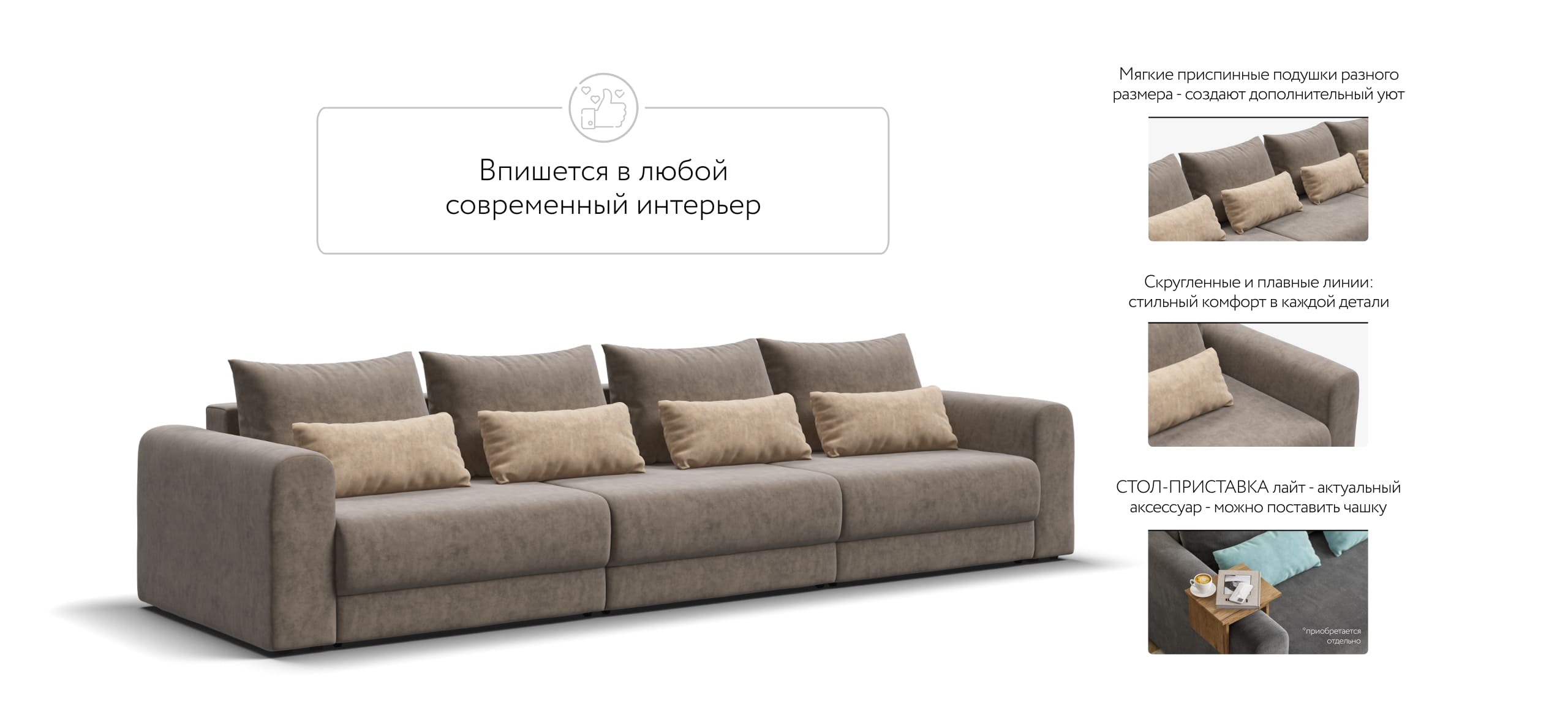 Широкие скругленные подлокотники, плавные линии и приспинные подушки разного размера - стильный комфорт в каждой детали.