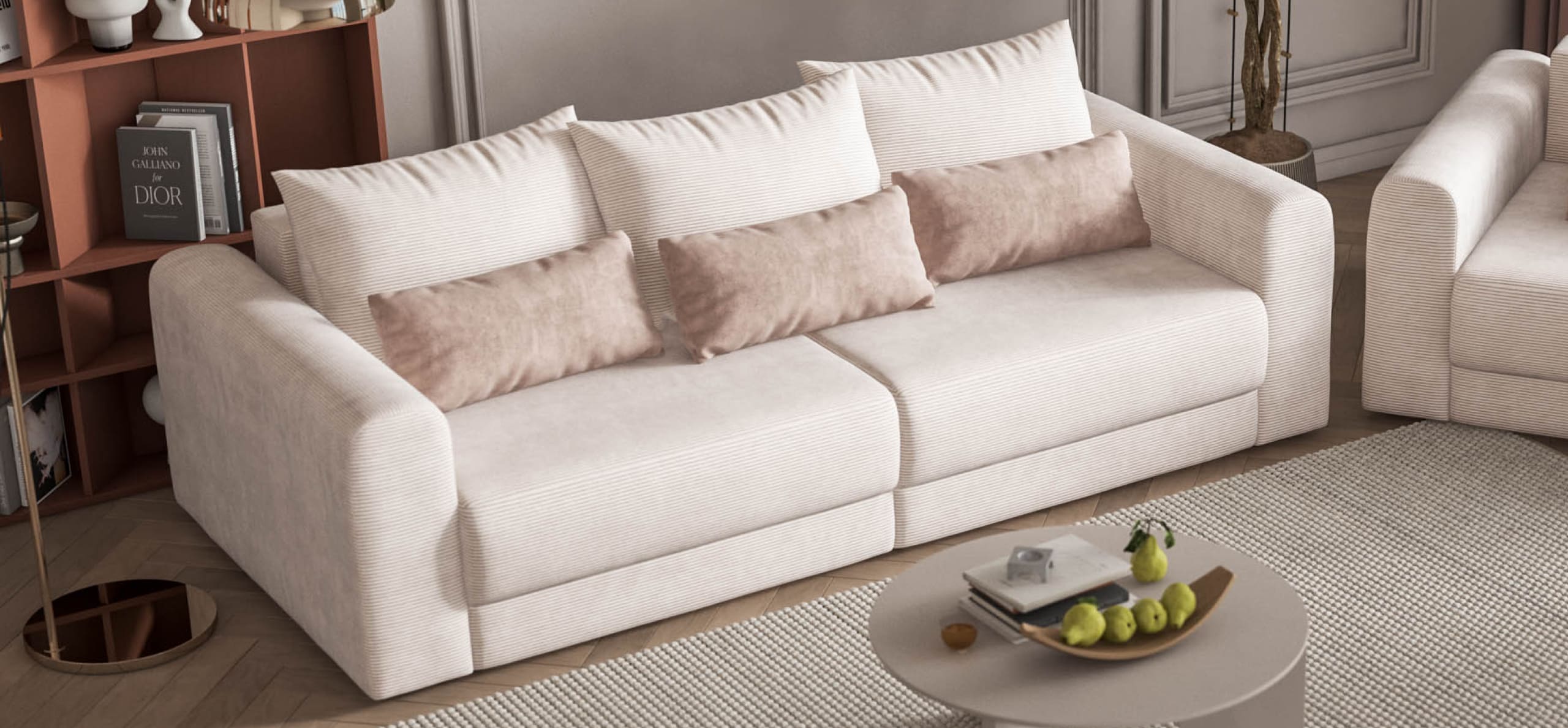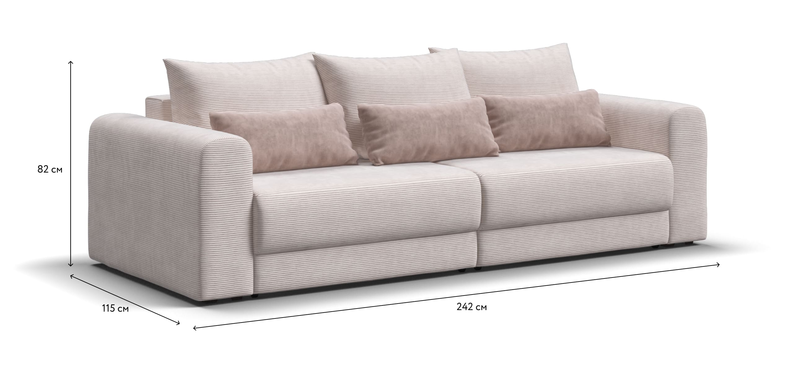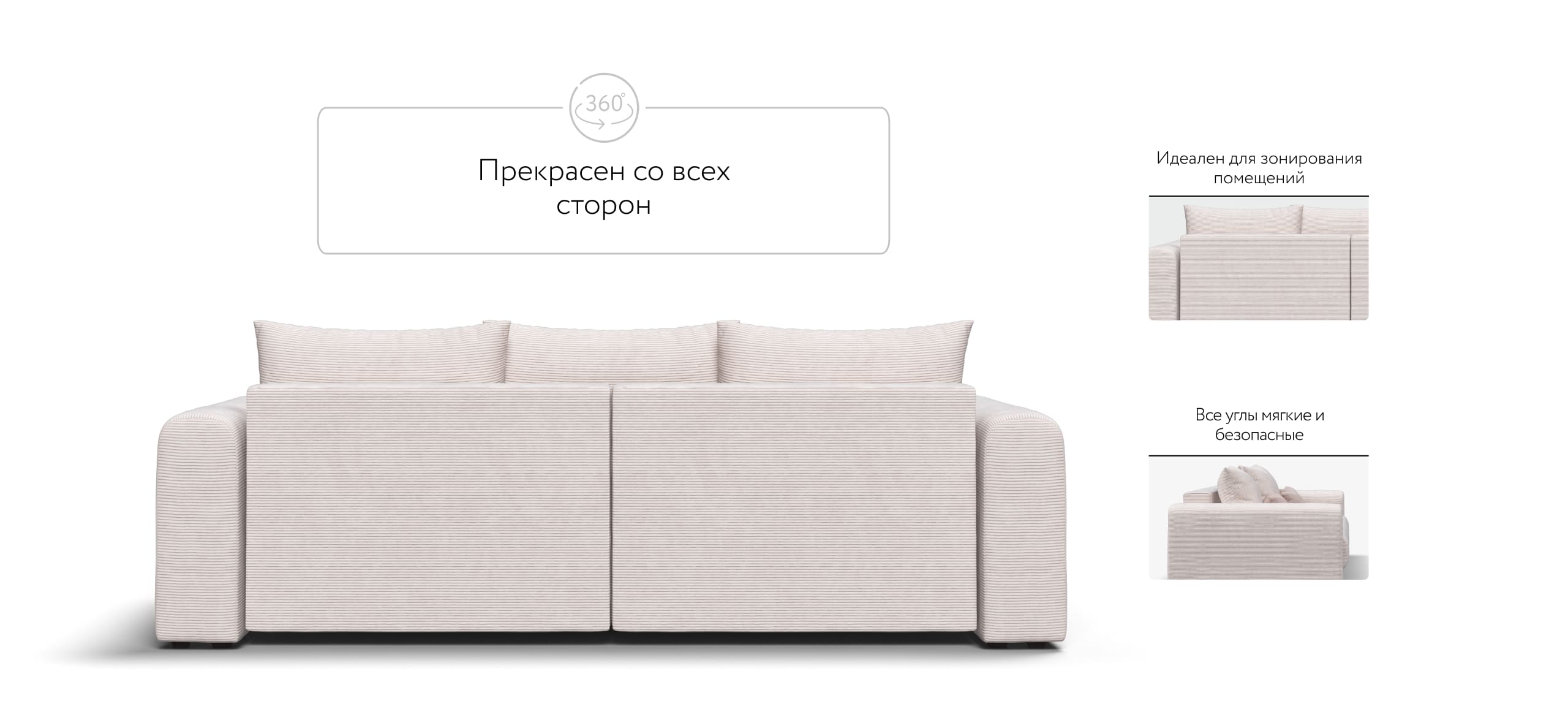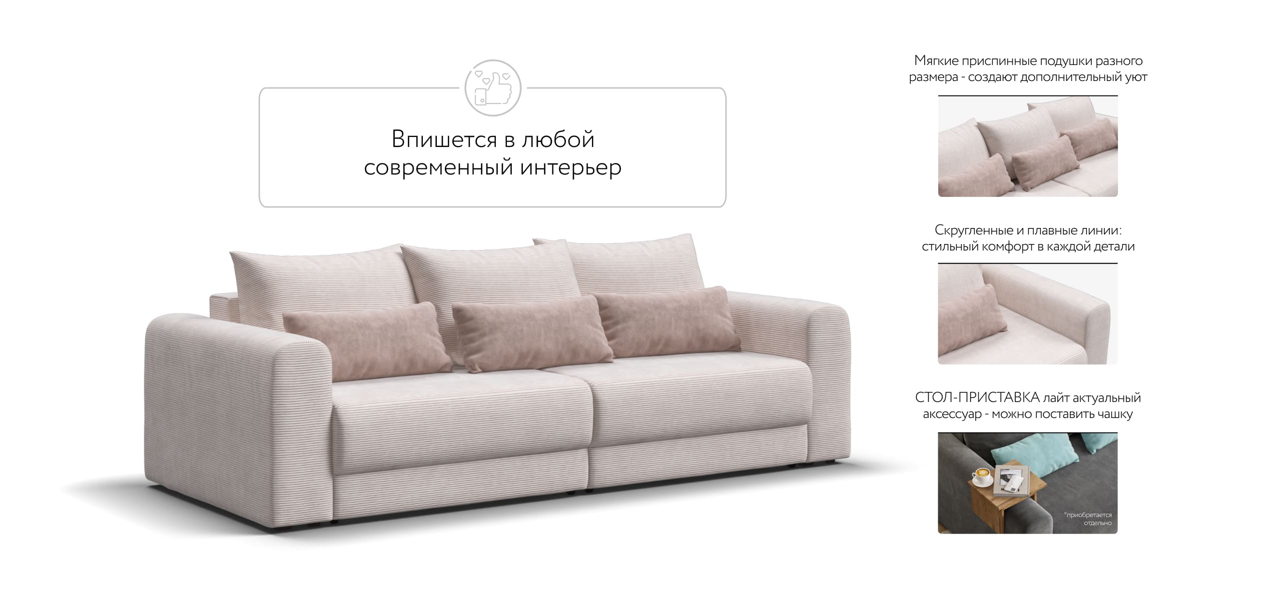 Широкие скругленные подлокотники, плавные линии и приспинные подушки разного размера - стильный комфорт в каждой детали.