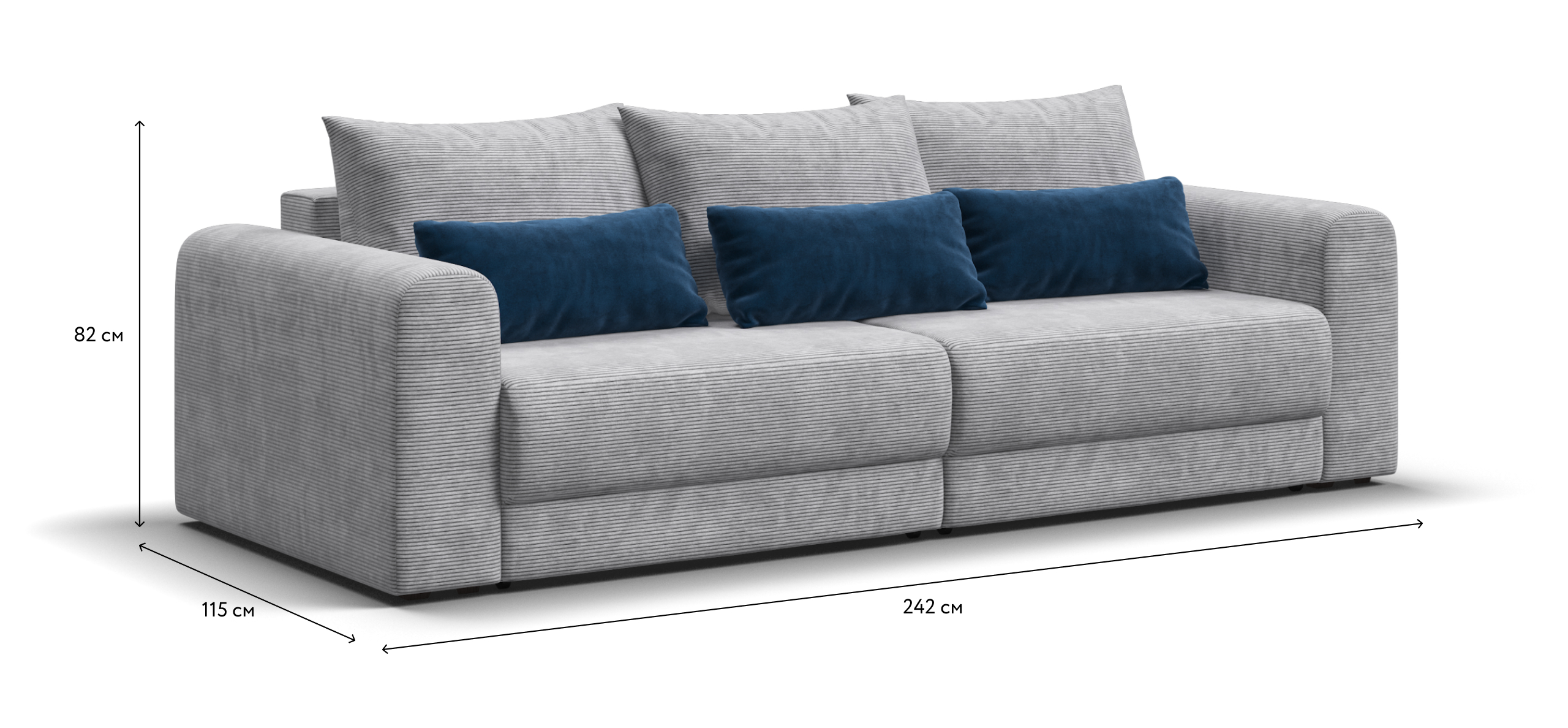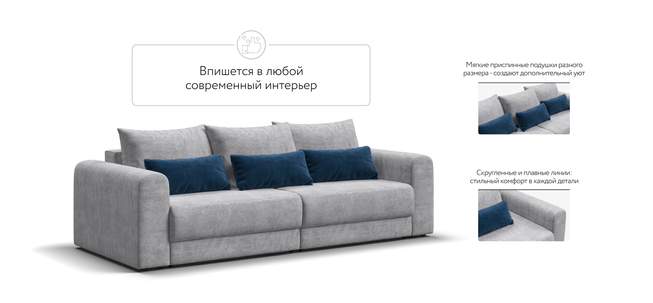 Широкие скругленные подлокотники, плавные линии и приспинные подушки разного размера - стильный комфорт в каждой детали.