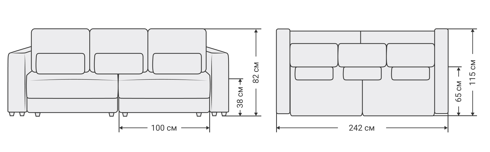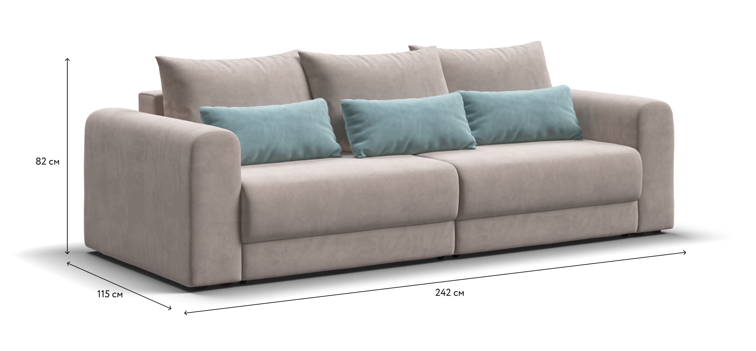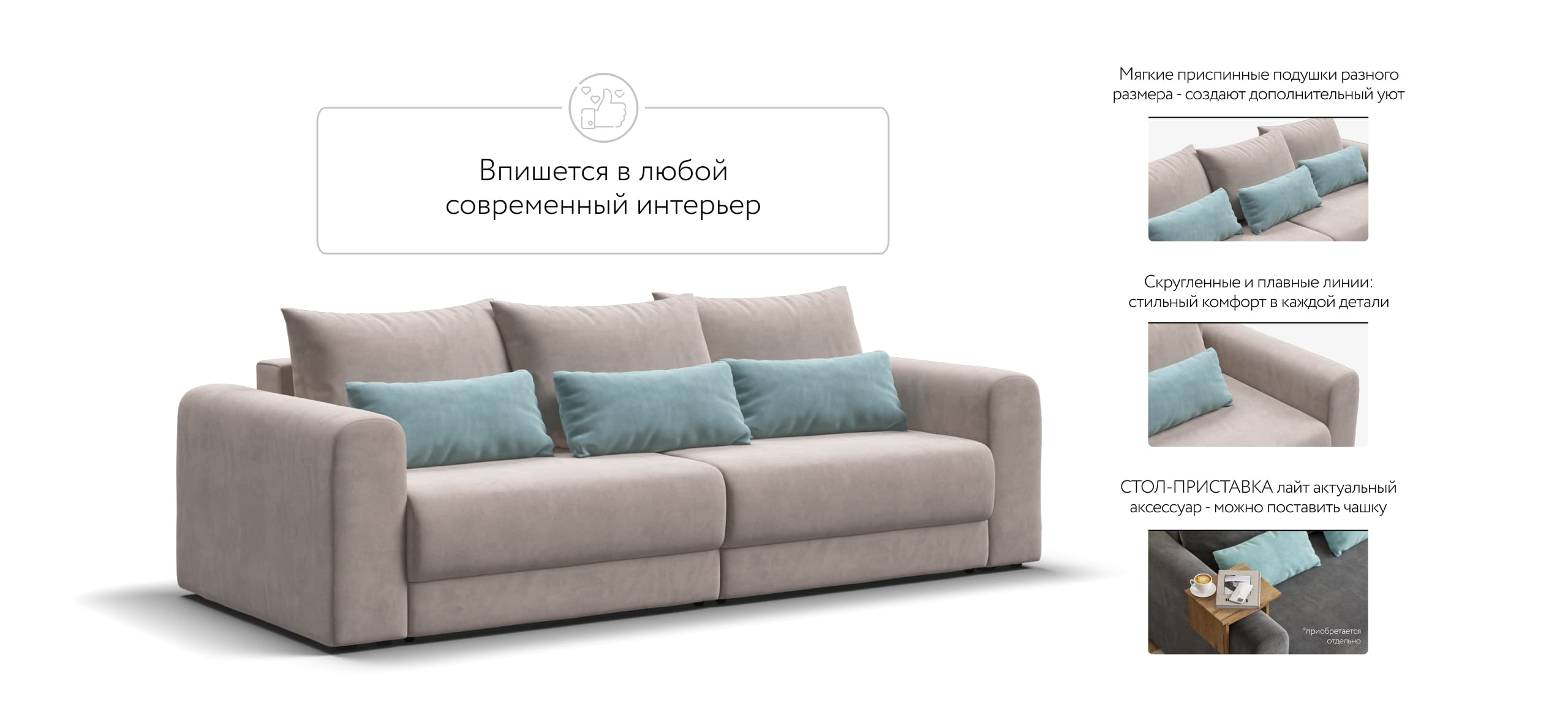 Широкие скругленные подлокотники, плавные линии и приспинные подушки разного размера - стильный комфорт в каждой детали.