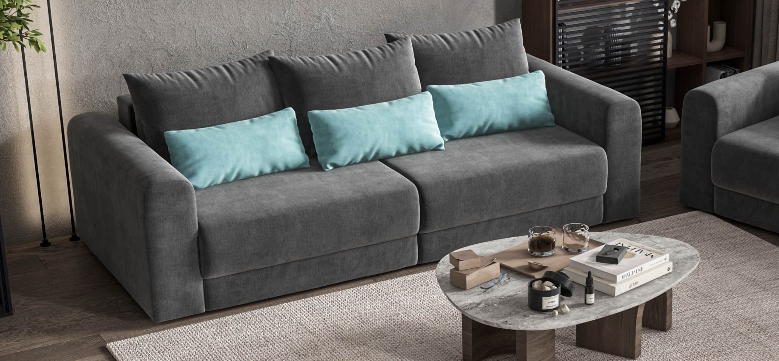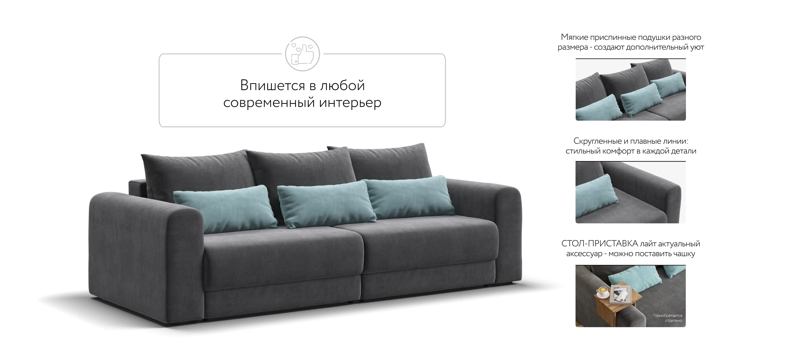 Широкие скругленные подлокотники, плавные линии и приспинные подушки разного размера - стильный комфорт в каждой детали.