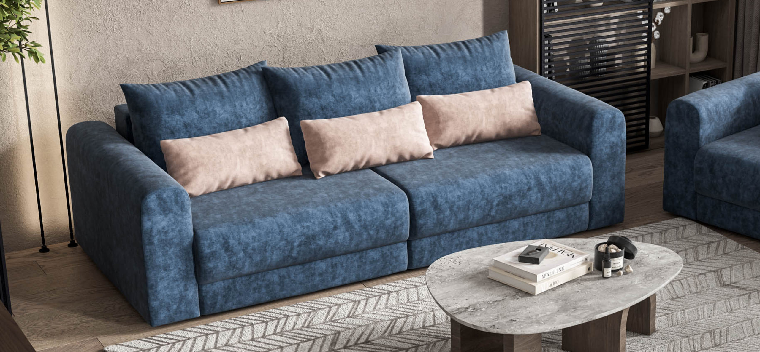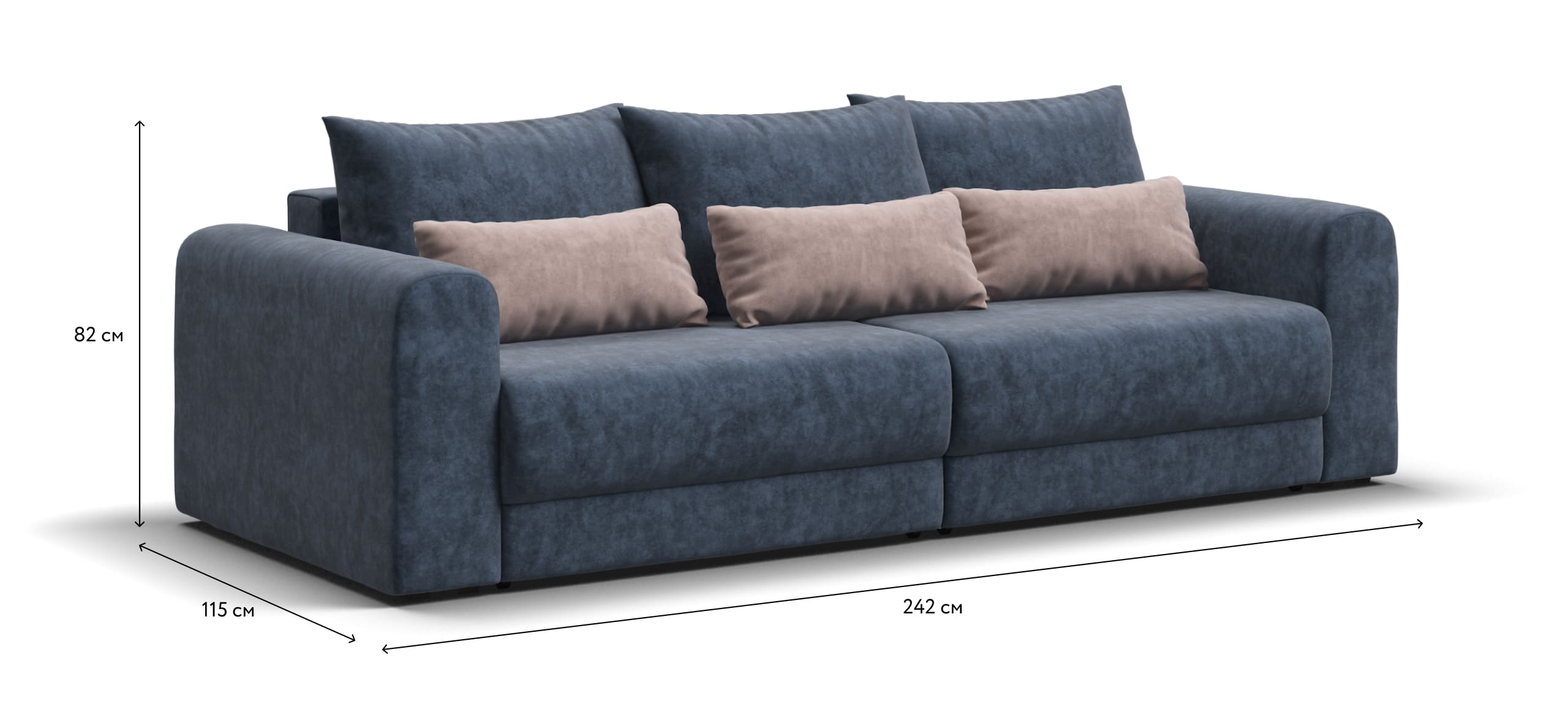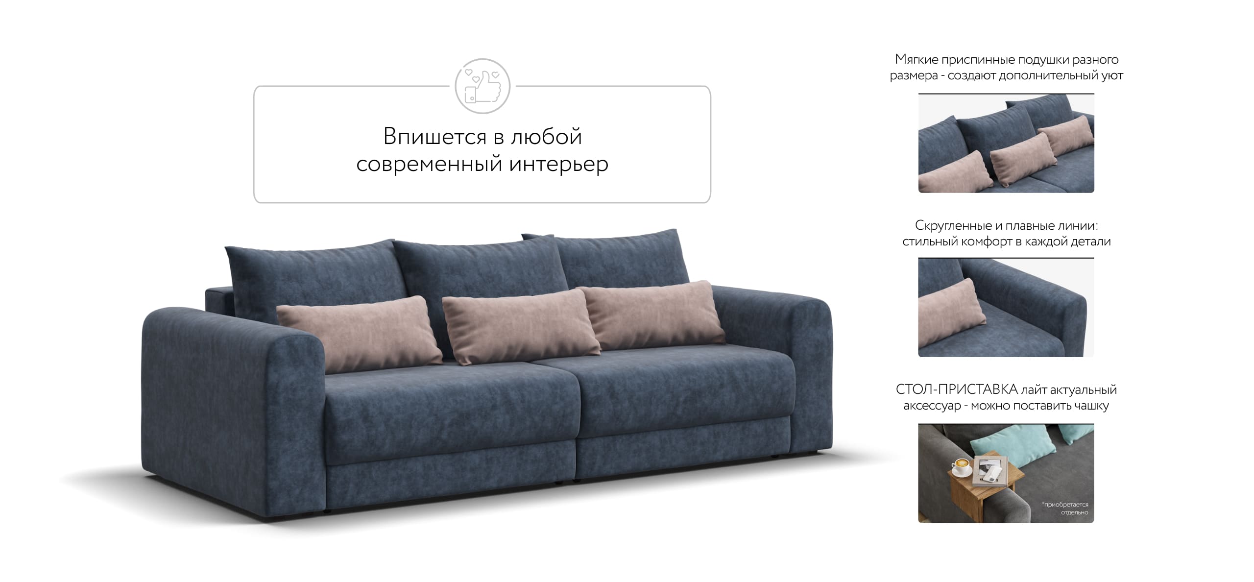 Широкие скругленные подлокотники, плавные линии и приспинные подушки разного размера - стильный комфорт в каждой детали.