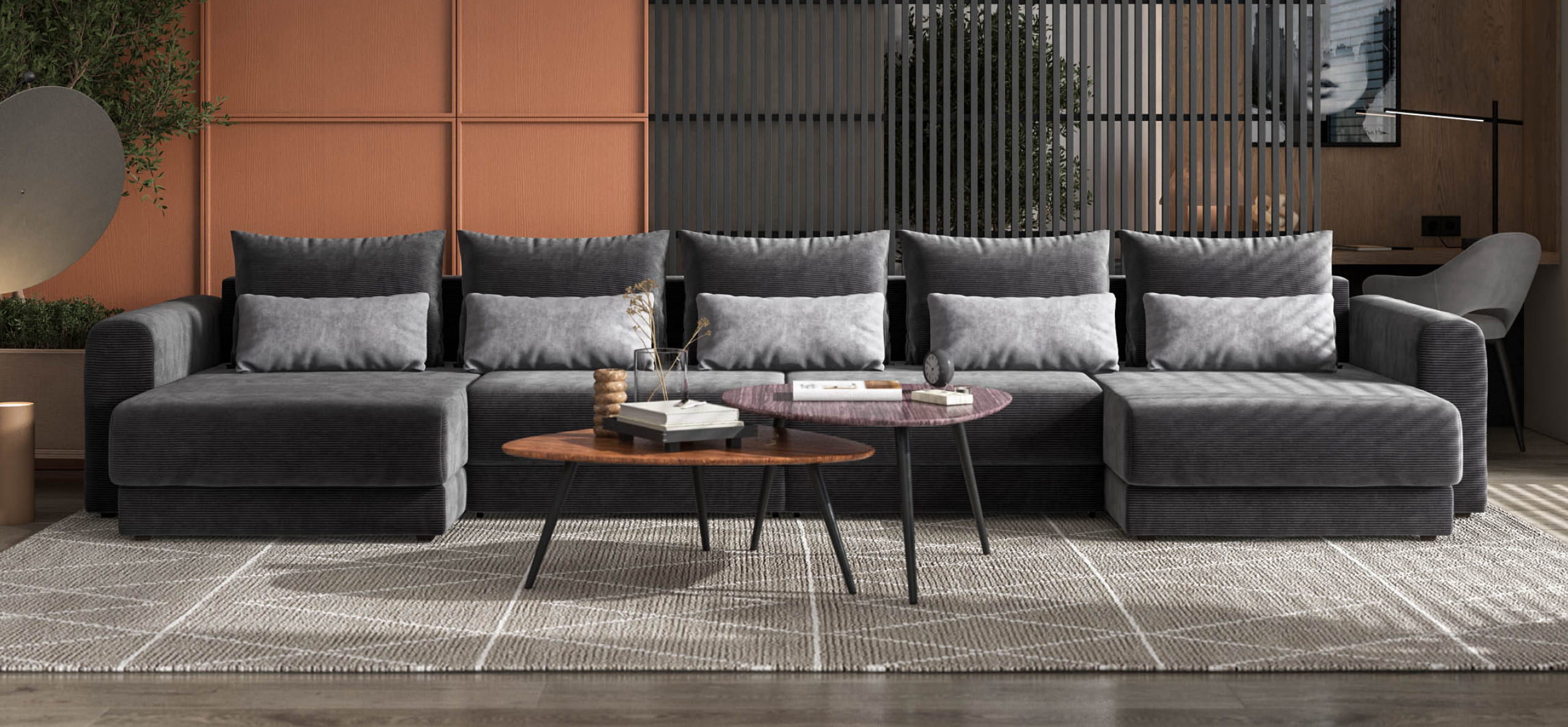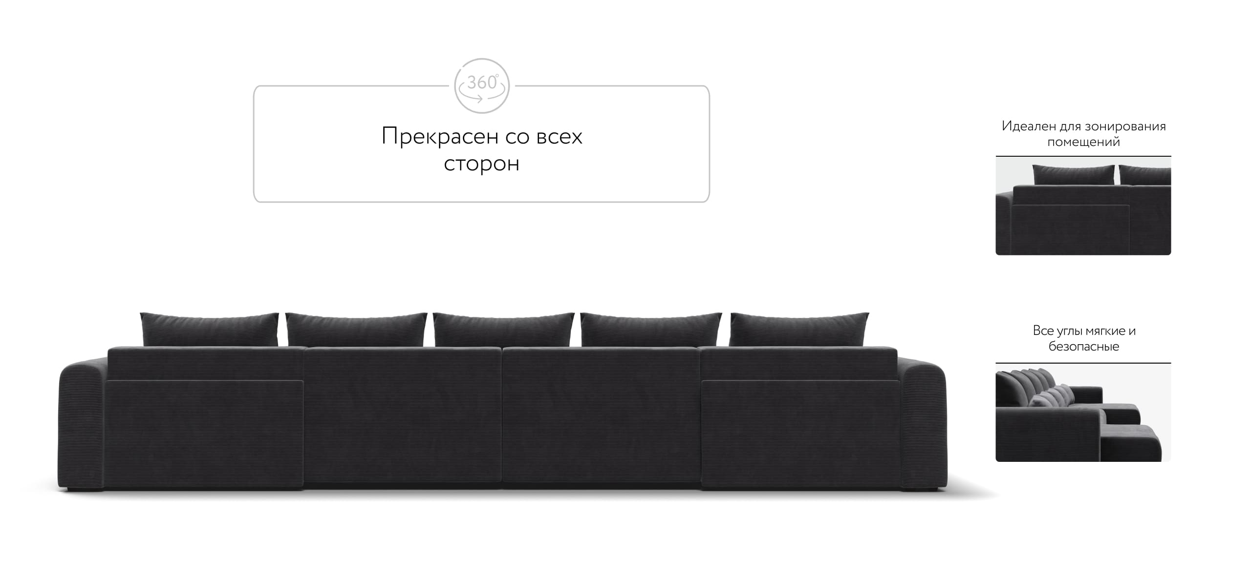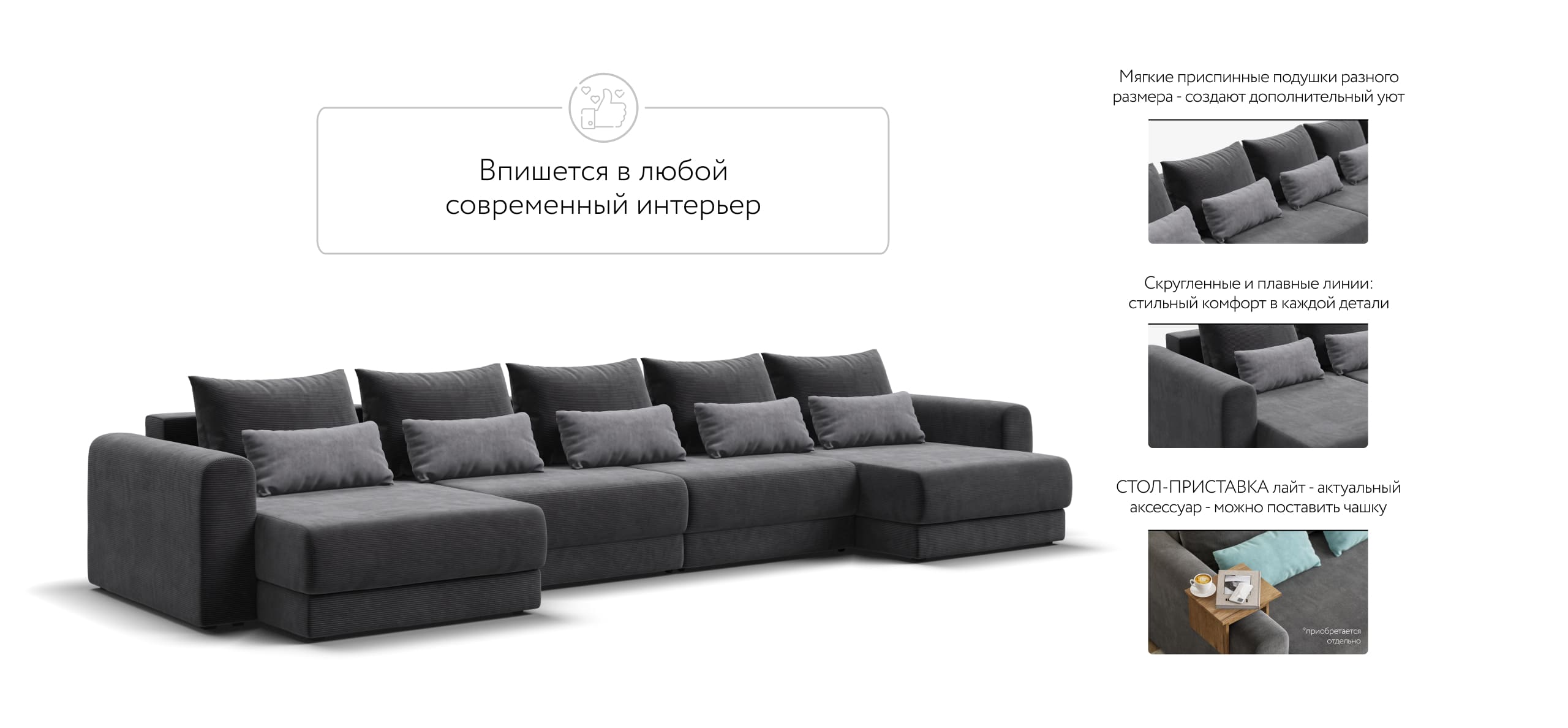 Широкие скругленные подлокотники, плавные линии и приспинные подушки разного размера - стильный комфорт в каждой детали.