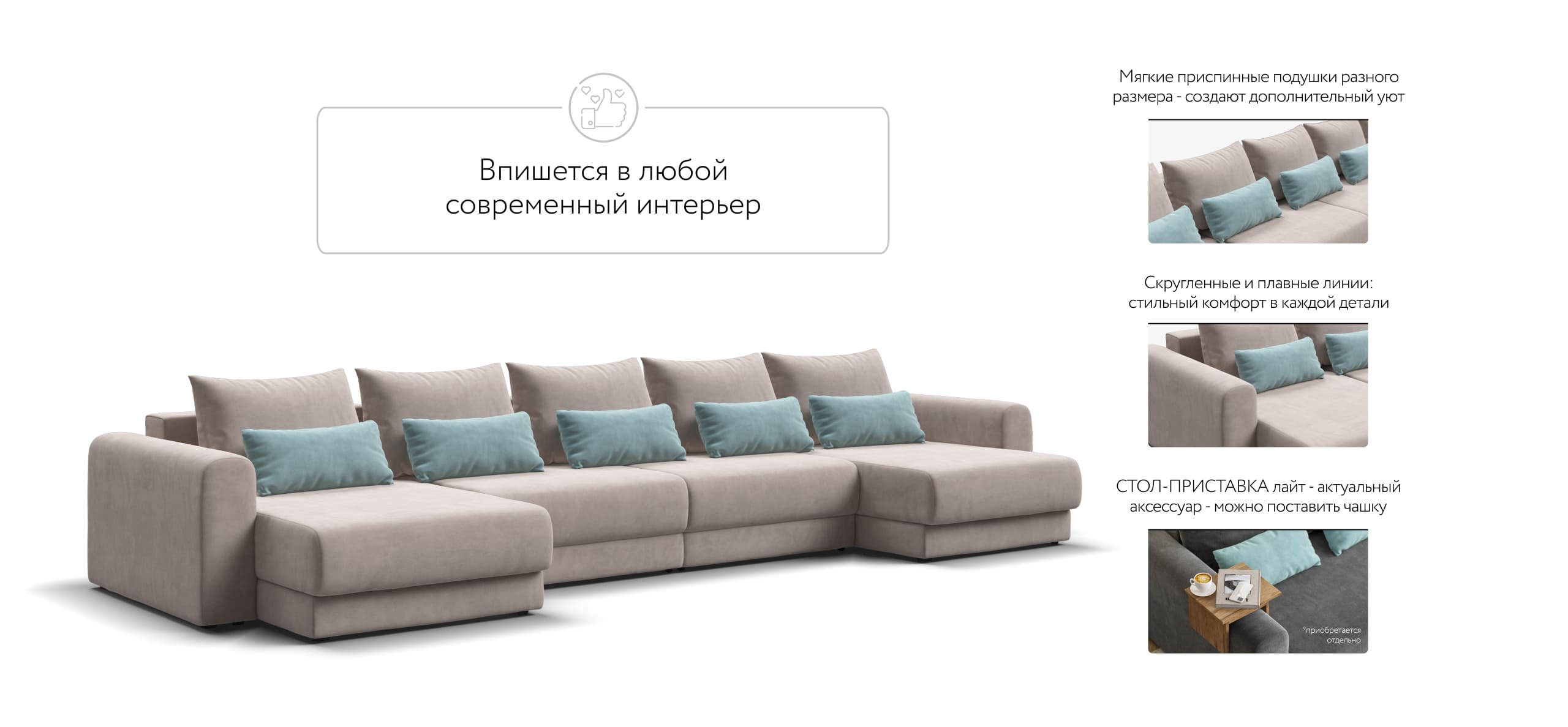 Широкие скругленные подлокотники, плавные линии и приспинные подушки разного размера - стильный комфорт в каждой детали.