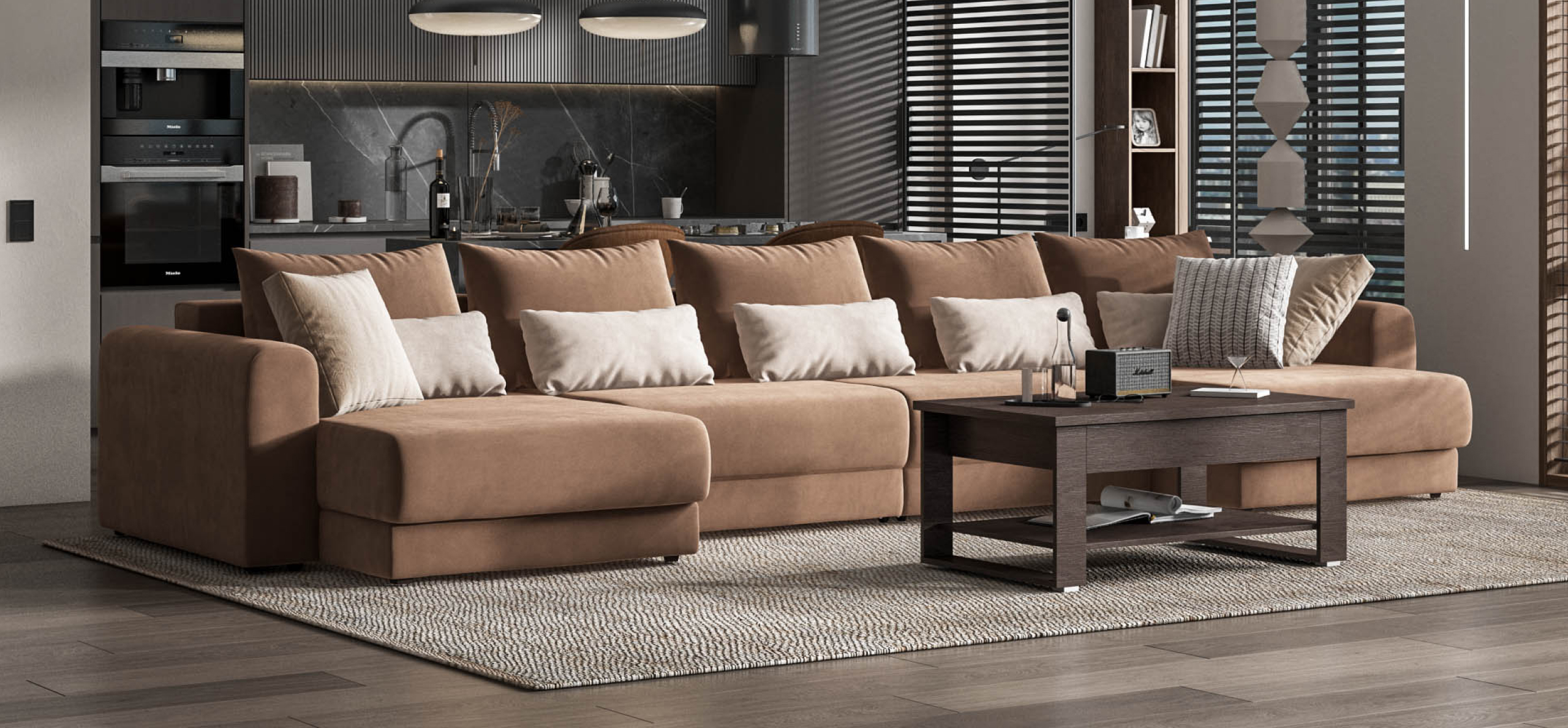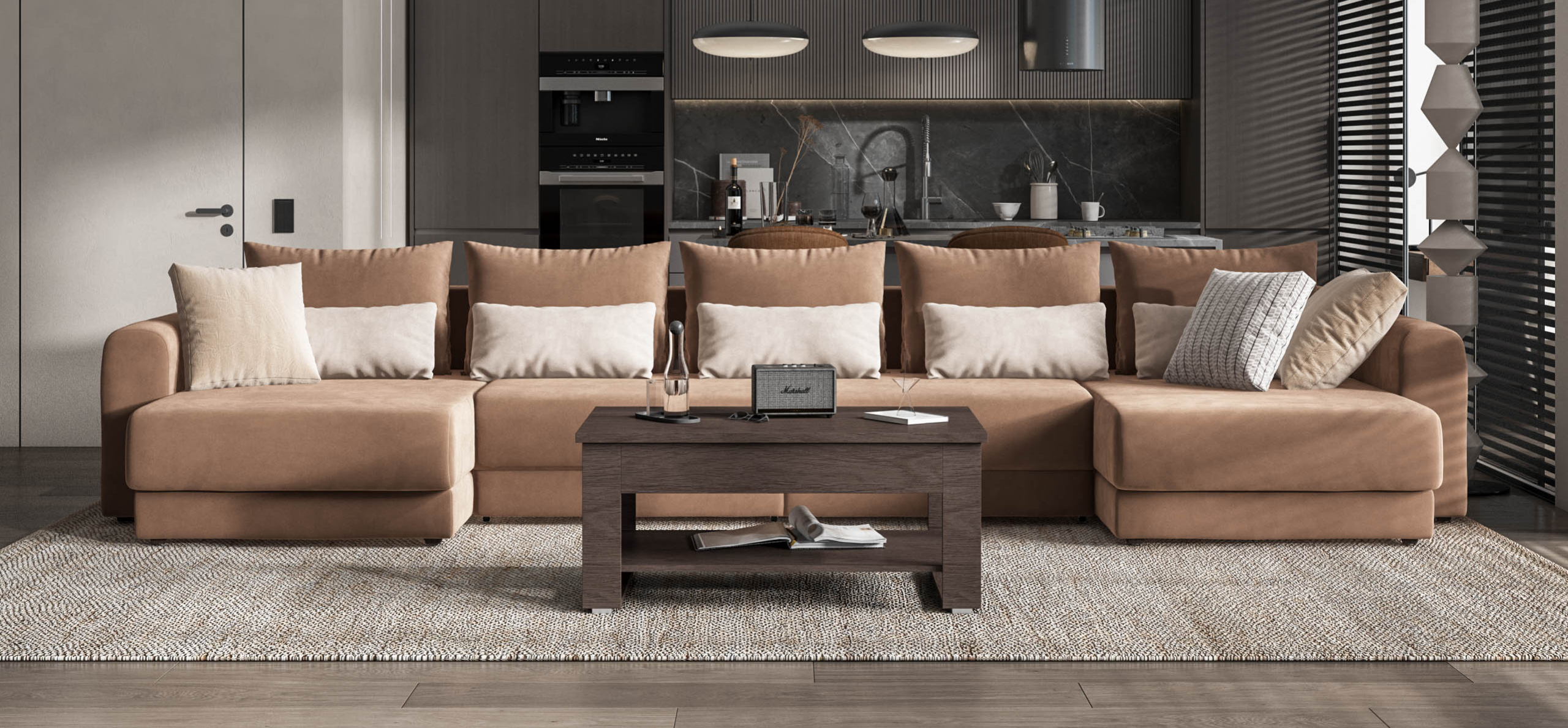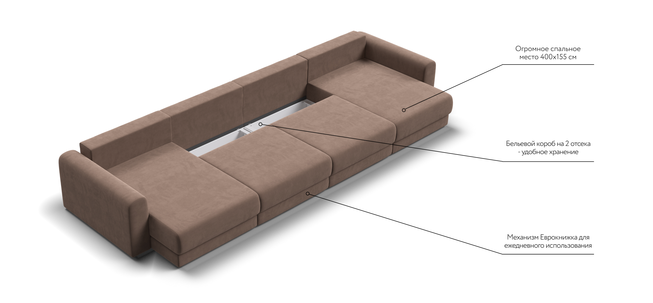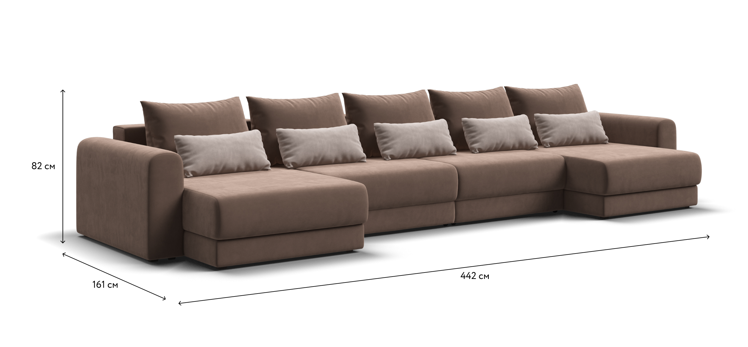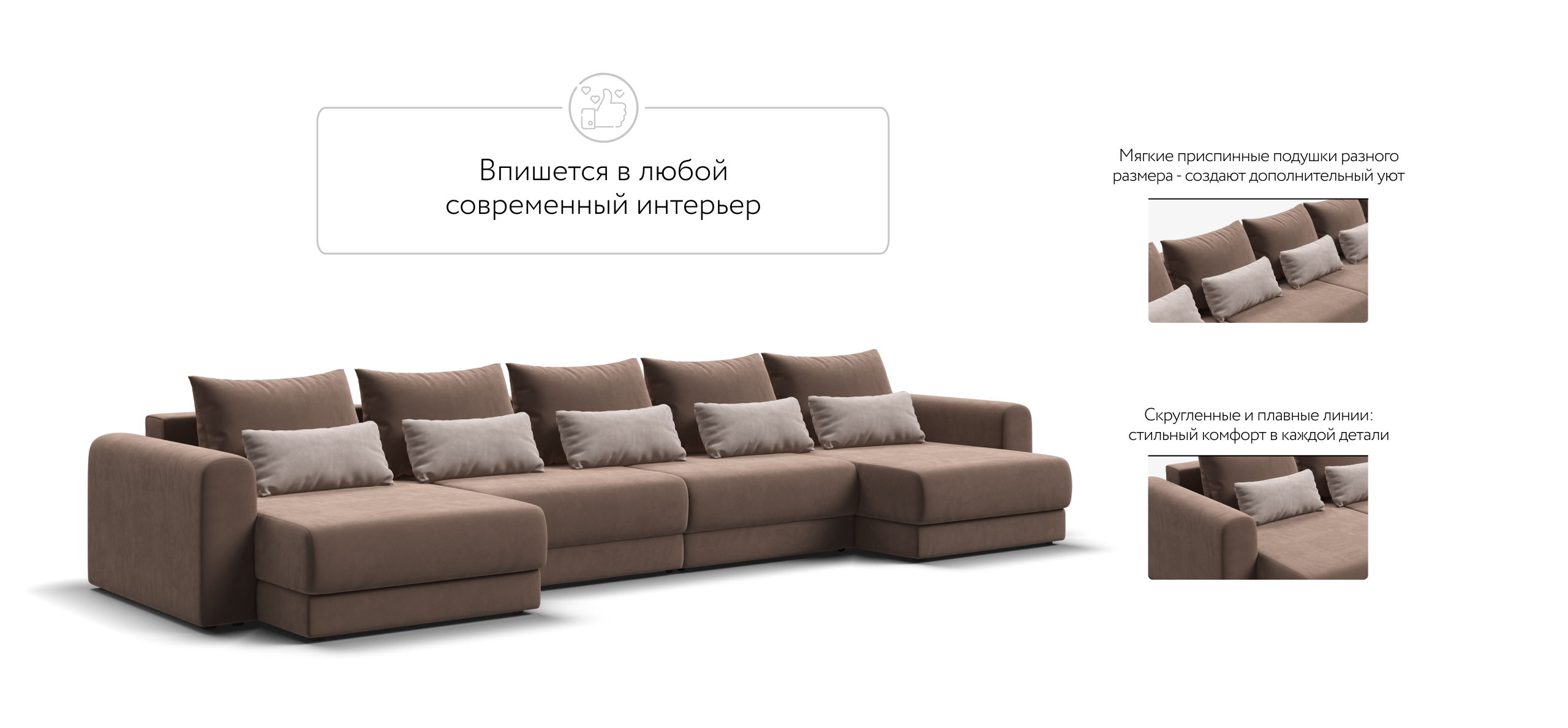 Широкие скругленные подлокотники, плавные линии и приспинные подушки разного размера - стильный комфорт в каждой детали.