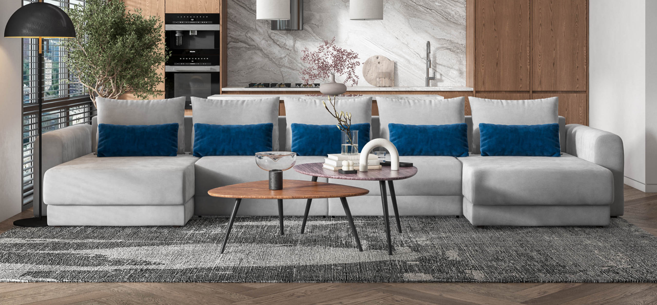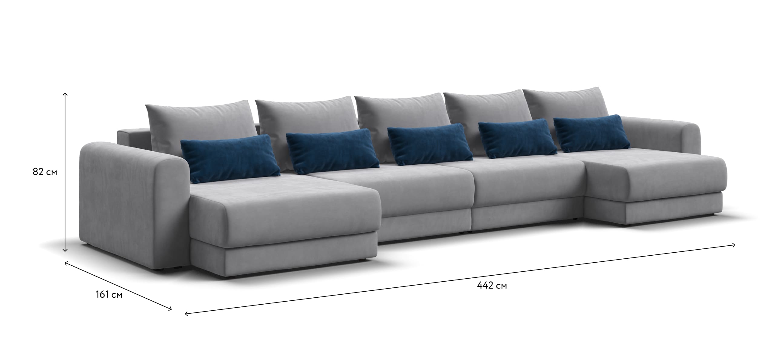 Широкие скругленные подлокотники, плавные линии и приспинные подушки разного размера - стильный комфорт в каждой детали.