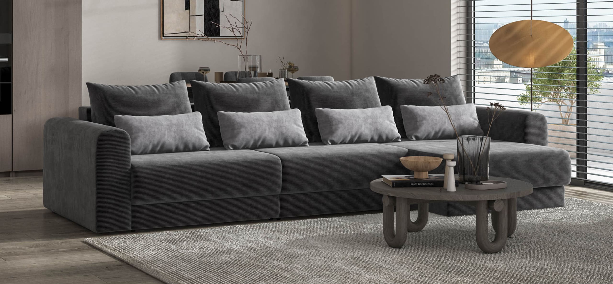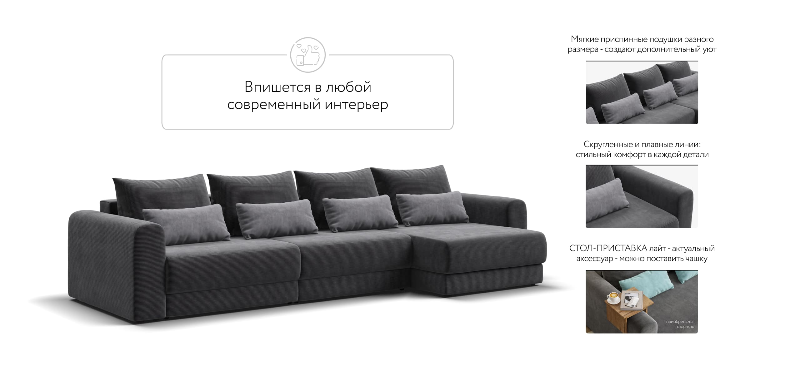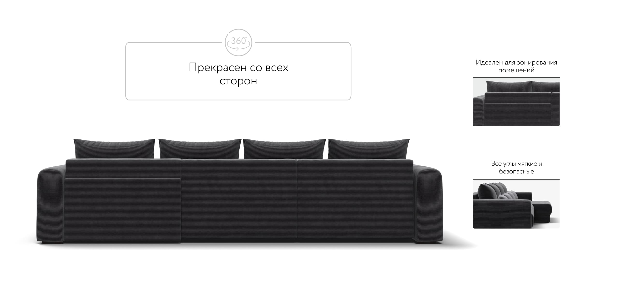 Широкие скругленные подлокотники, плавные линии и приспинные подушки разного размера - стильный комфорт в каждой детали.