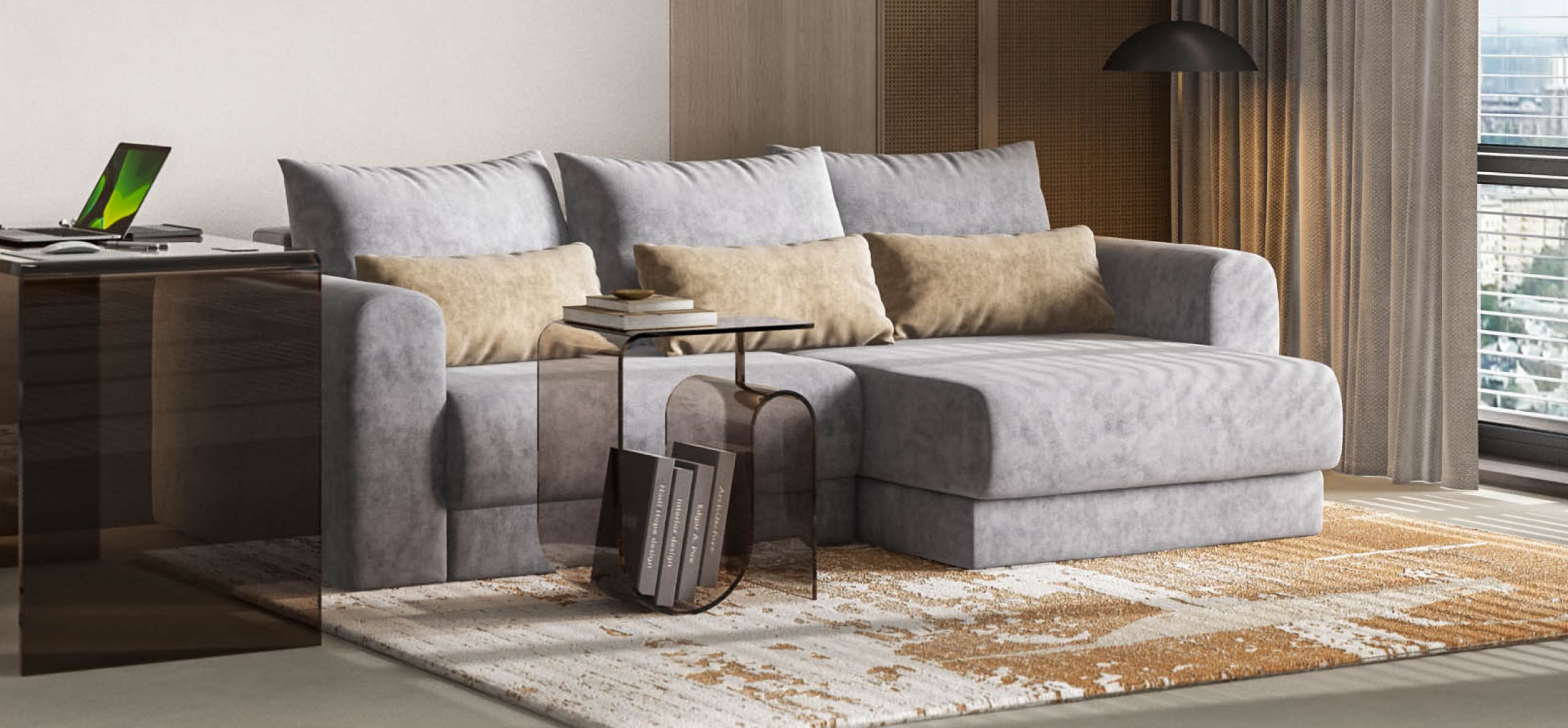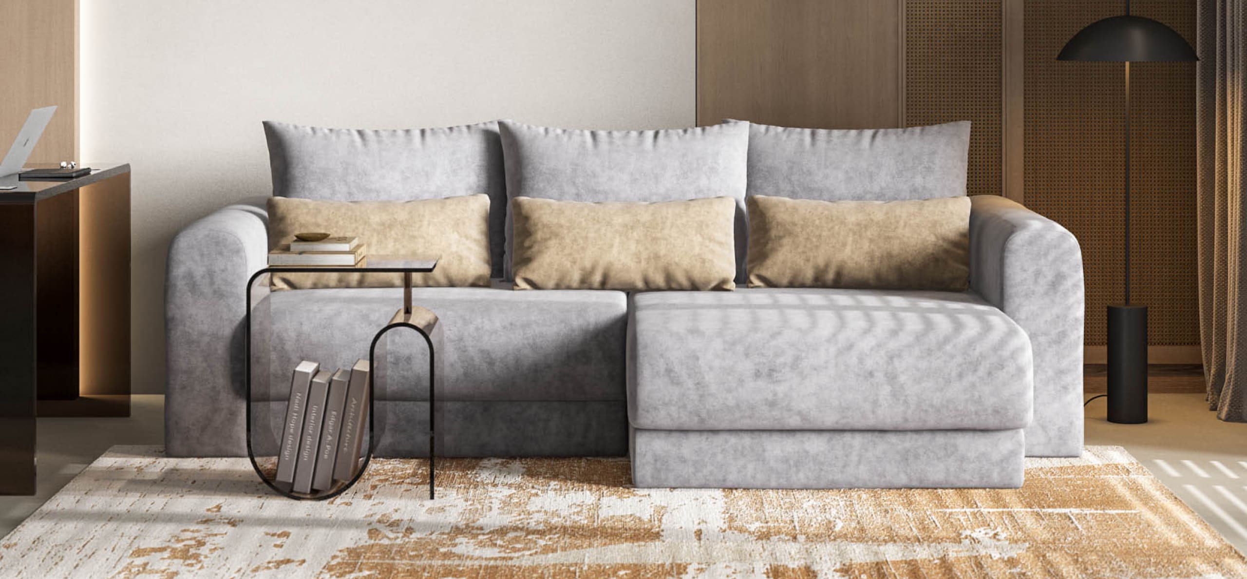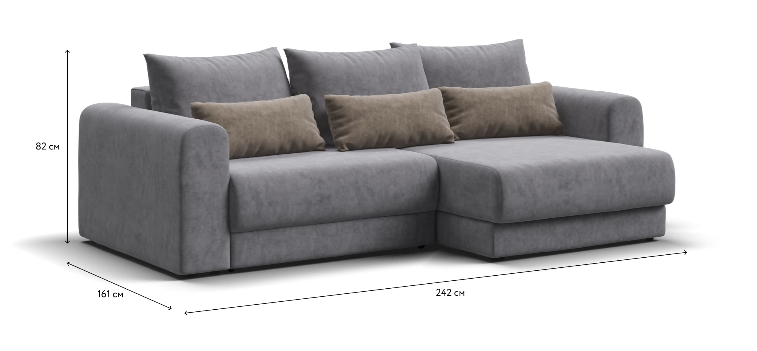 Широкие скругленные подлокотники, плавные линии и приспинные подушки разного размера - стильный комфорт в каждой детали.