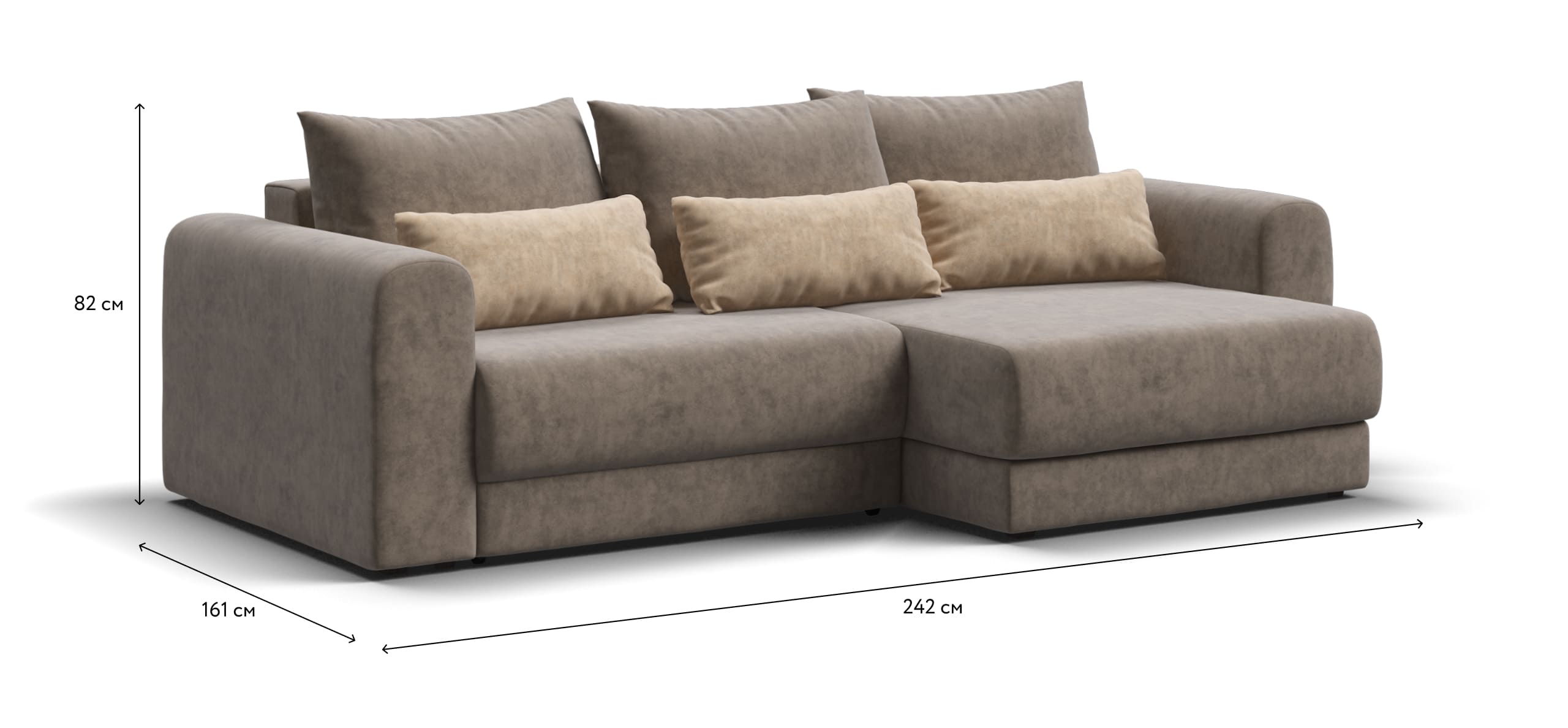 Широкие скругленные подлокотники, плавные линии и приспинные подушки разного размера - стильный комфорт в каждой детали.