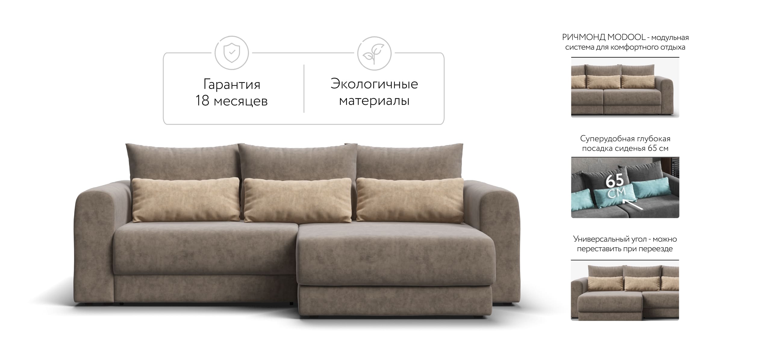 Ричмонд Модуль – Модульная система для комфортного отдыха. Суперудобная глубокая посадка и высокоэластичная пена с дополнительным слоем Периотек создадут максимальный комфорт во время отдыха.