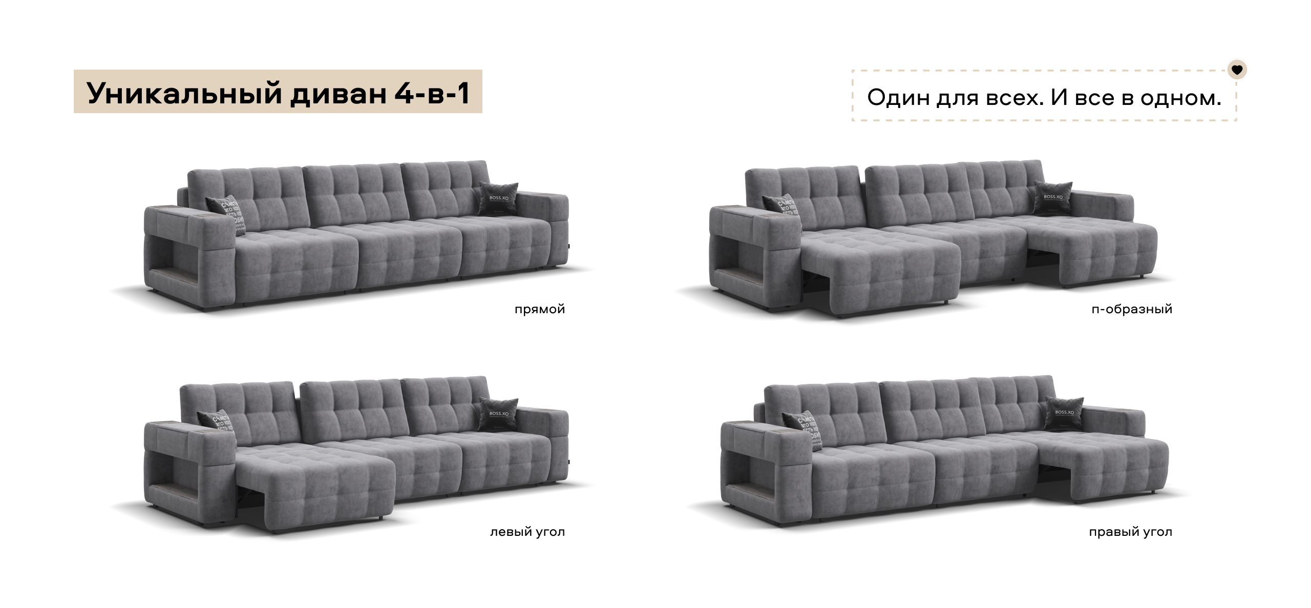 Босс ХО Макс - это и прямой, угловой и П-образный диван сразу, за 10 секунд вы можете превратить его в правый или левый угол, а также в П-образный.
