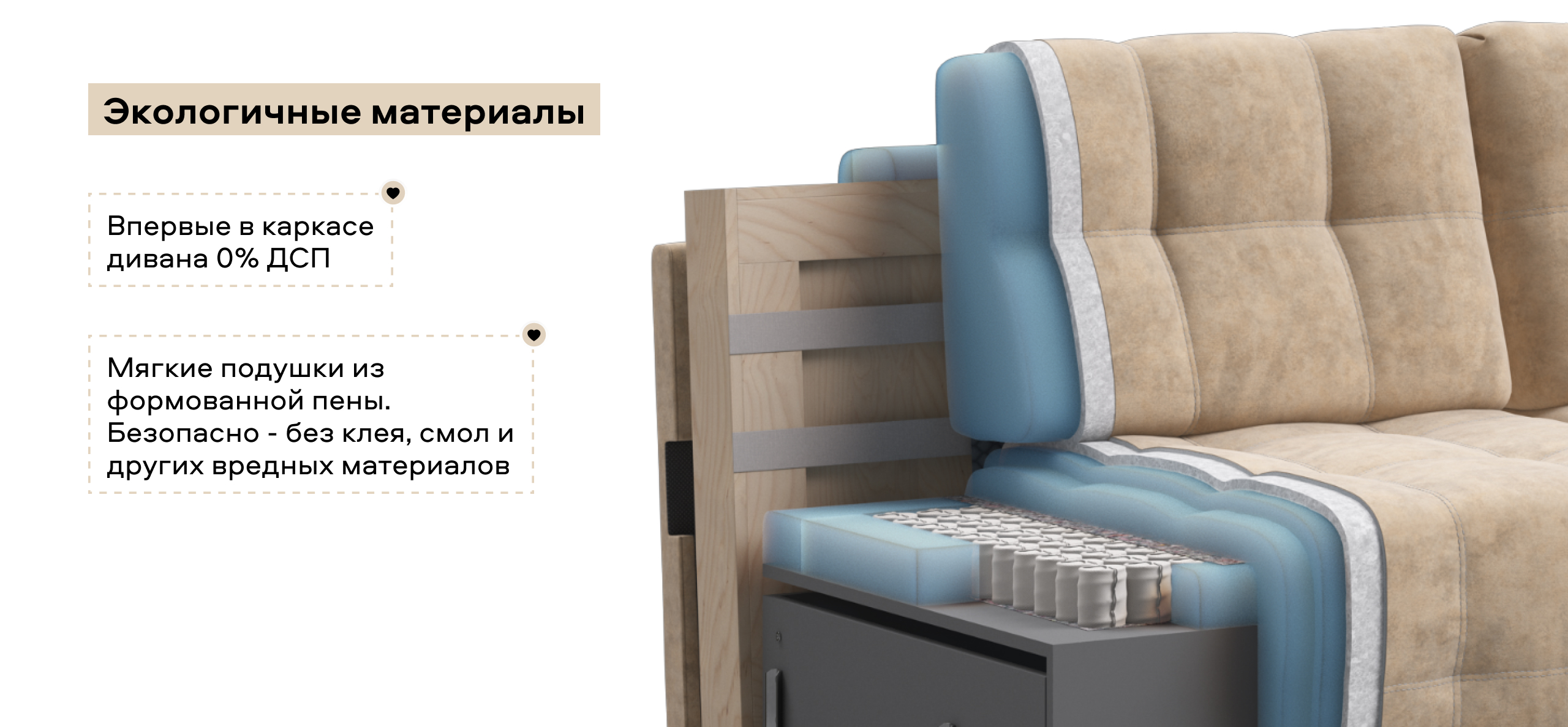 Покупая диван BOSS.XO вы становитесь обладателем уникальных подарков: быстрая зарядка для смартфона, 2 стильных кружки, 2 удобных столика для ноутбука, 2 подушки, комплект запасных накладок на подлокотники, Фул экоручки и средство для чистки Босс Клин.Преимущества материала