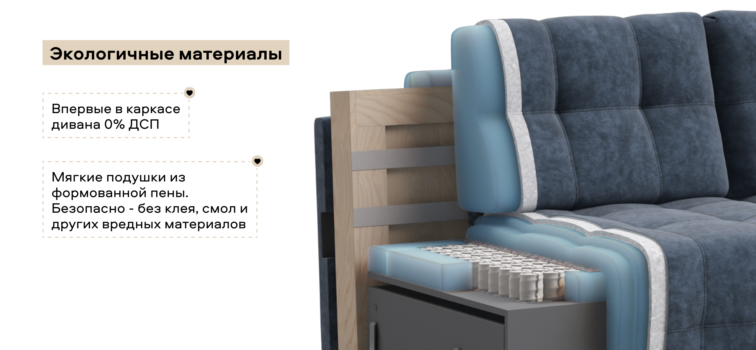 Покупая диван BOSS.XO вы становитесь обладателем уникальных подарков: быстрая зарядка для смартфона, 2 стильных кружки, 2 удобных столика для ноутбука, 2 подушки, комплект запасных накладок на подлокотники, Фул экоручки и средство для чистки Босс Клин.Преимущества материала