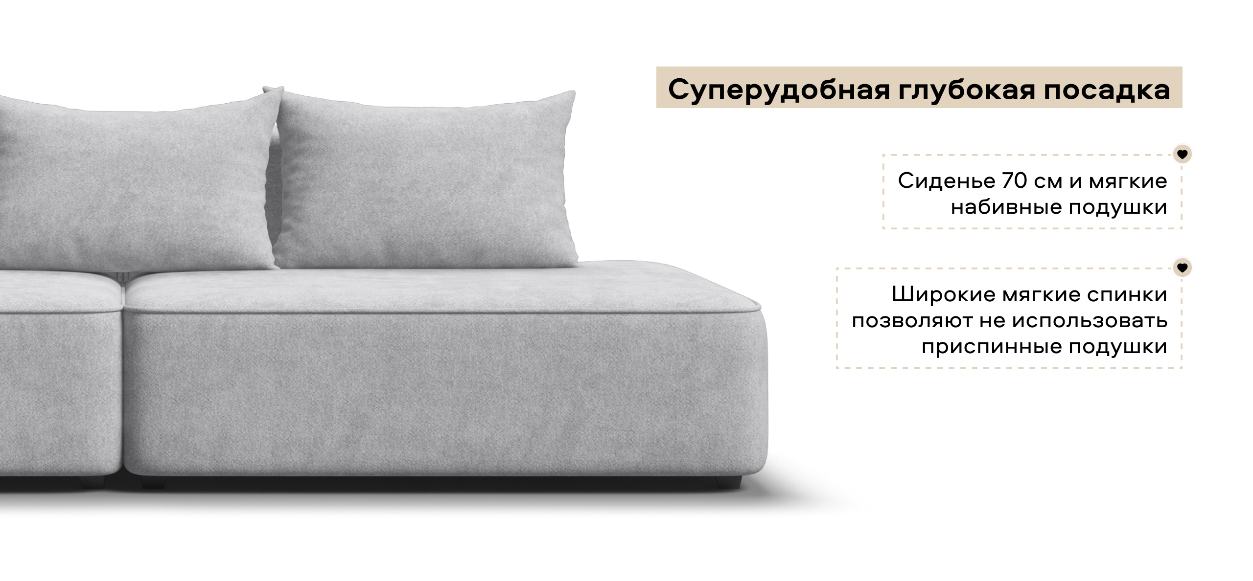 Благодаря инновационной системе креплений и быстросъёмным элементам Вы с лёгкостью можете поменять конфигурацию и адаптировать диван под новое пространство.