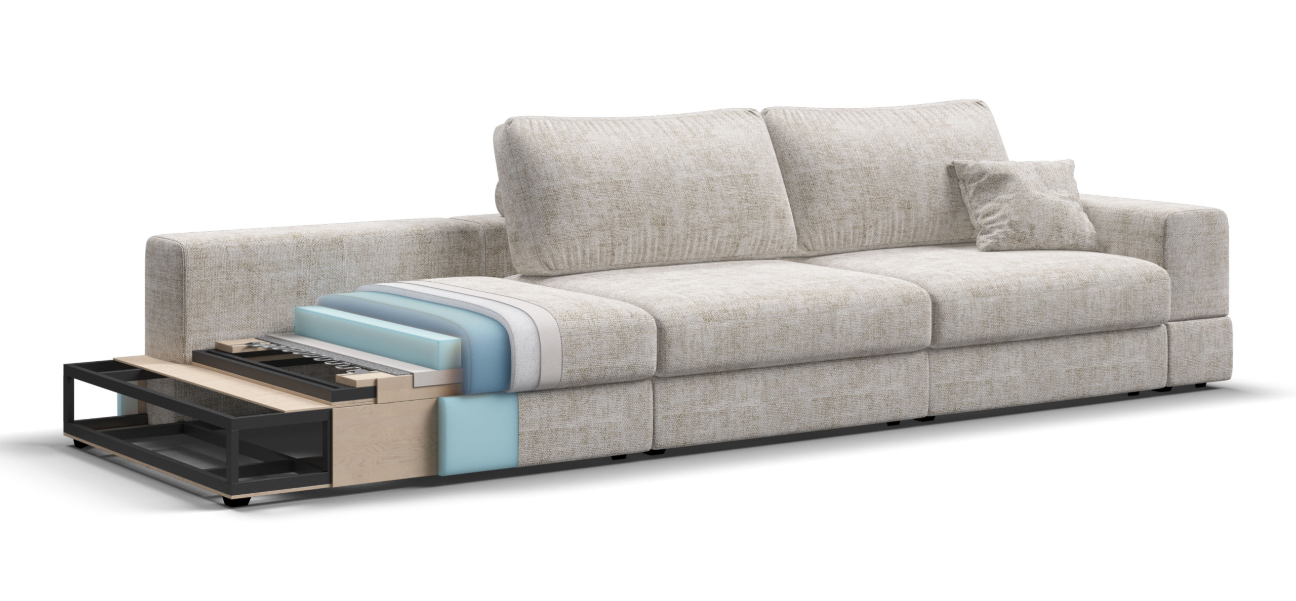 Металлический каркас обеспечивает долговечность и надежность. Диван выполнен с учетом последних требований в области экологии – не содержит ЛДСП, бельевые ящики из биоразлагаемого текстиля. Съёмные аксессуары помогут настроить необходимый вам функционал.
