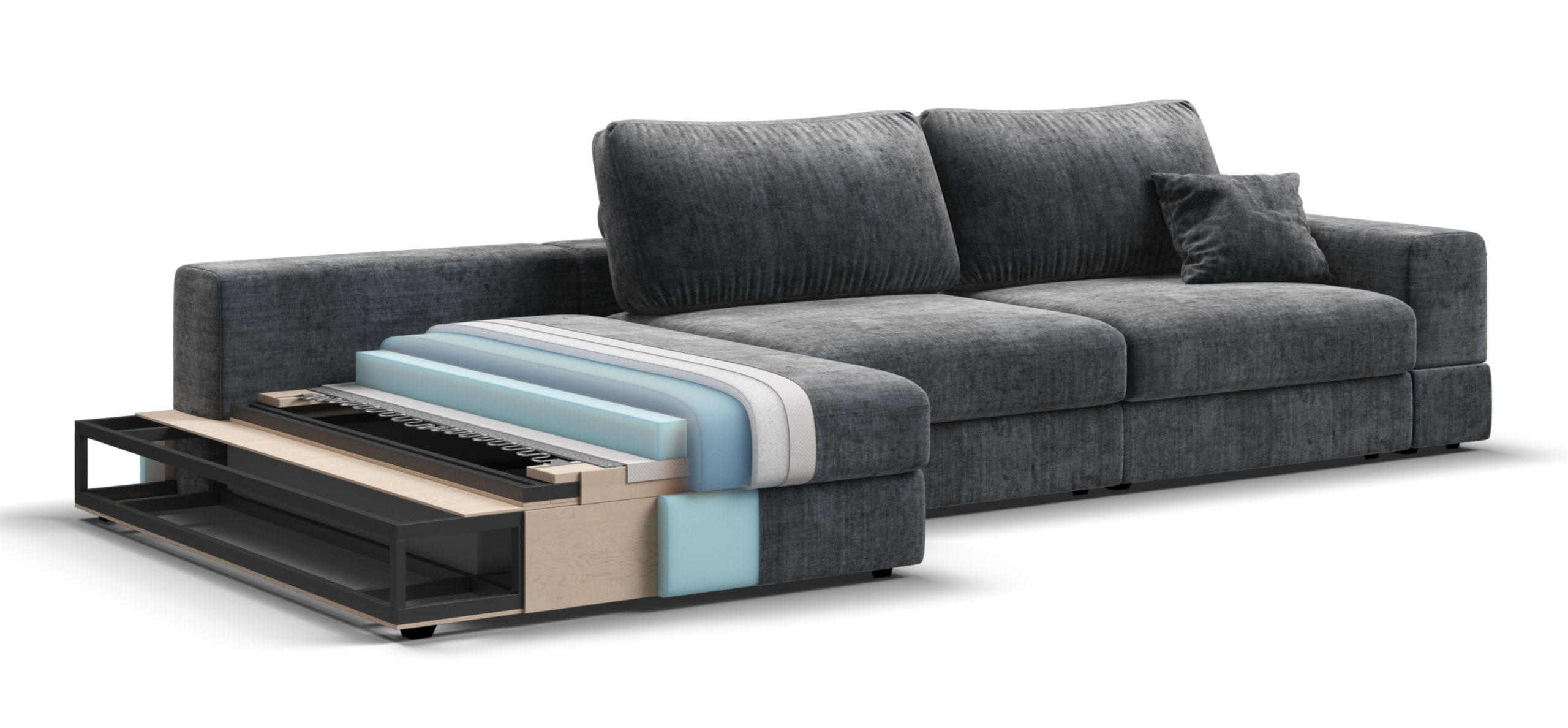 Металлический каркас обеспечивает долговечность и надежность. Диван выполнен с учетом последних требований в области экологии – не содержит ЛДСП, бельевые ящики из биоразлагаемого текстиля. Съёмные аксессуары помогут настроить необходимый вам функционал.