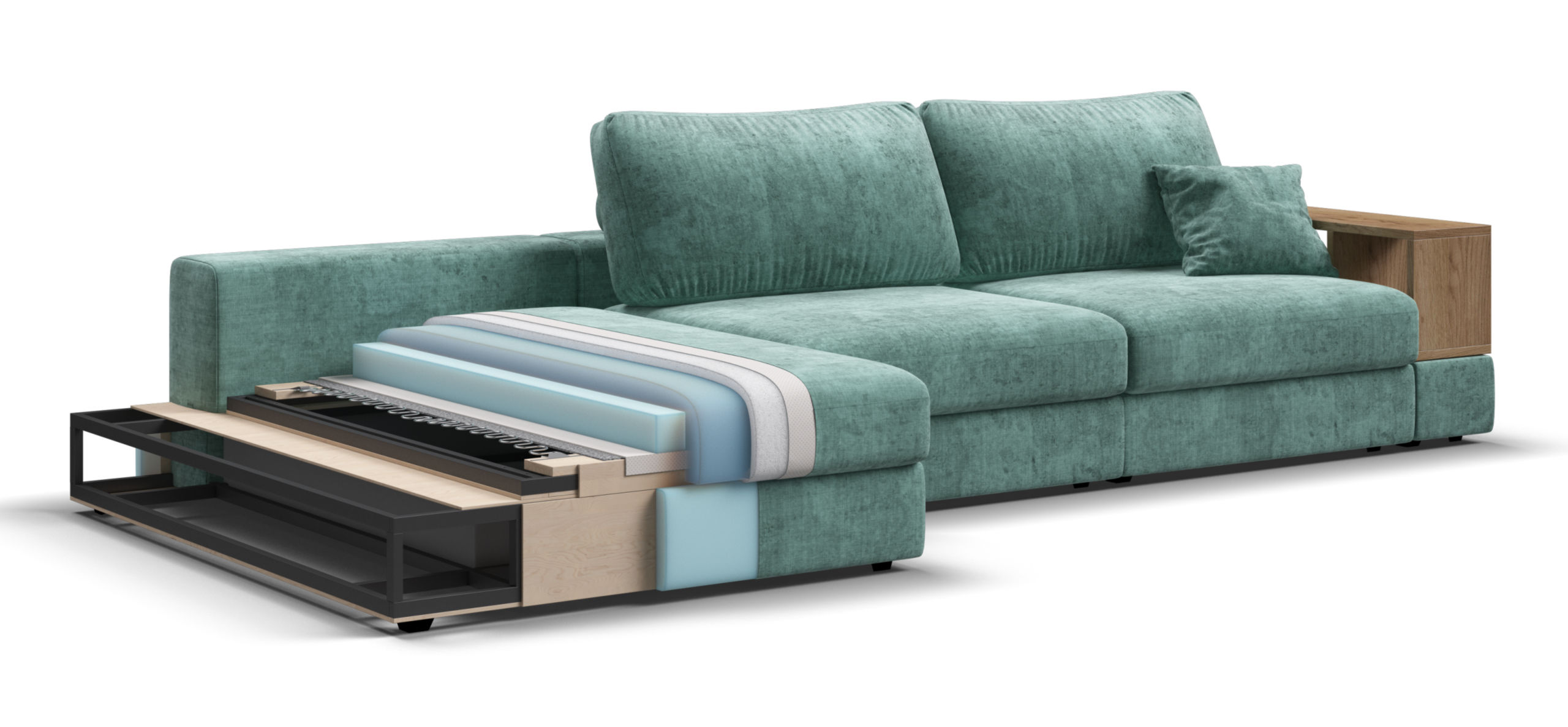 Металлический каркас обеспечивает долговечность и надежность. Диван выполнен с учетом последних требований в области экологии – не содержит ЛДСП, бельевые ящики из биоразлагаемого текстиля. Съёмные аксессуары помогут настроить необходимый вам функционал.