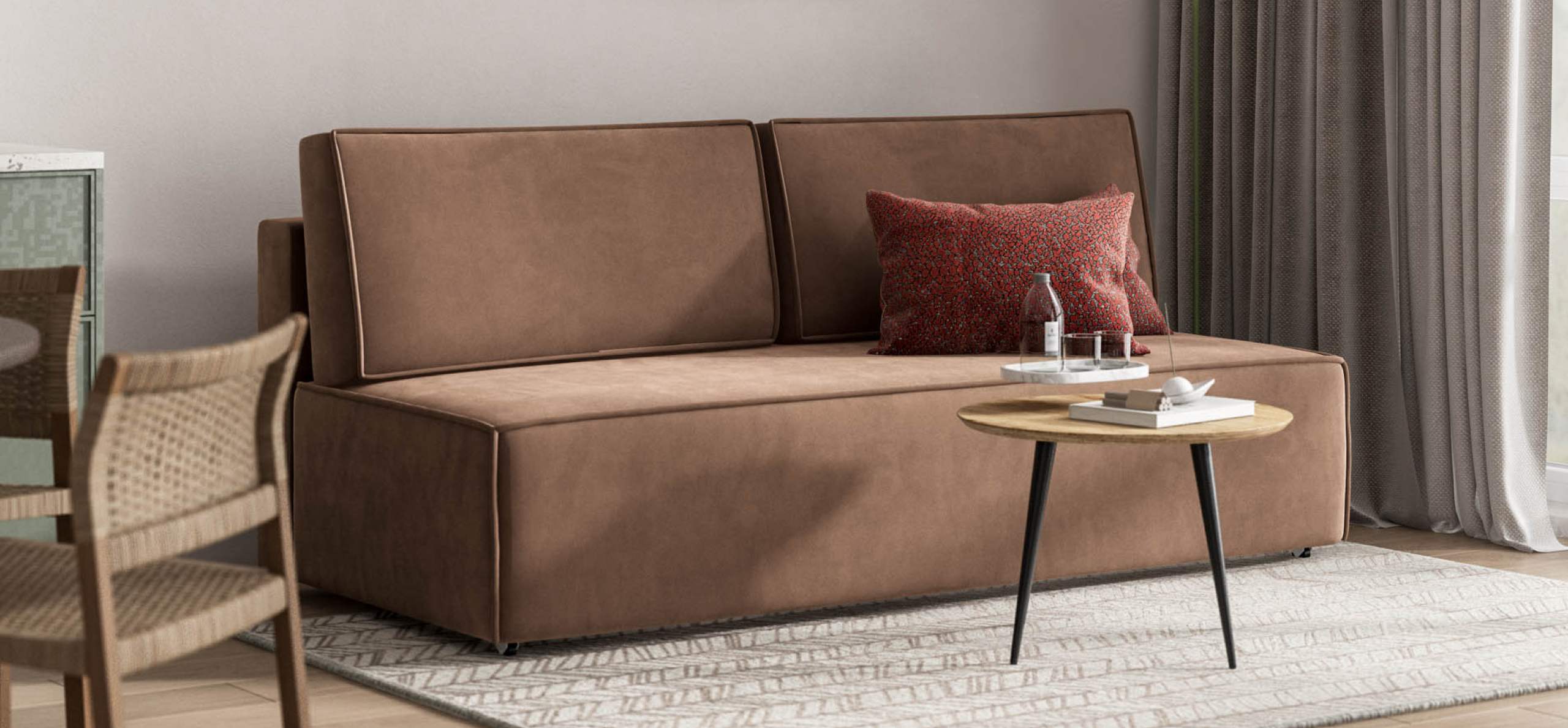 Диван Норд мини благодаря отсутствию подлокотников подойдет даже для небольшого помещения. Строгая симметрия, минималистичная отделка идеально дополнит современный интерьер в стиле лофт, а стильный декоративный кант по периметру подчеркнет исключительный вкус владельца.