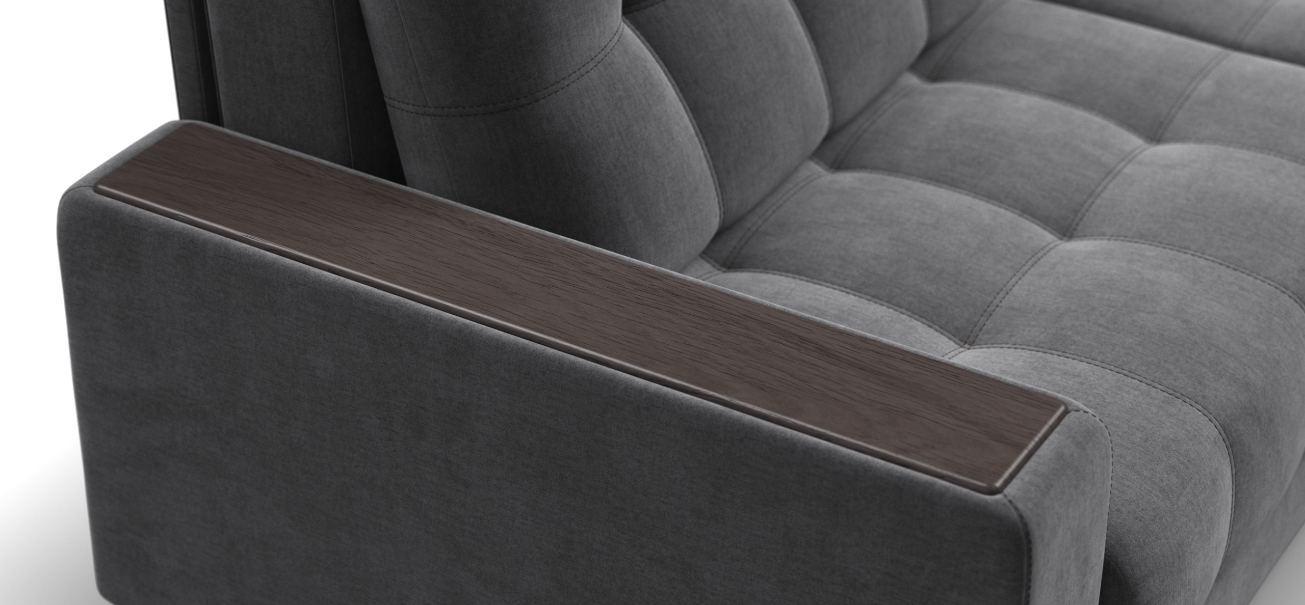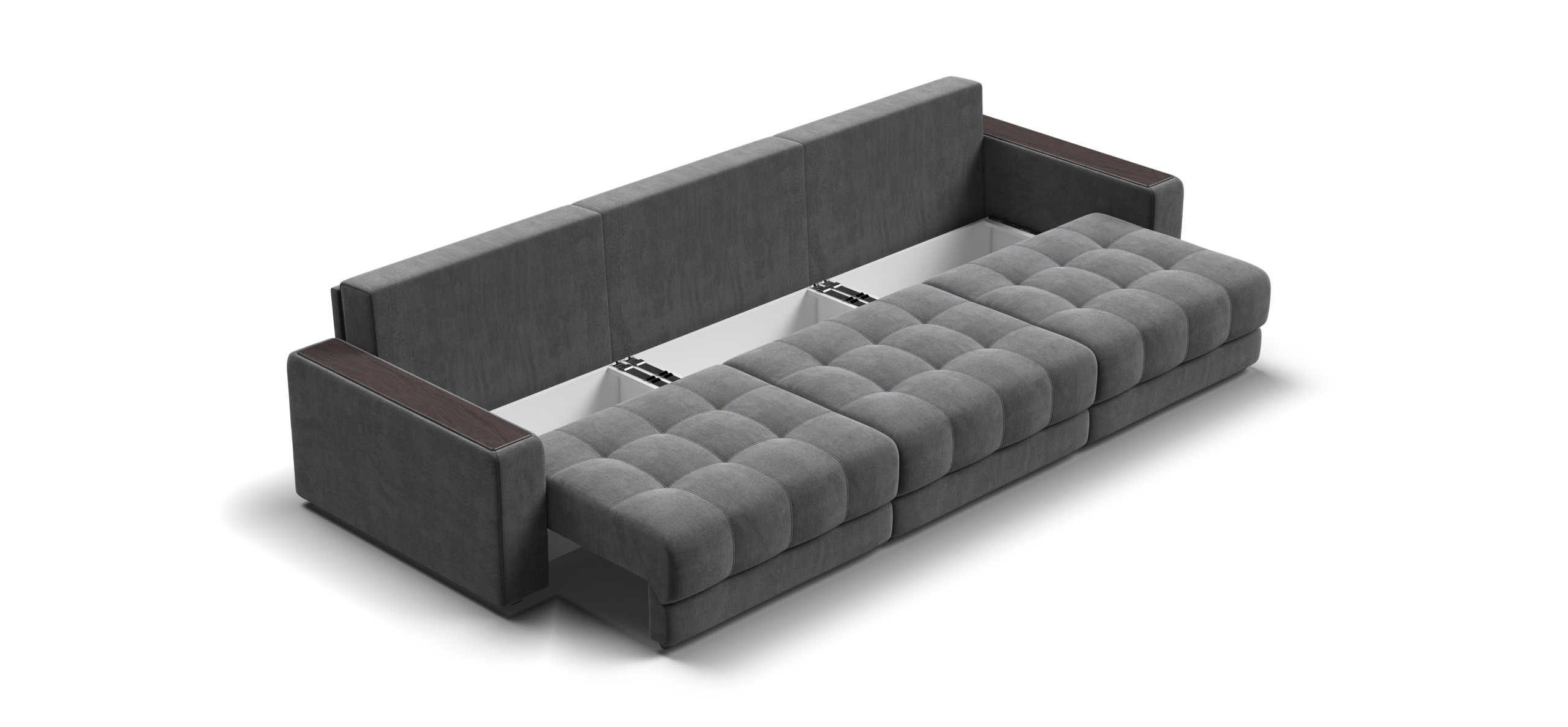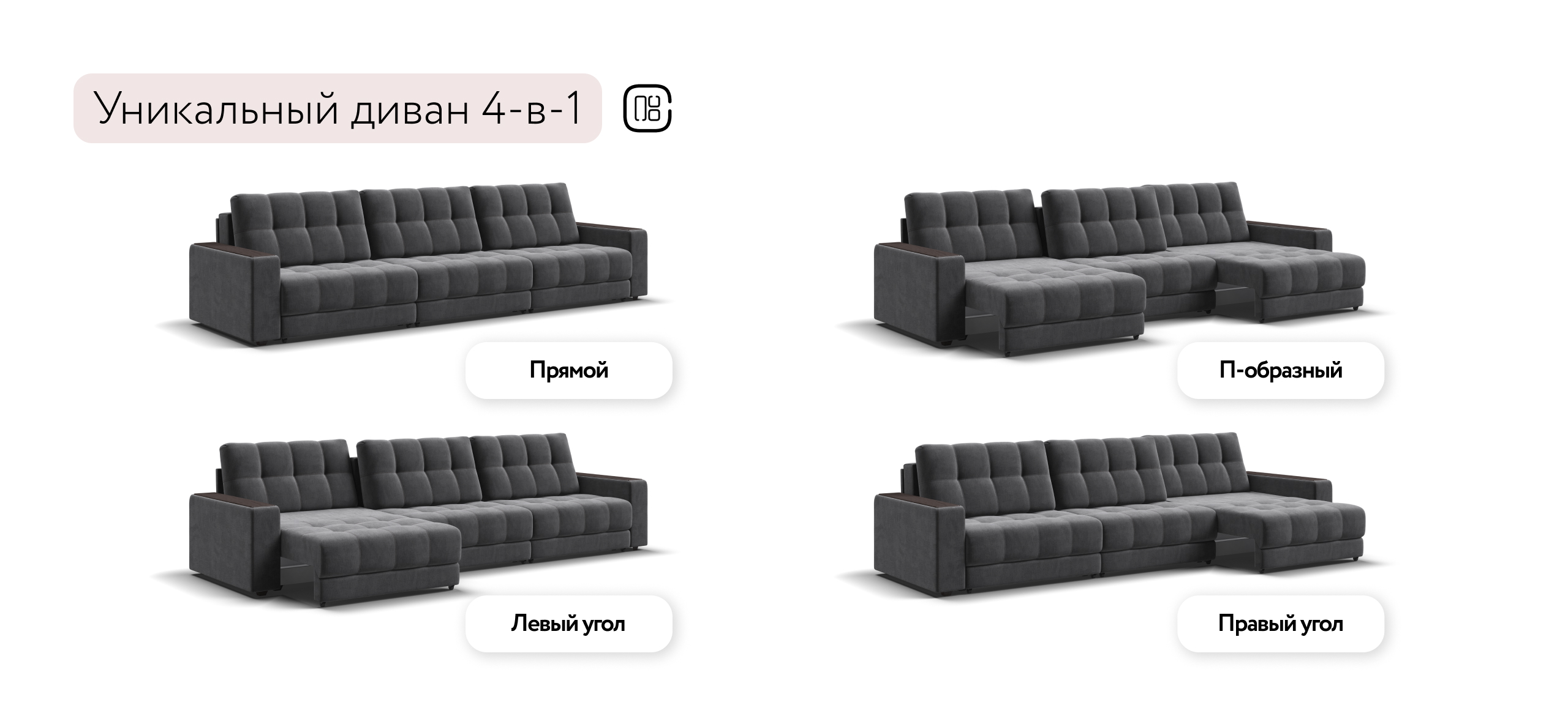 Каждое посадочное место выдвигается вперед и можно получить диван с правым или левым углом, а также получить П-образную форму дивана.