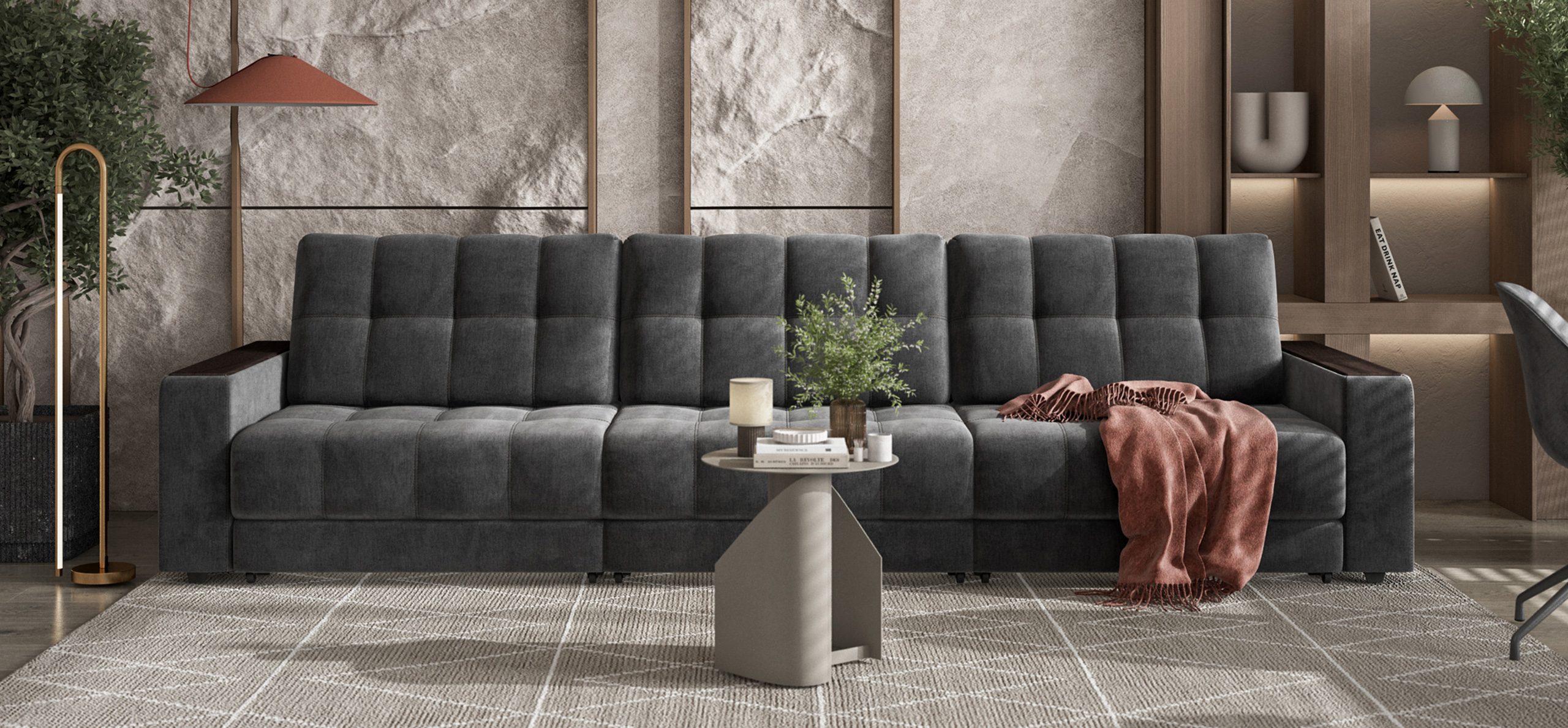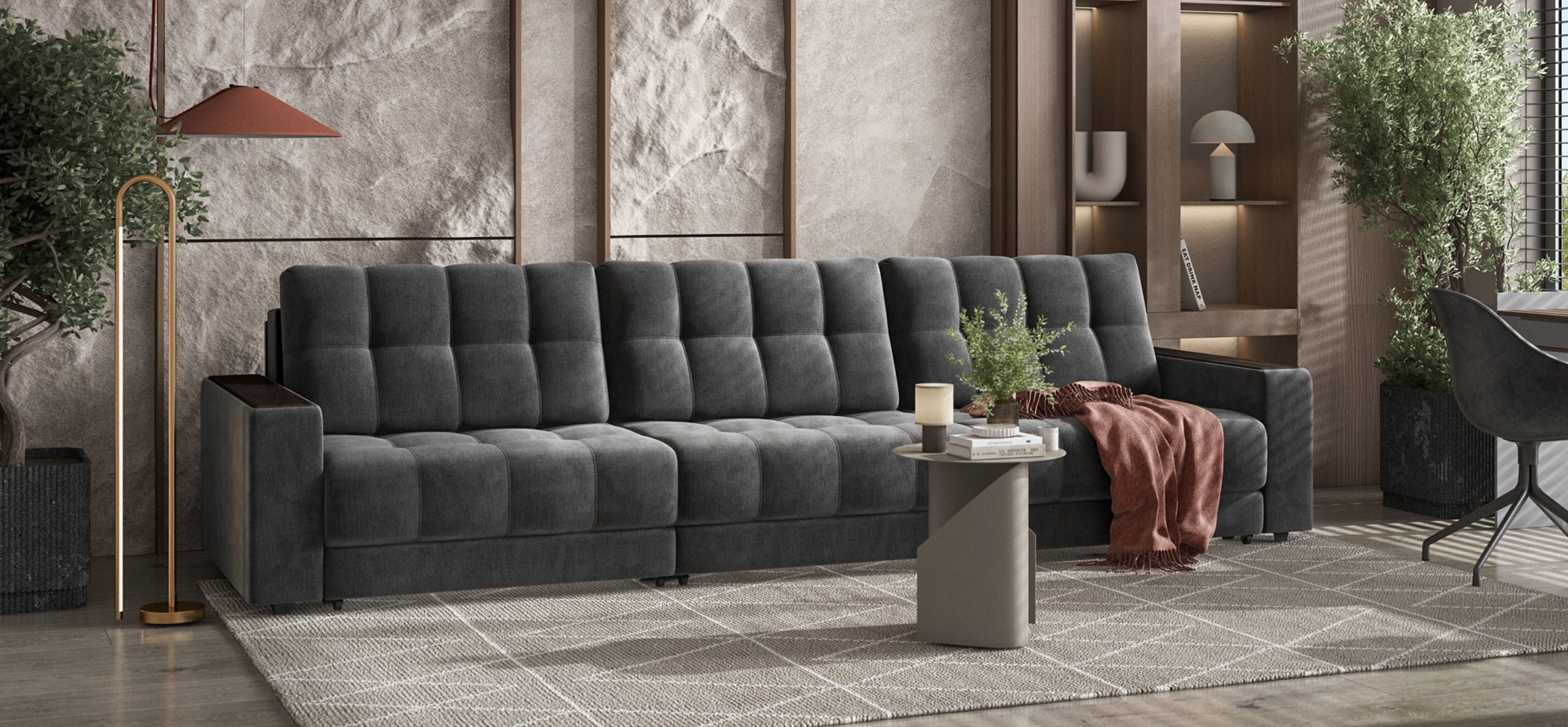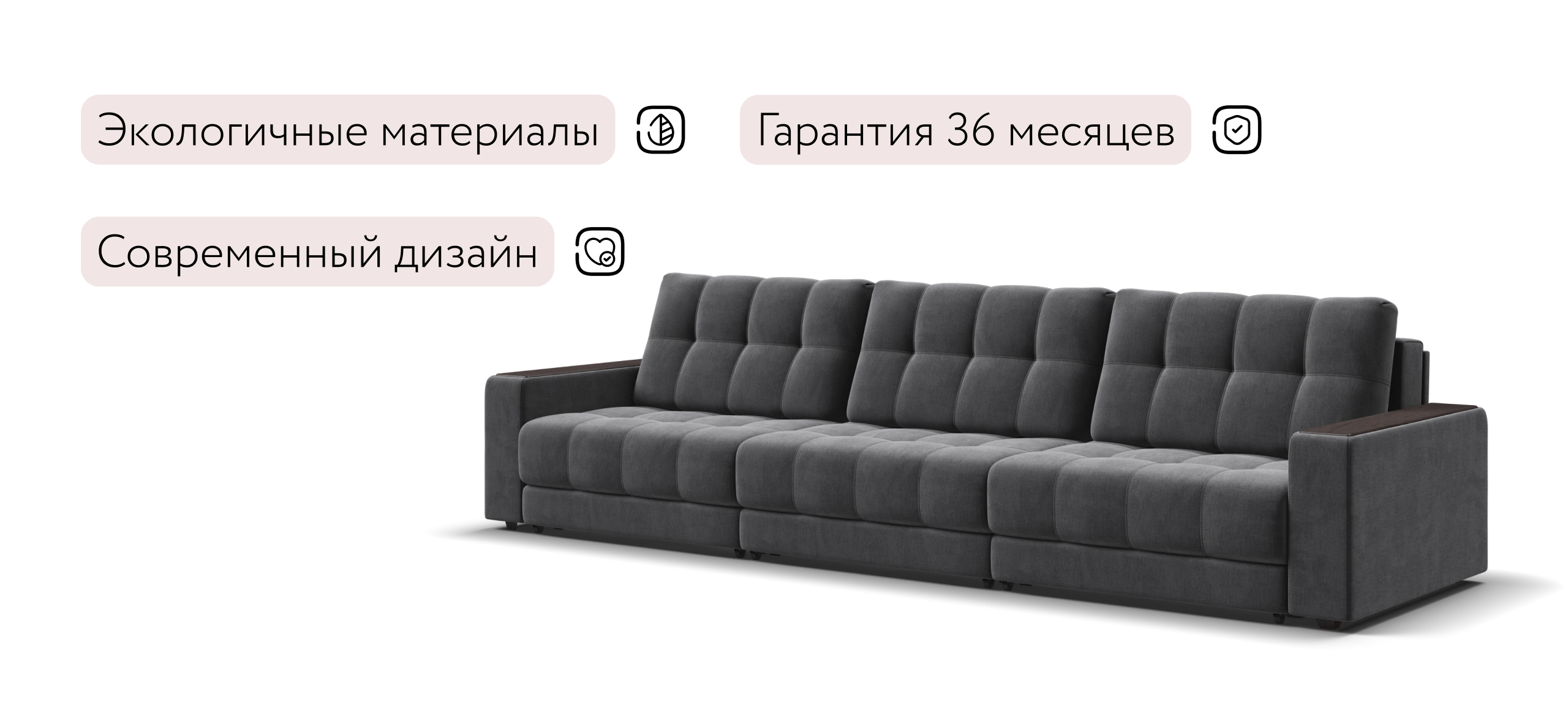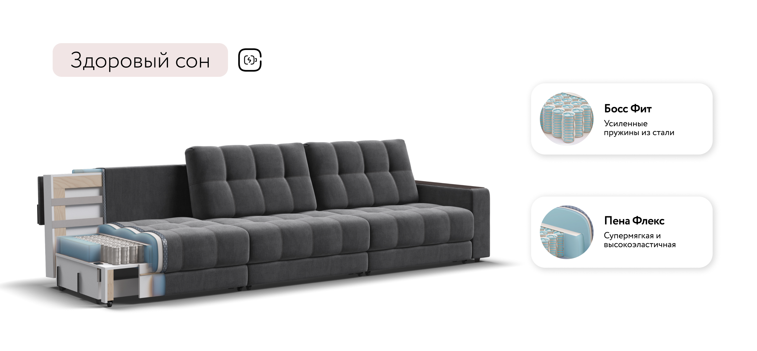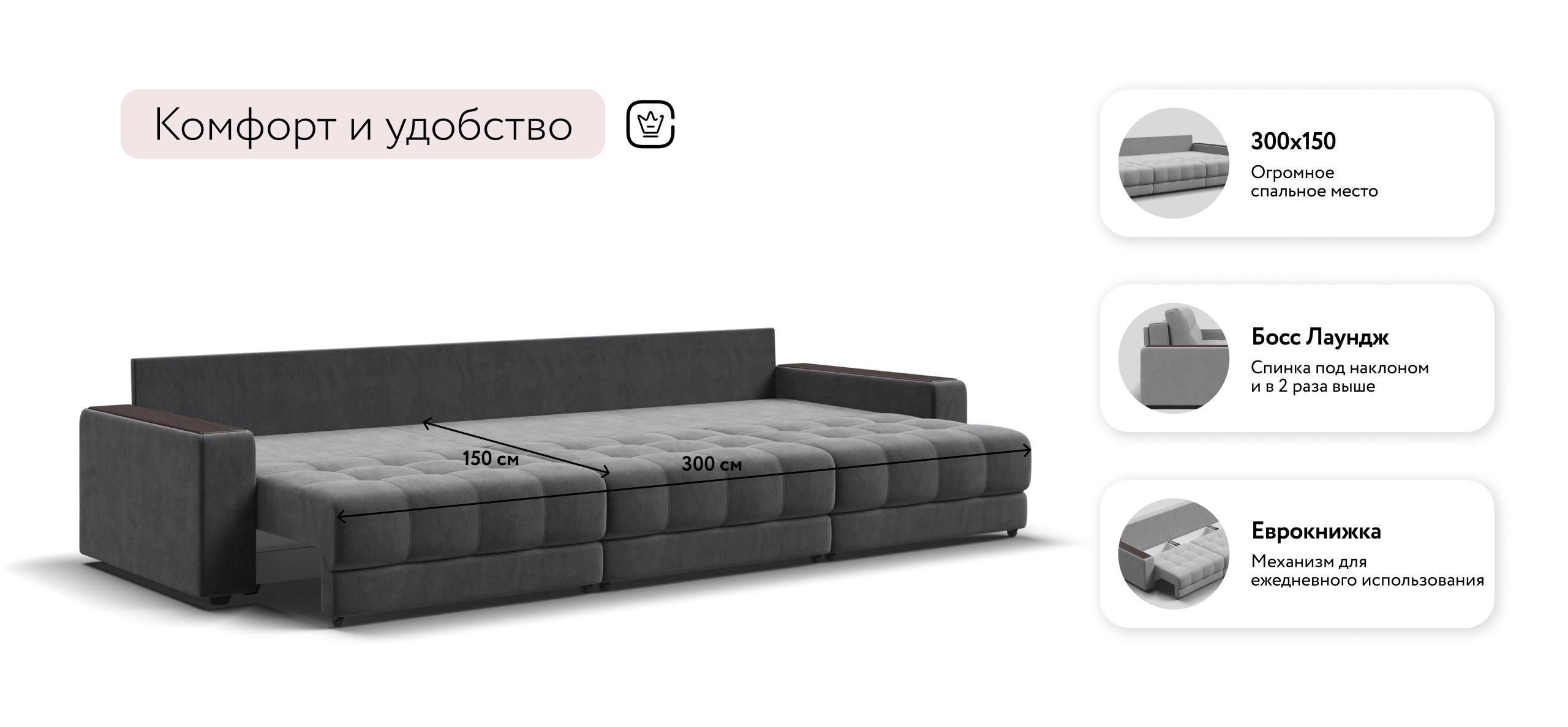 Диван Босс Гранд - большой, стильный и комфортный диван, предназначенный для просторной комнаты. Продуманный до мелочей диван Босс сочетает в себе надежный каркас, мягкие ткани, многофункциональность и быструю сборку за 1 минуту без инструментов - ощутите комфорт у себя дома!