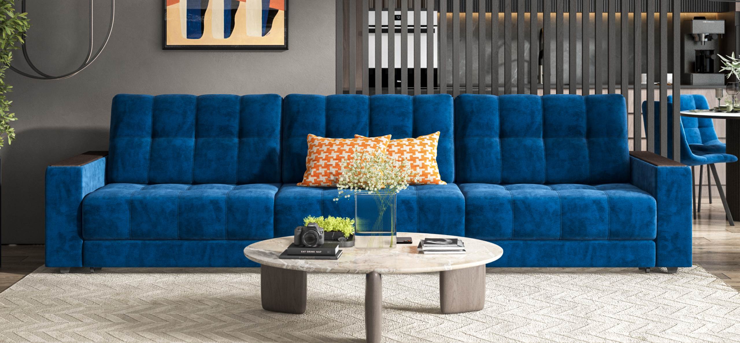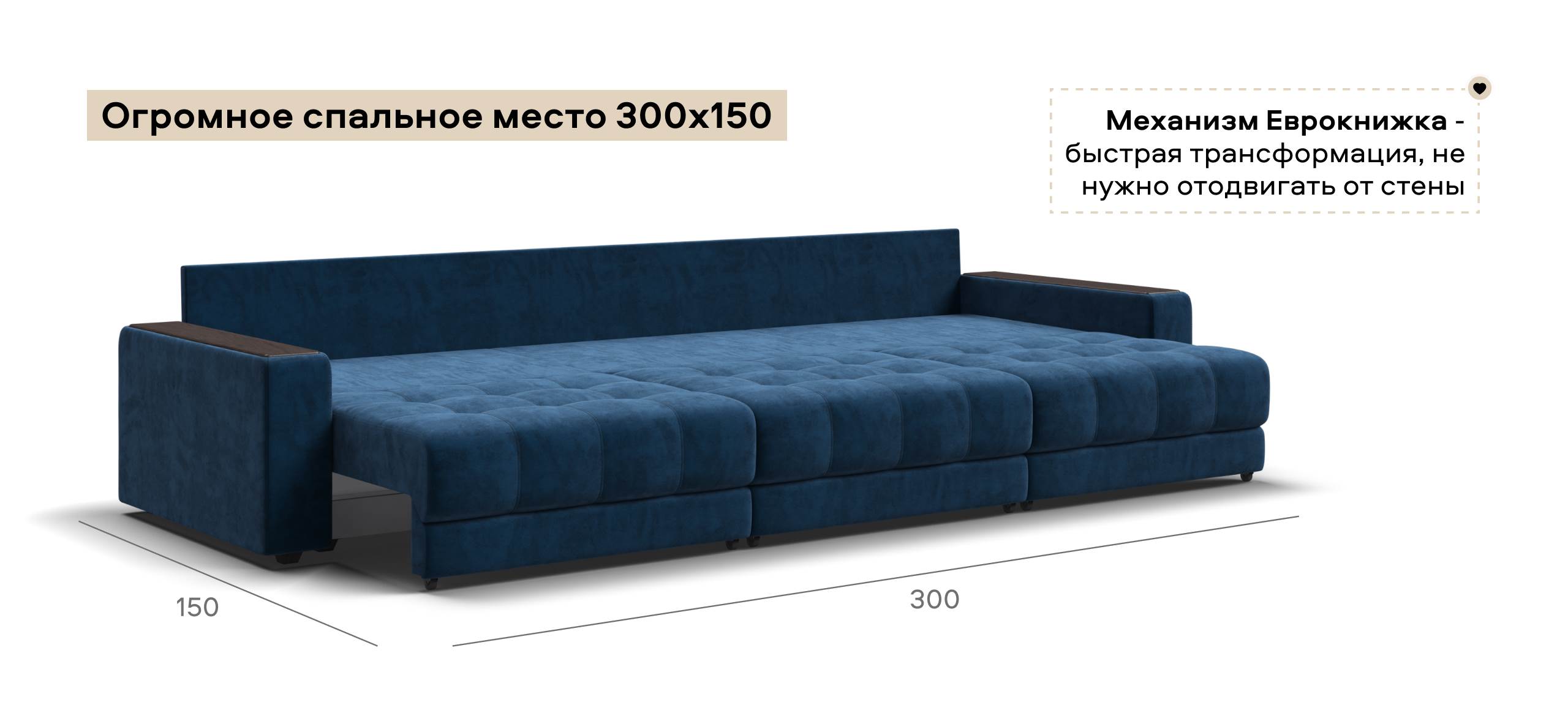 Диван Босс Гранд - большой, стильный и комфортный диван, предназначенный для просторной комнаты. Продуманный до мелочей диван Босс сочетает в себе надежный каркас, мягкие ткани, многофункциональность и быструю сборку за 1 минуту без инструментов - ощутите комфорт у себя дома!