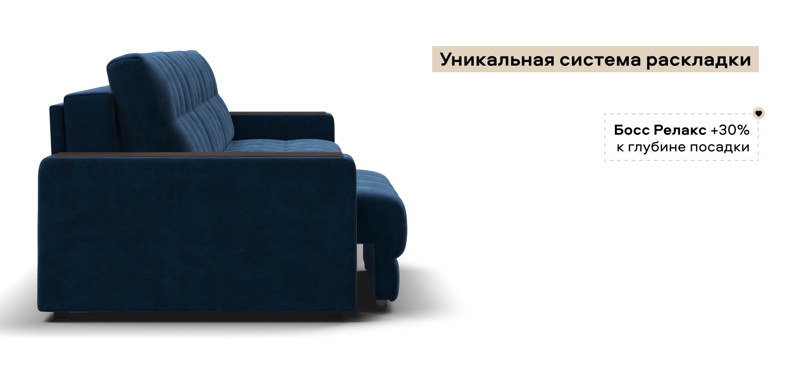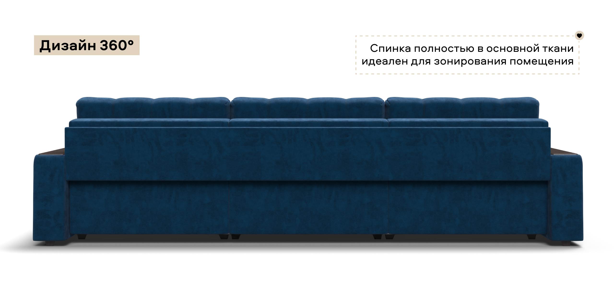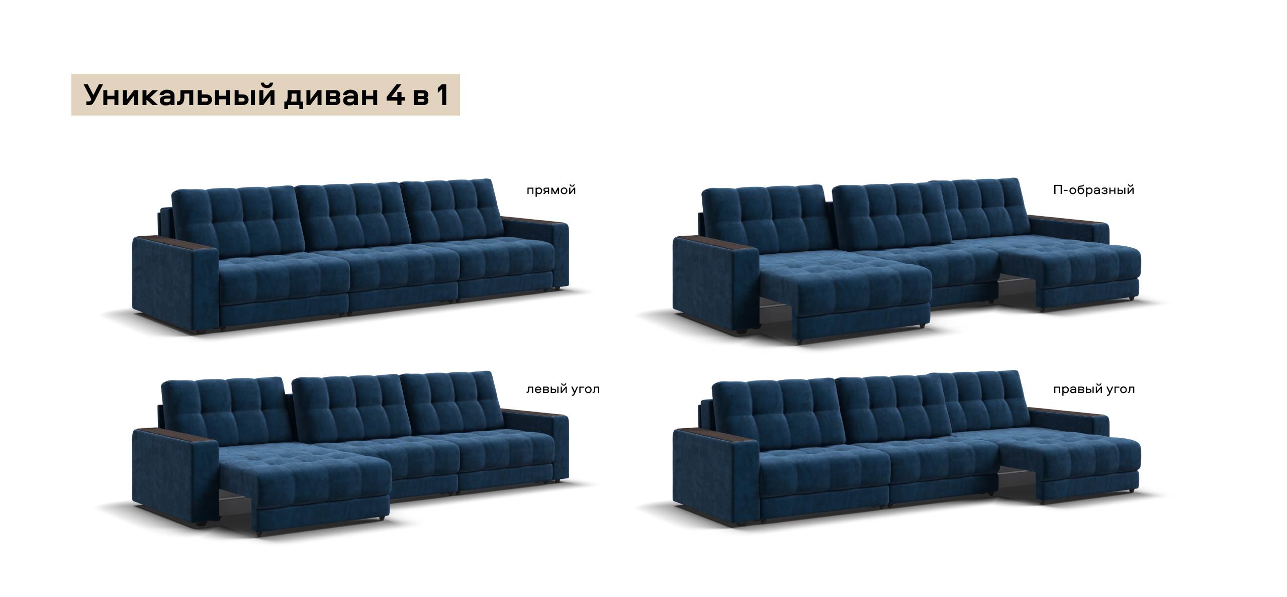 Каждое посадочное место выдвигается вперед и можно получить диван с правым или левым углом, а также получить П-образную форму дивана.