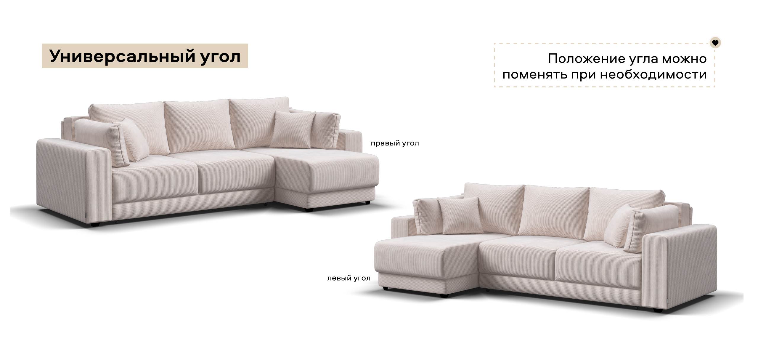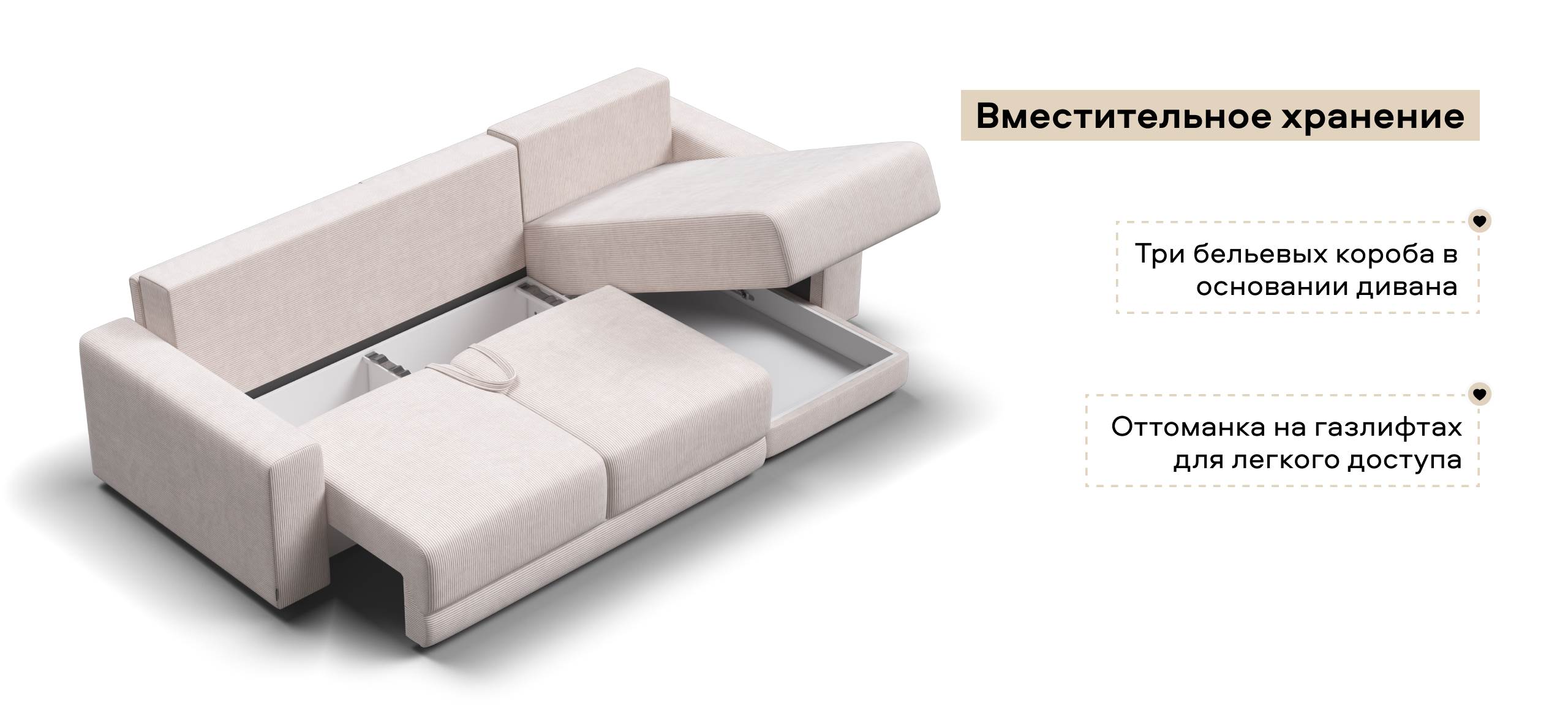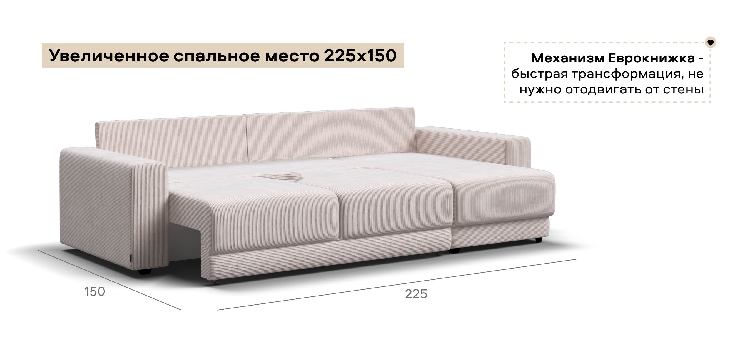 Оснащённый независимым пружинным блоком и высокоэластичной пеной Эластик Фоам с дополнительным слоем периотека, диван гарантирует анатомическую поддержку и комфортный сон. Простой и надёжный механизм трансформации «еврокнижка» позволяет легко преобразовать диван в просторное спальное место. Универсальный угол позволит Вам переставить оттоманку и поменять положение угла при необходимости.
