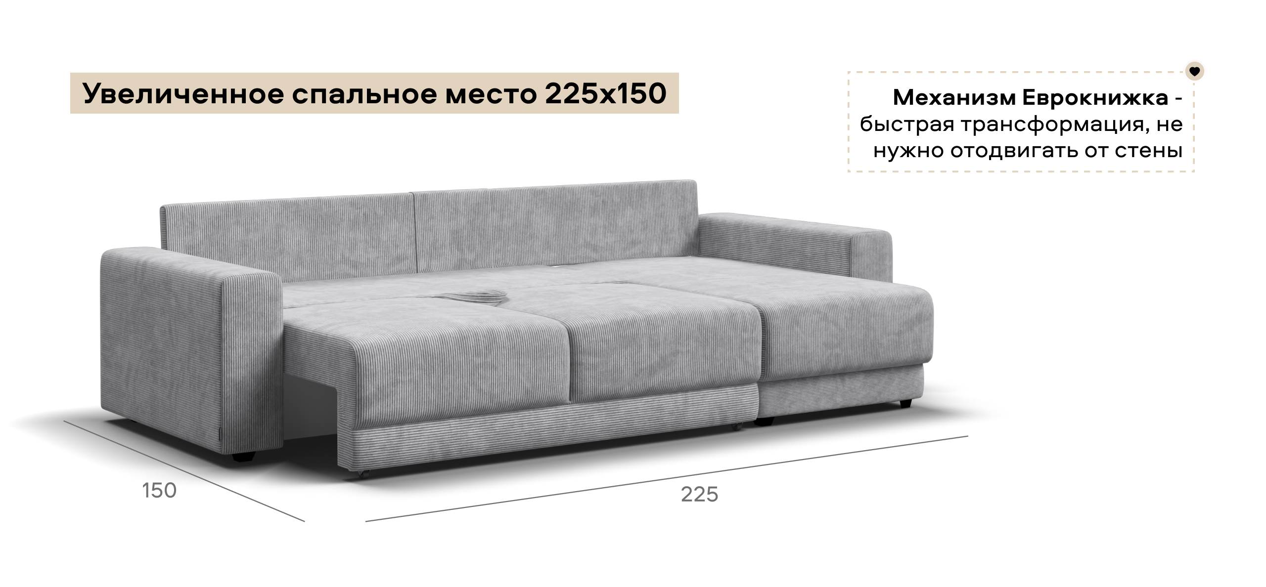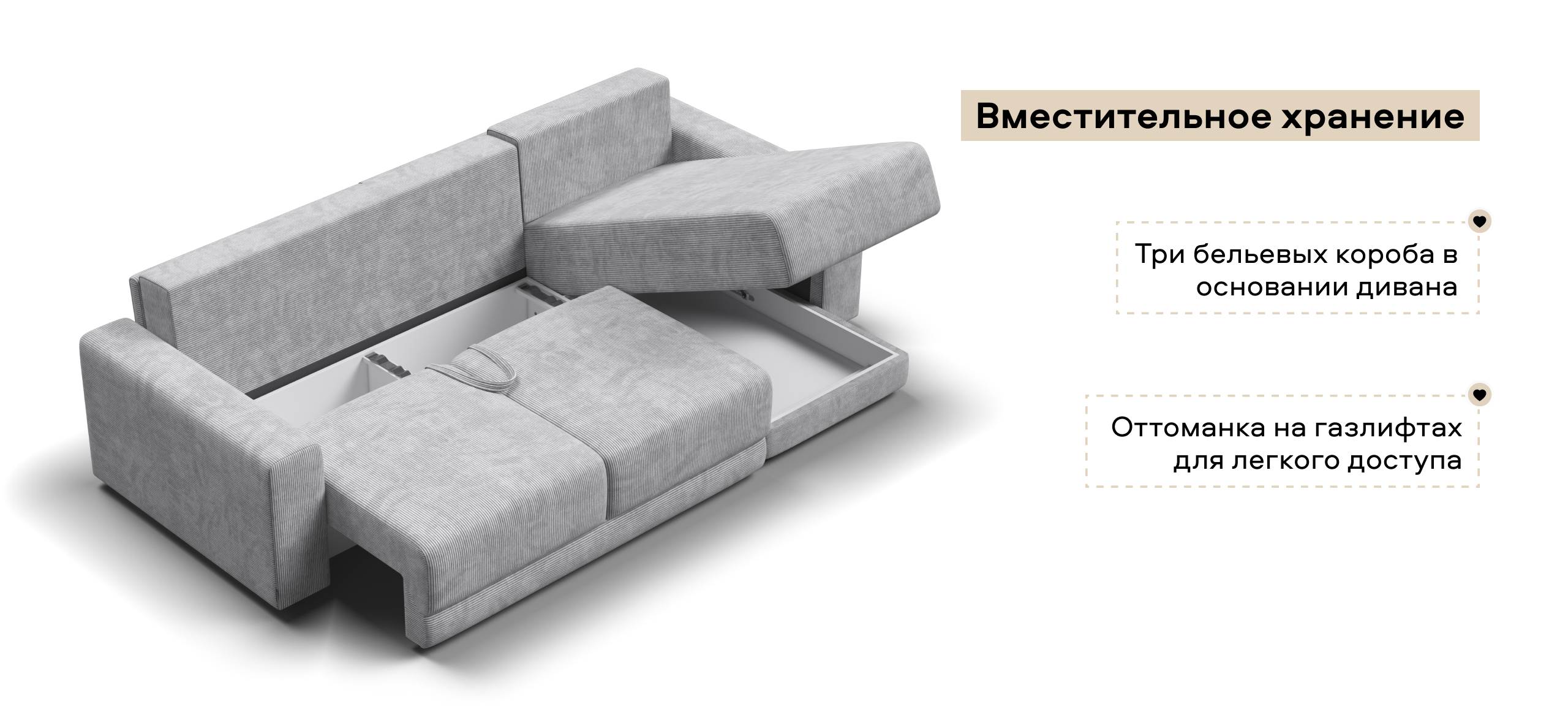 Оснащённый независимым пружинным блоком и высокоэластичной пеной Эластик Фоам с дополнительным слоем периотека, диван гарантирует анатомическую поддержку и комфортный сон. Простой и надёжный механизм трансформации «еврокнижка» позволяет легко преобразовать диван в просторное спальное место. Универсальный угол позволит Вам переставить оттоманку и поменять положение угла при необходимости.