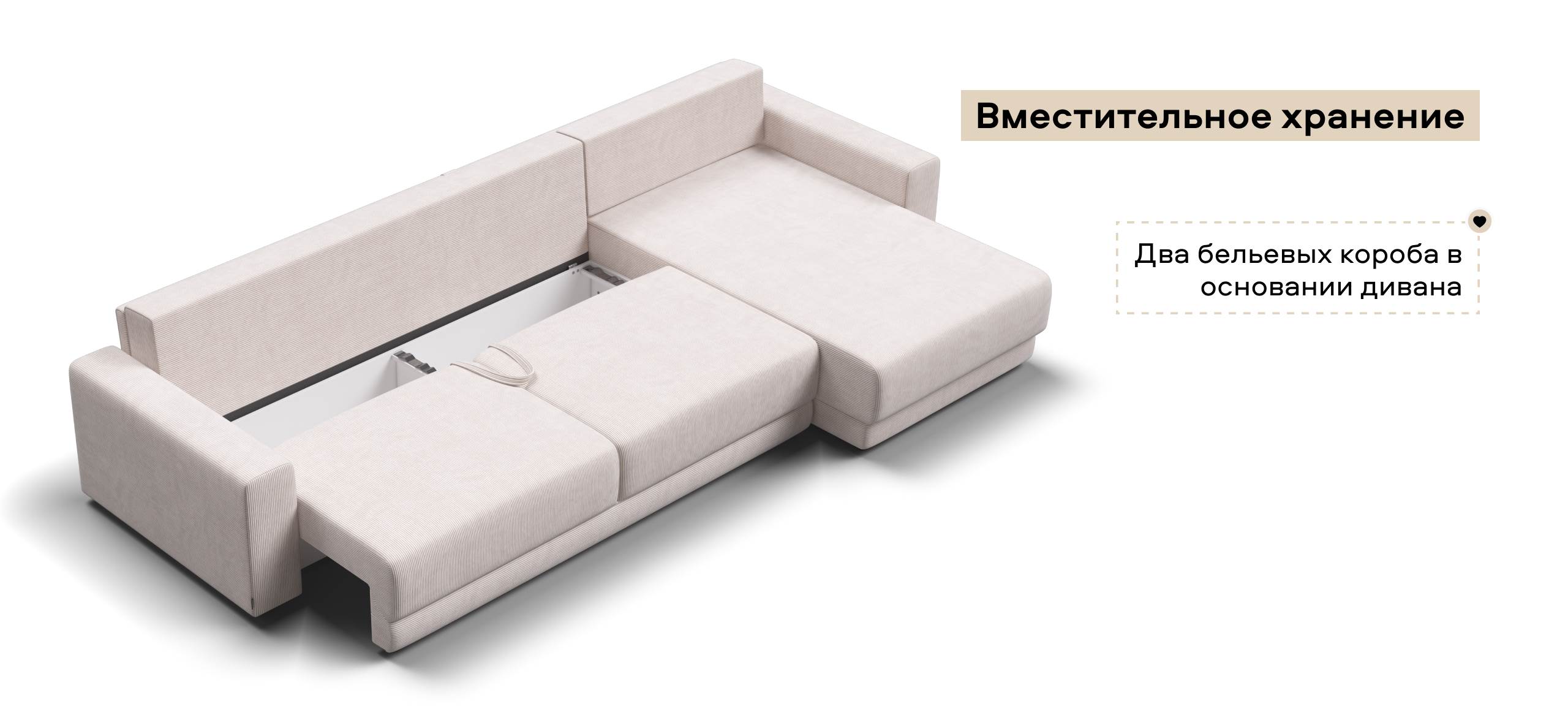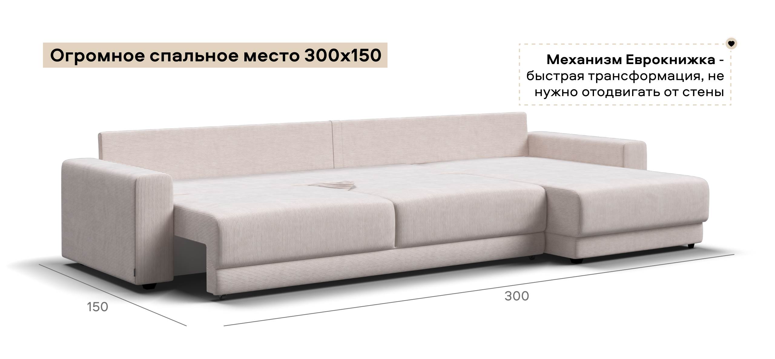 Оснащённый независимым пружинным блоком и высокоэластичной пеной Эластик Фоам с дополнительным слоем периотека, диван гарантирует анатомическую поддержку и комфортный сон. Простой и надёжный механизм трансформации «еврокнижка» позволяет легко преобразовать диван в просторное спальное место. Универсальный угол позволит Вам переставить оттоманку и поменять положение угла при необходимости.