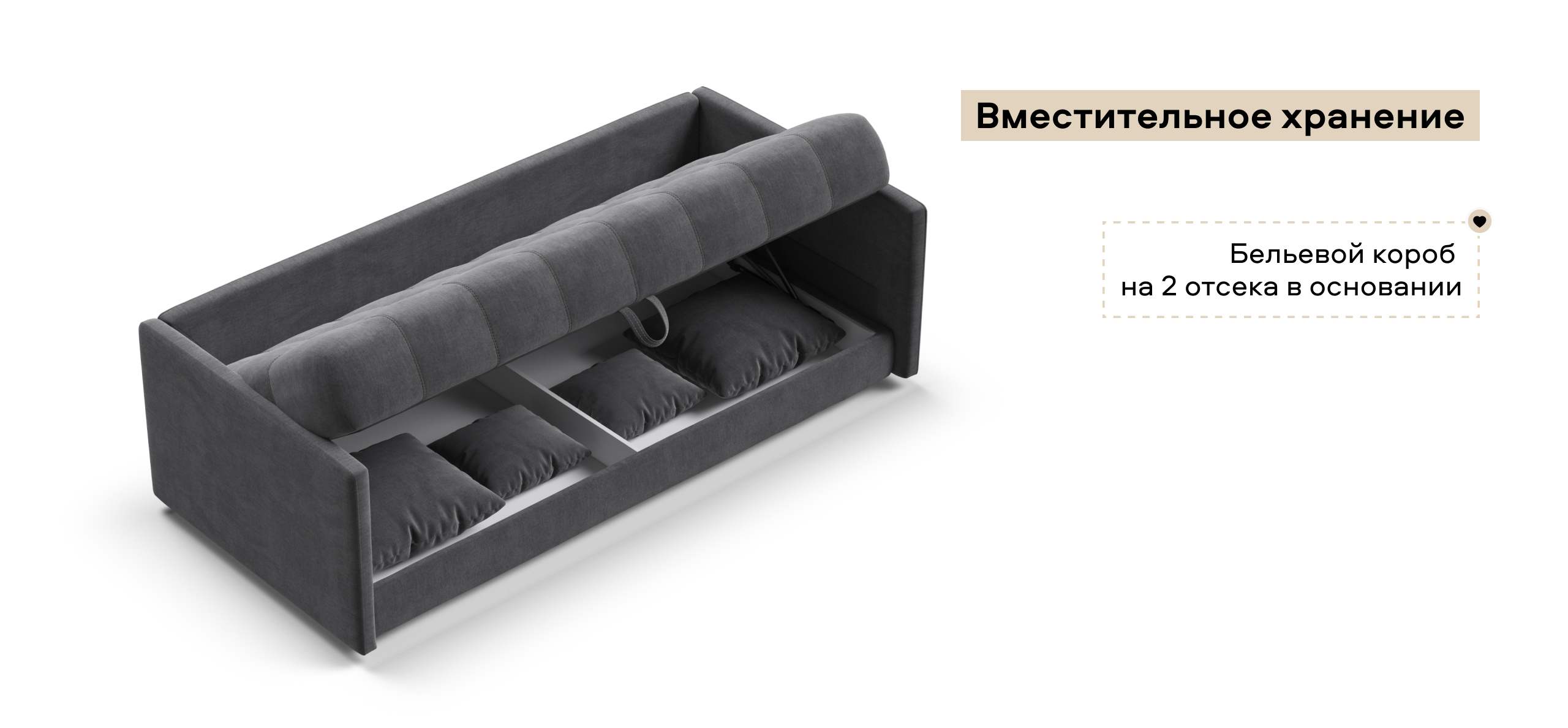 Вместительный бельевой короб в основании позволит Вам убрать на ночь приспинные подушки, а днем хранить постельные принадлежности.