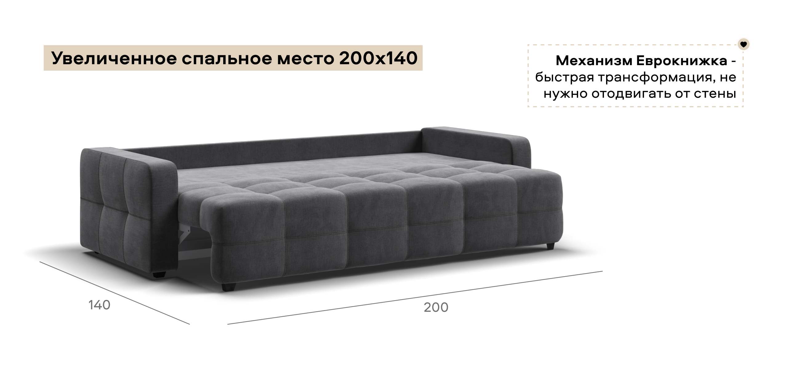 Простой и надежный механизм трансформации еврокнижка позволяет с легкостью раскладывать диван в удобную, полноценную, двуспальную кровать с идеально ровным спальным местом.