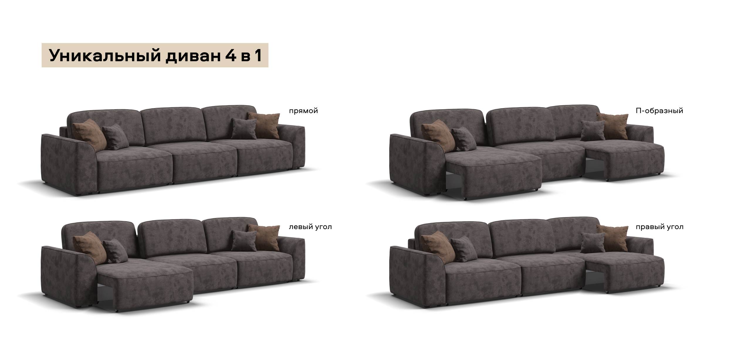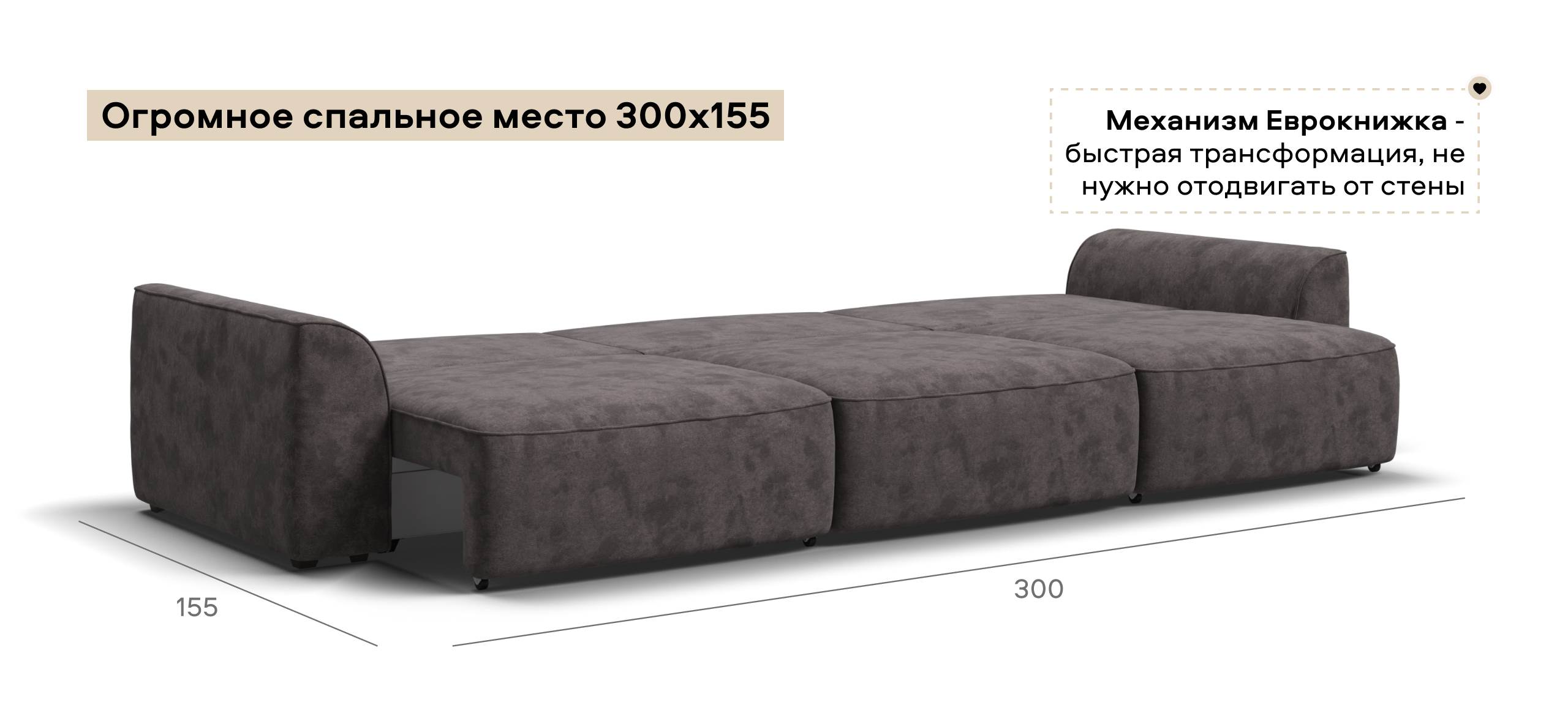 Приглашайте в гости большую компанию - диван вместит всех! Каждое посадочное место можно выдвинуть вперед и получить диван с правым или левым углом, а также получить П-образную форму дивана. А в разложенном виде диван превращается в огромное спальное место.