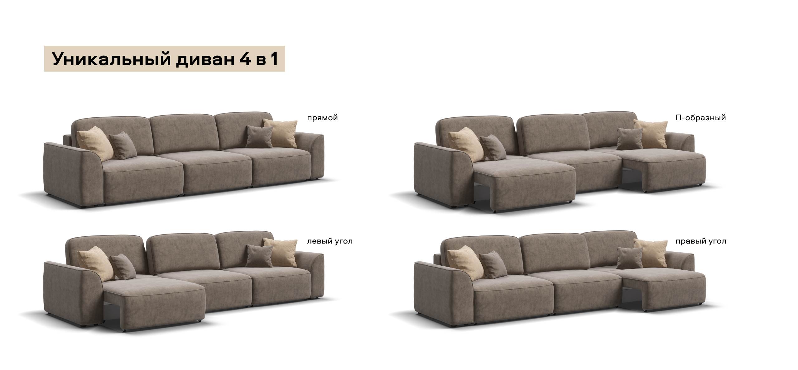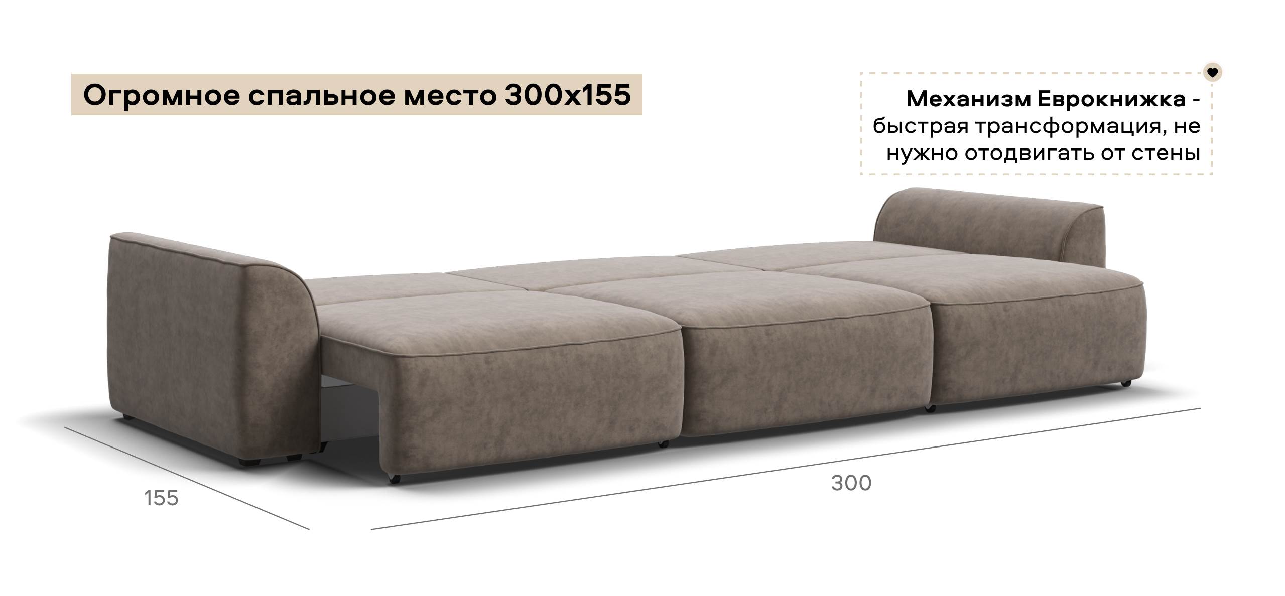 Приглашайте в гости большую компанию - диван вместит всех! Каждое посадочное место можно выдвинуть вперед и получить диван с правым или левым углом, а также получить П-образную форму дивана. А в разложенном виде диван превращается в огромное спальное место.