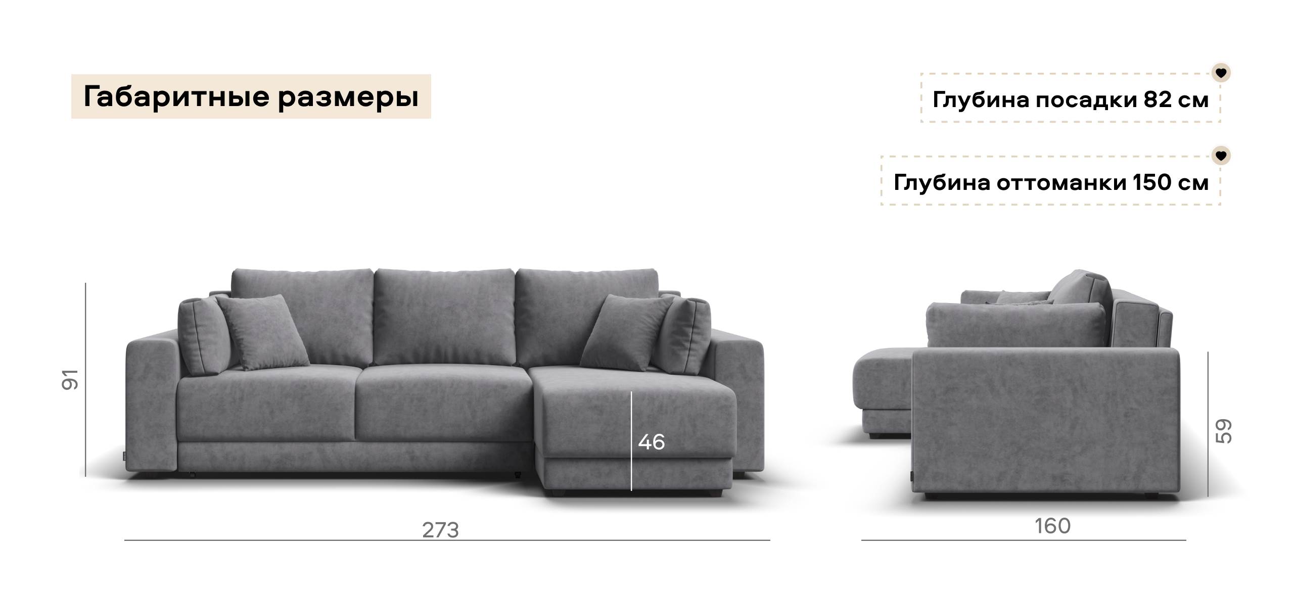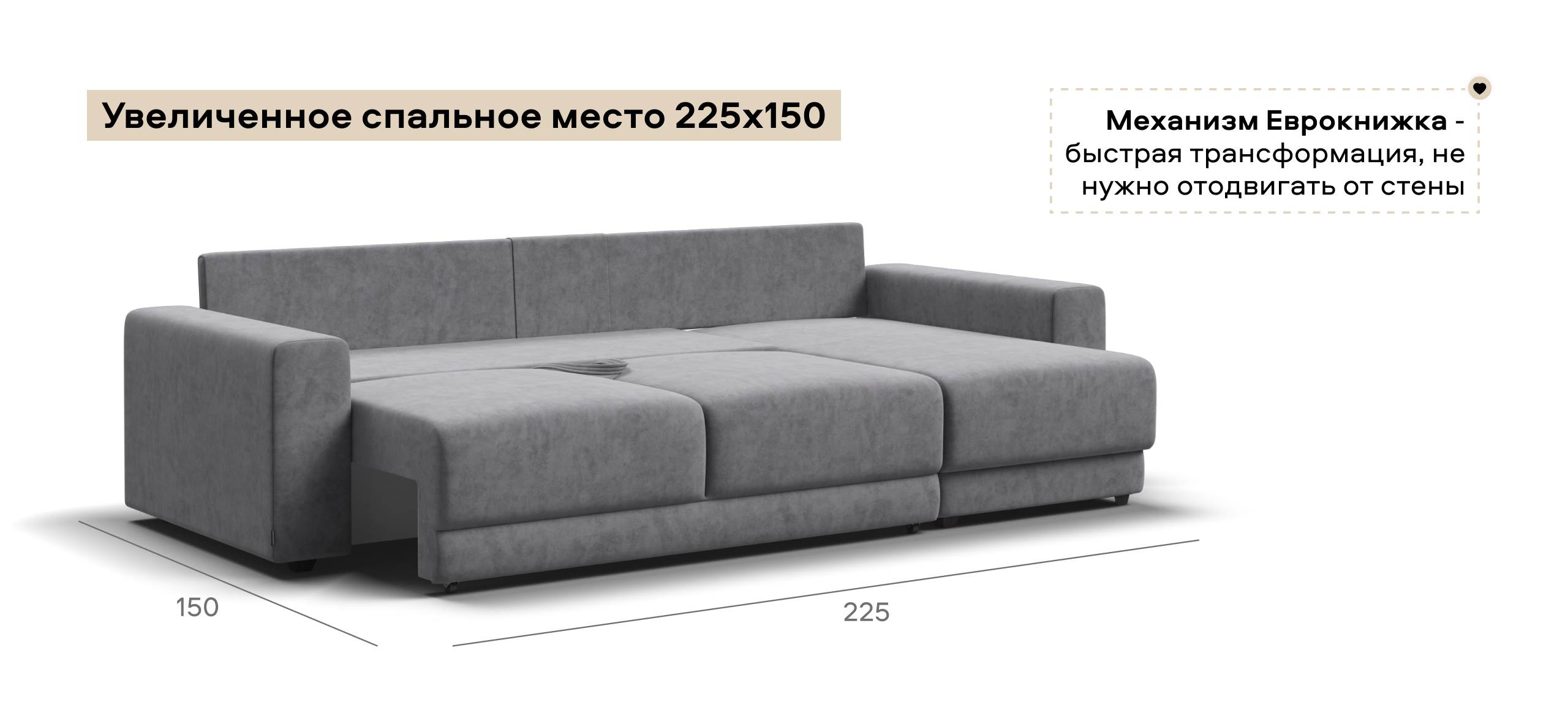 Оснащённый независимым пружинным блоком и высокоэластичной пеной Эластик Фоам с дополнительным слоем периотека, диван гарантирует анатомическую поддержку и комфортный сон. Простой и надёжный механизм трансформации «еврокнижка» позволяет легко преобразовать диван в просторное спальное место. Универсальный угол позволит Вам переставить оттоманку и поменять положение угла при необходимости.