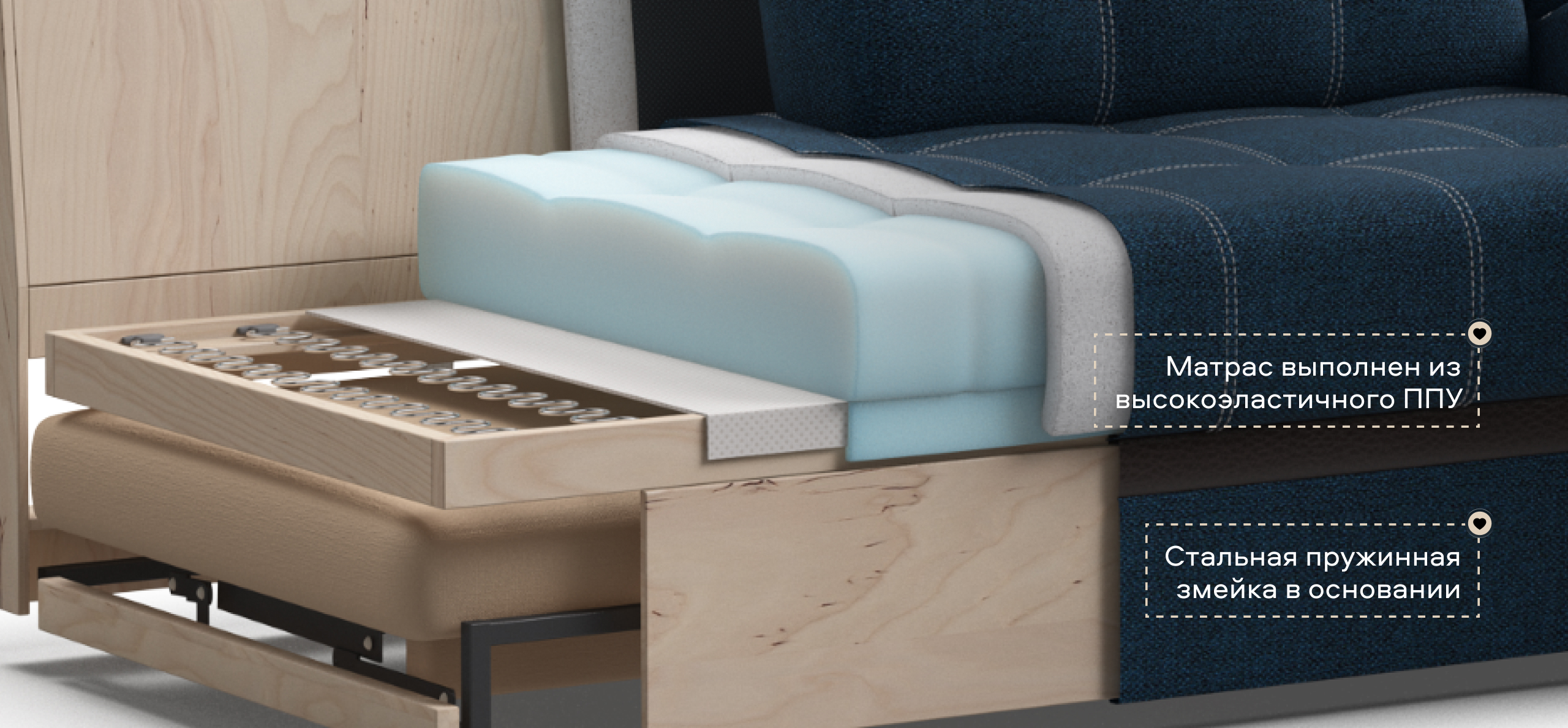 Модель оснащена прорезиненными колесиками, что обеспечит вам легкость раскладки и обезопасит от повреждений напольное покрытие. Не прилагая особых усилий, диван легко превратить в комфортную двуспальную кровать с идеально ровным спальным местом.